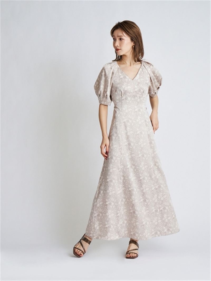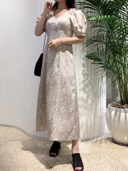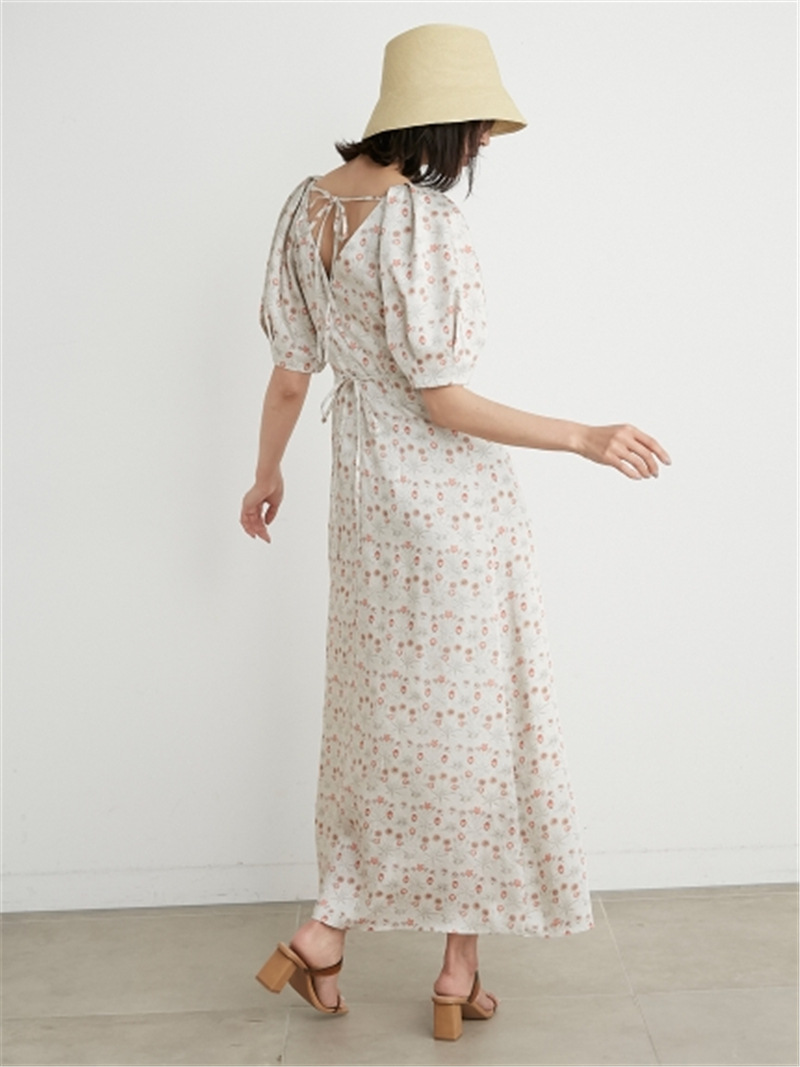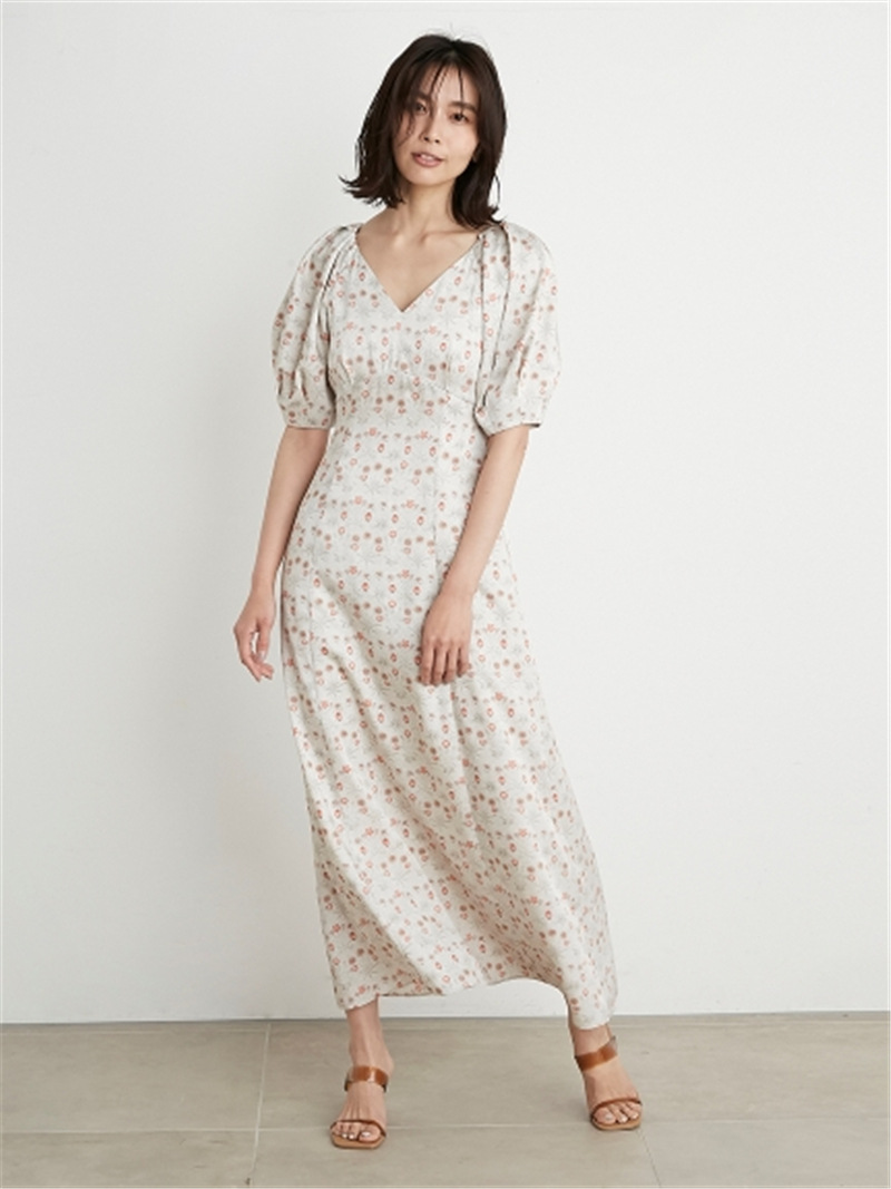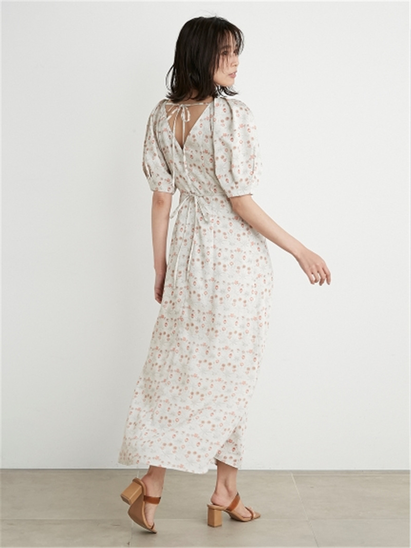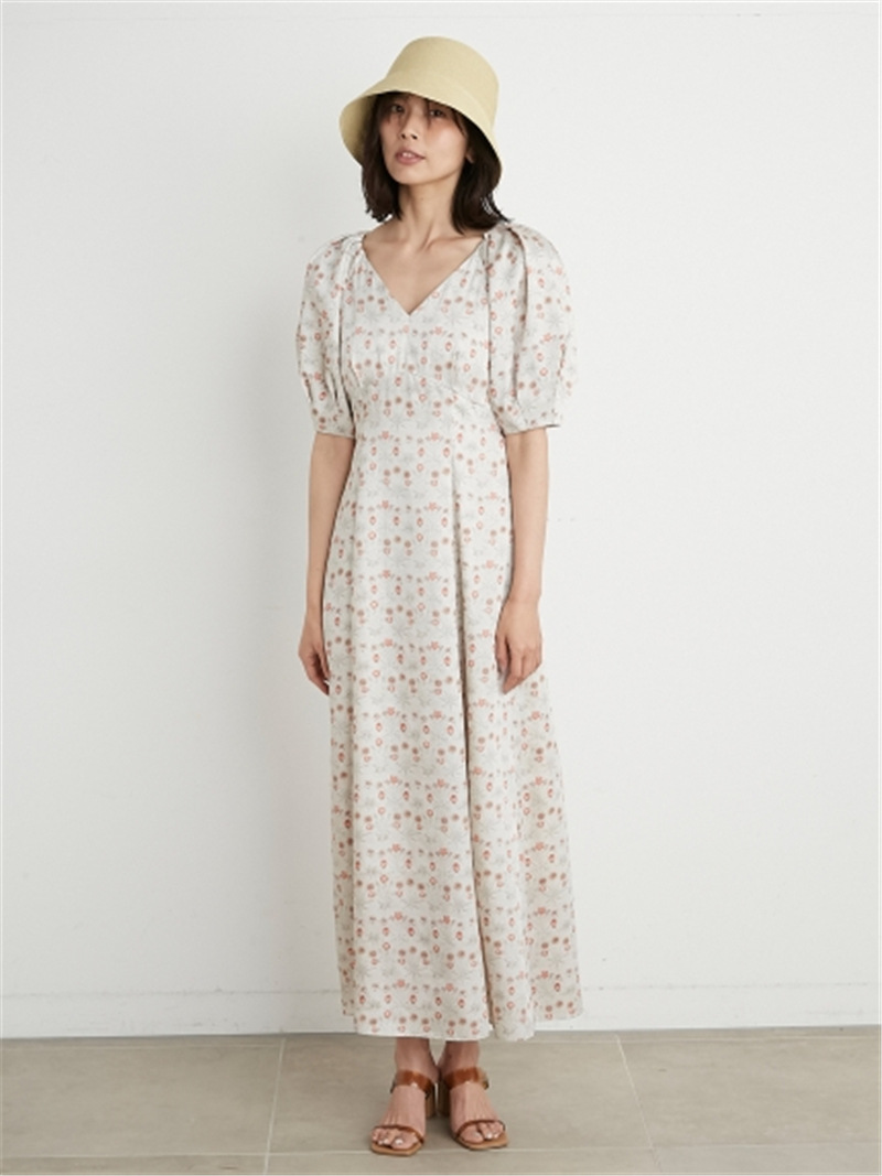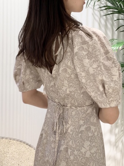 リサイクルポリエステル100%の、艶のあるツイル生地で仕立てたプリントワンピース。描いたパターンは、19世紀にデザイナーとして活躍した「WILLIAM MORRIS(ウィリアム モリス)」とのコラボレーション。有機的な植物モチーフの図案を採用しています。ラグランスリーブから深めのタックを取って立体感を出したボリュームスリーブが、デコルテラインを華奢に魅せ小顔効果も期待。バスト下にはパネル切り替えを施し、身体の線を美しく魅せるシルエットでスタイルアップを叶えます。ウエストにあしらったリボンは、調整が可能です。