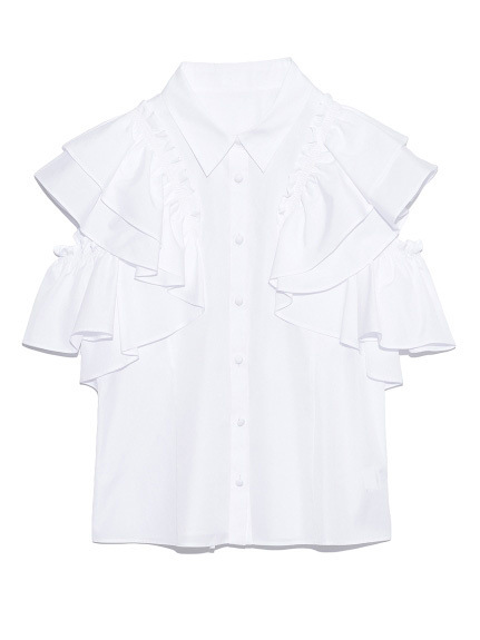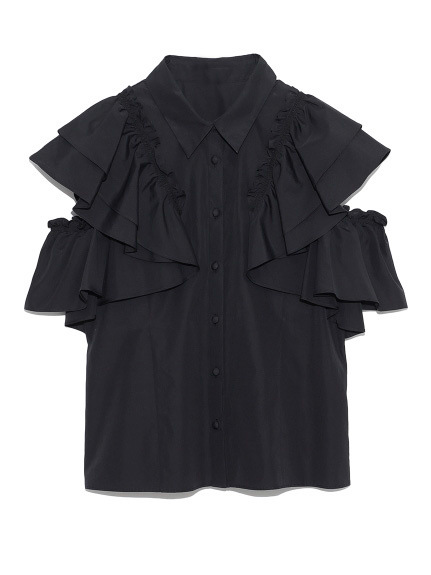2Way仕様のスリーブデザインが特徴で、肩からふんだんにあしらったボリューム袖として着るだけでなく、袖の1番下のフリルを少しおろすと、モードでヘルシーな肌見せのオフショルスリーブにシルエットの変化を楽しめます。