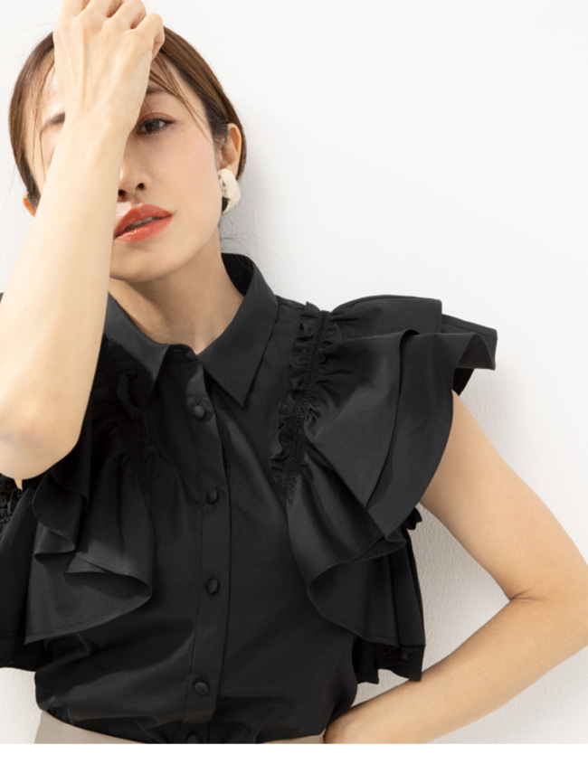 【やわらかで上品な光沢感と程よいハリ感のある上質なコットン素材を使用した華やかなラッフルスリーブブラウス】