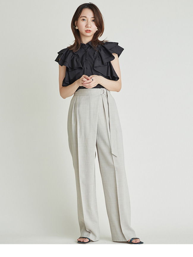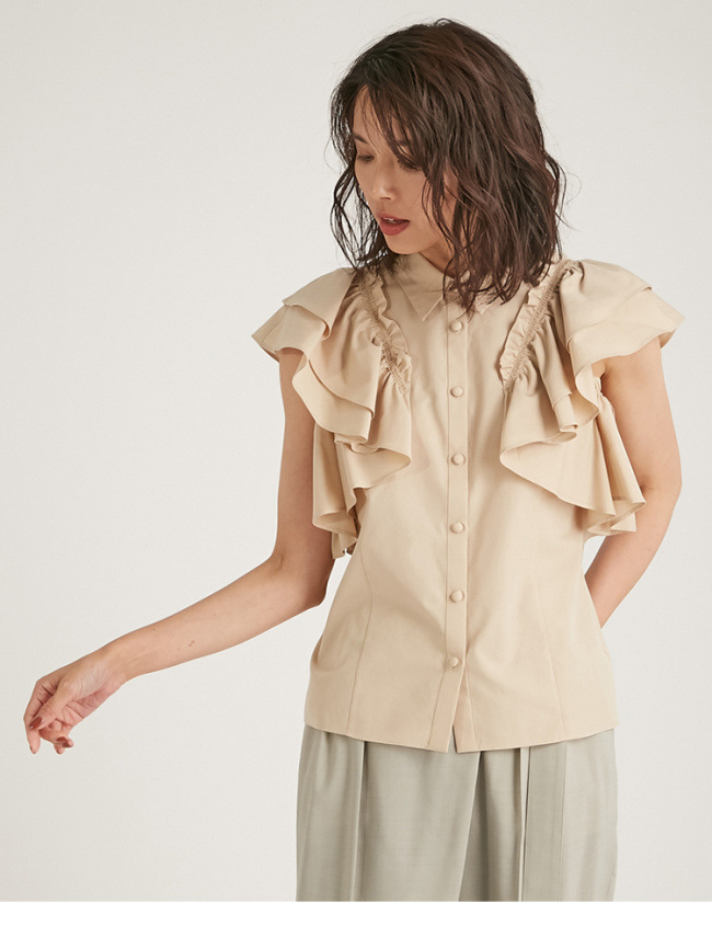 きちんと感のある襟付デザイン、フロントのくるみ釦、ギャザーたっぷりのフリルには同色のハシゴレースで奥行きのある表情を作り出し、立体的で女性らしいシルエットを1枚で表現。