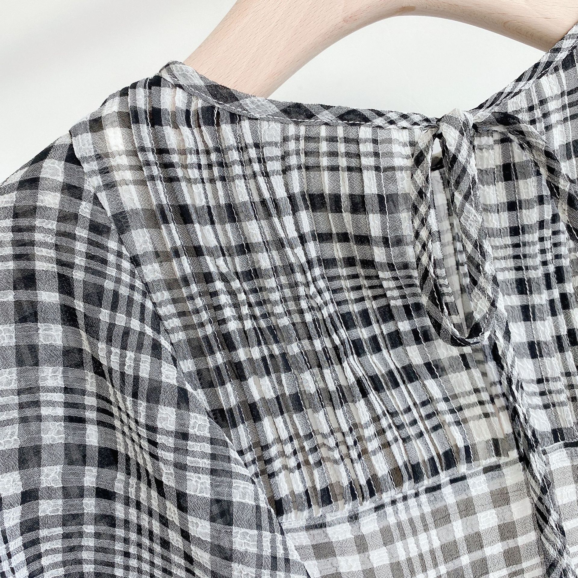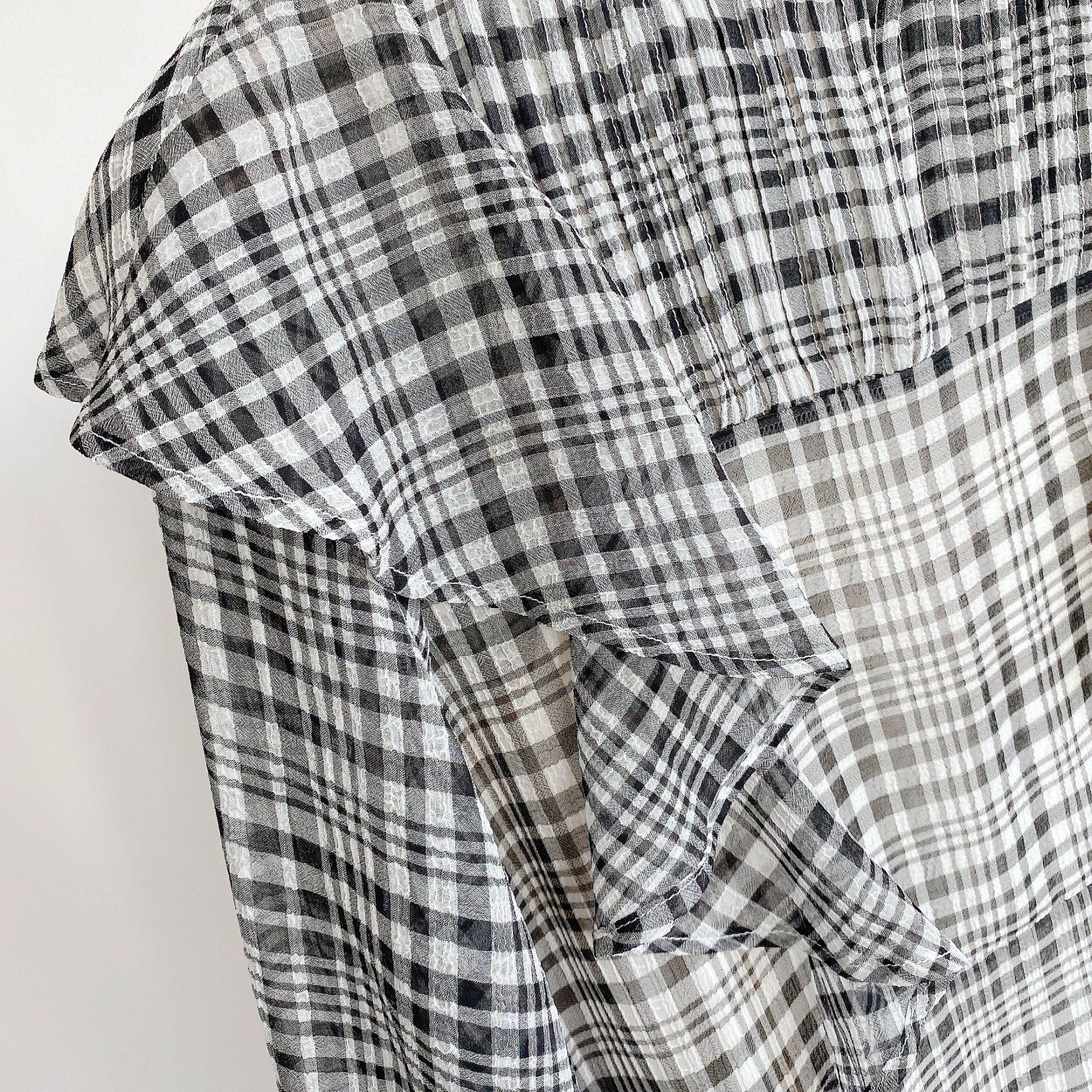 縦線の入ったジャガード見えのストライプ生地を使用したライトベージュとブラック、表面感のある生地を使用したチェックの、3色でお届けします。