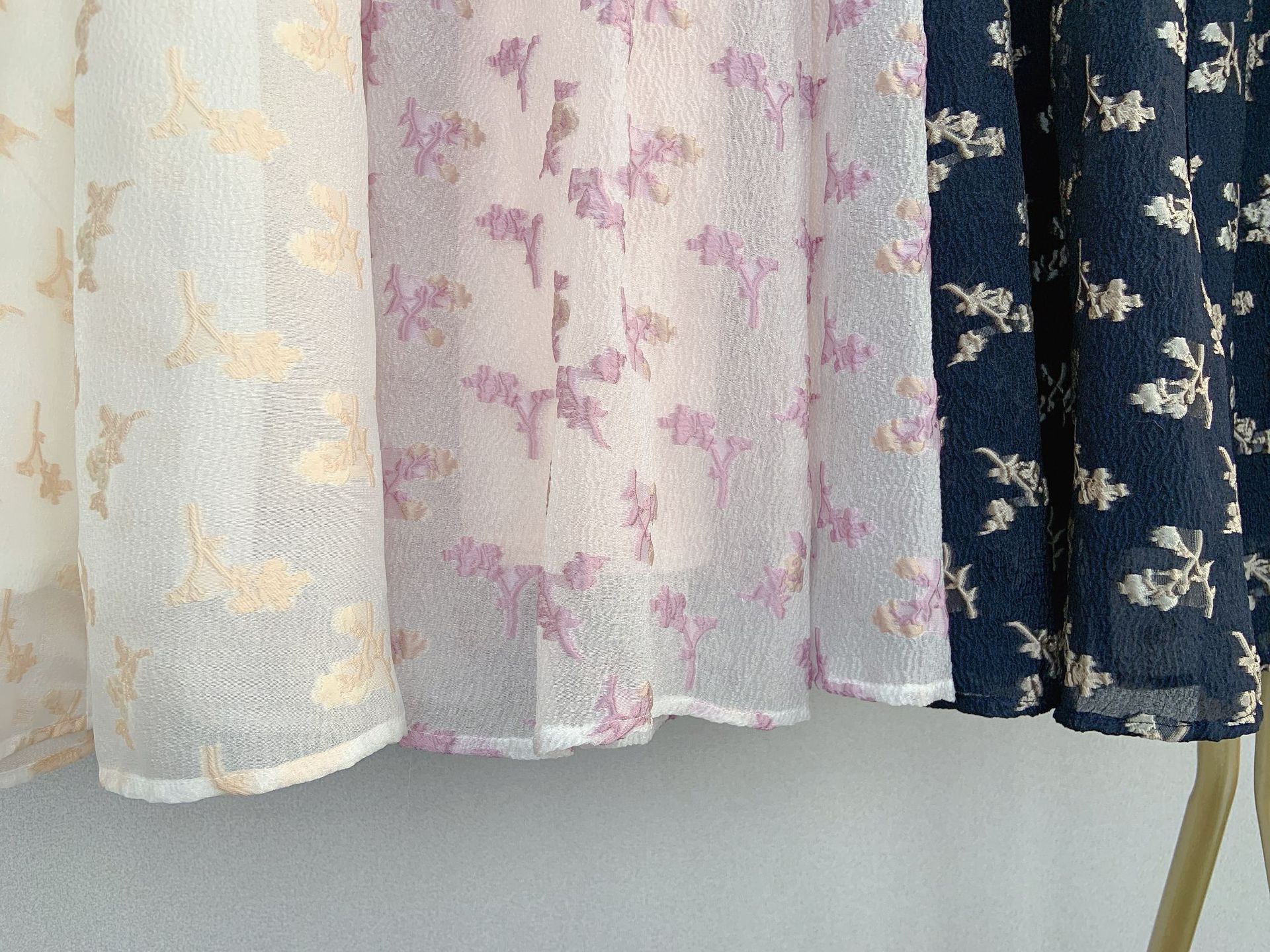 表面感のあるシアーなジャガード生地を使用しました。アイボリー、ラベンダー、ネイビーと、花刺繍の映える美しい3色をご用意しました。