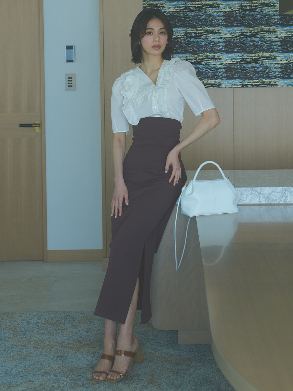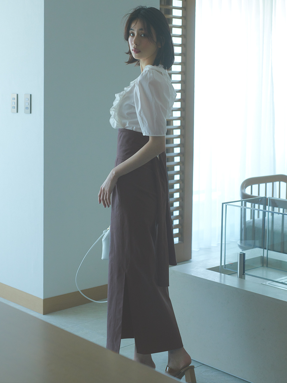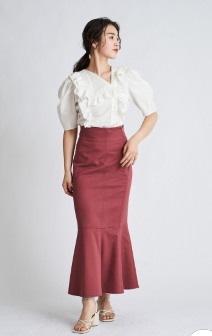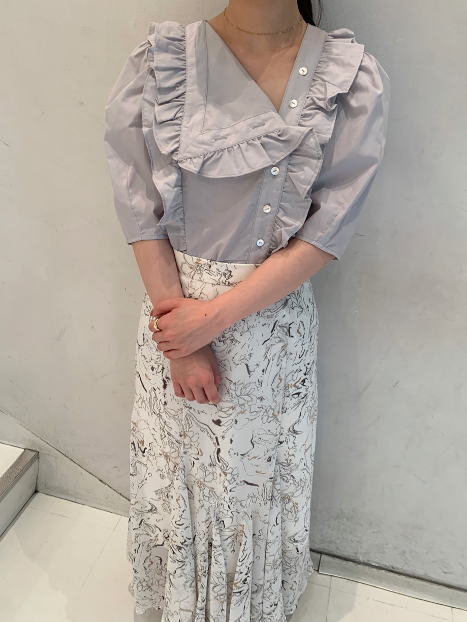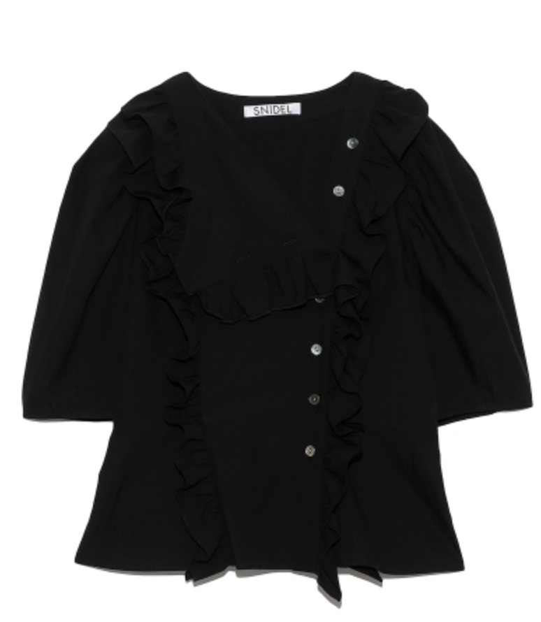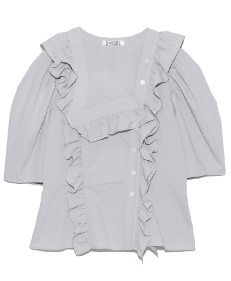今シーズントレンドのビックカラーを、アシンメトリーに変形させたデザインブラウス。ふんだんにあしらったフリルやボリュームのあるパフスリーブで、「SNIDEL」らしい大人の甘さを演出しました。モードな雰囲気とフェミニンさのバランスを意識した、照れずに着ていただける感度の高さが魅力です。マーメイドスカートやパンツなど、シックなアイテムとのスタイリングがおすすめ。