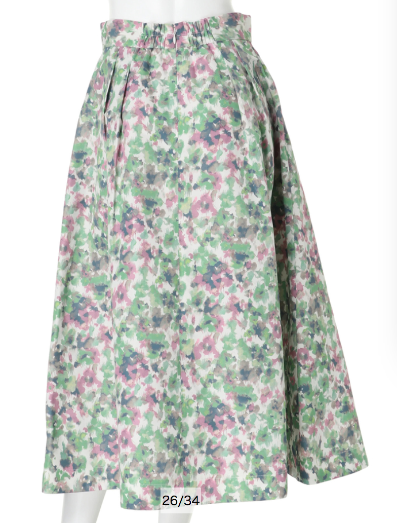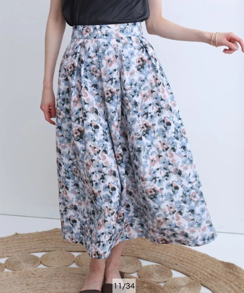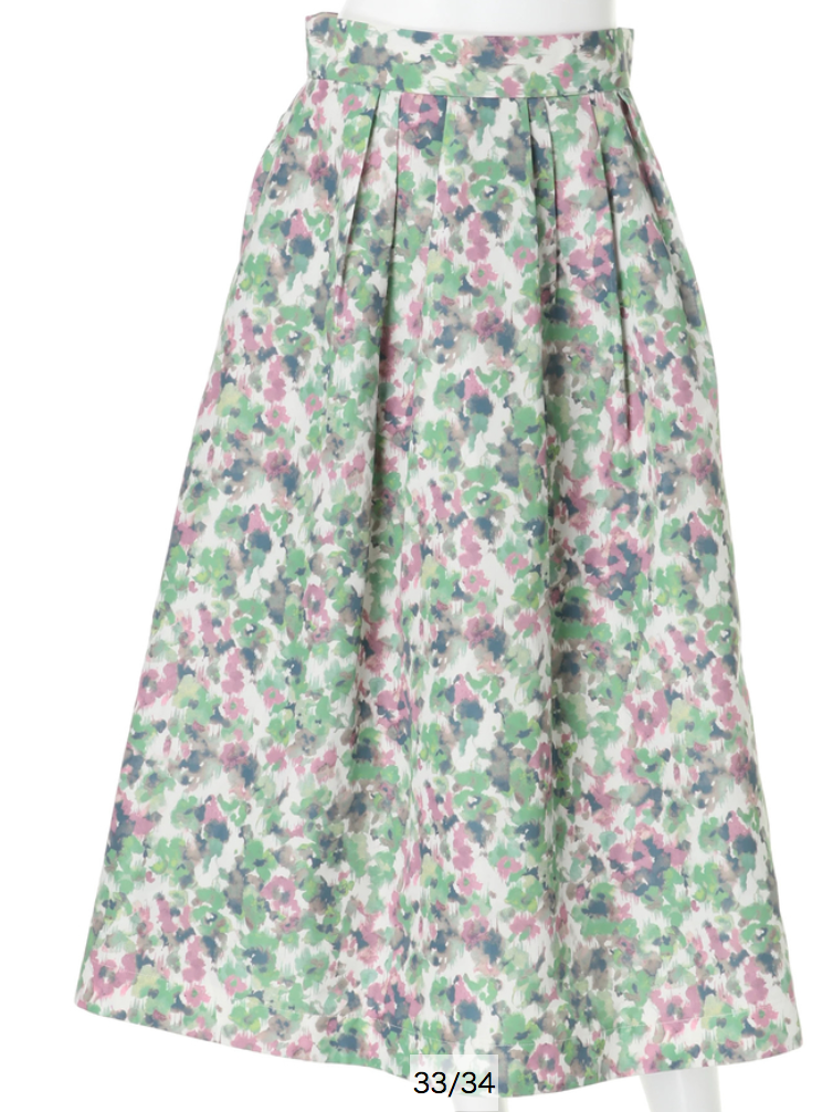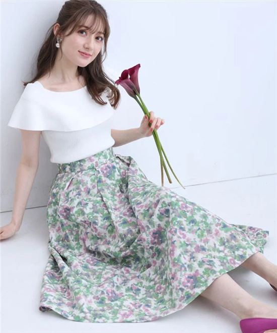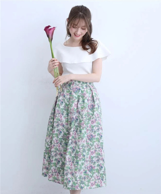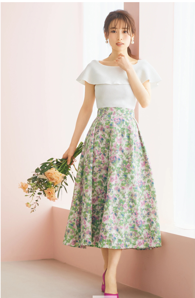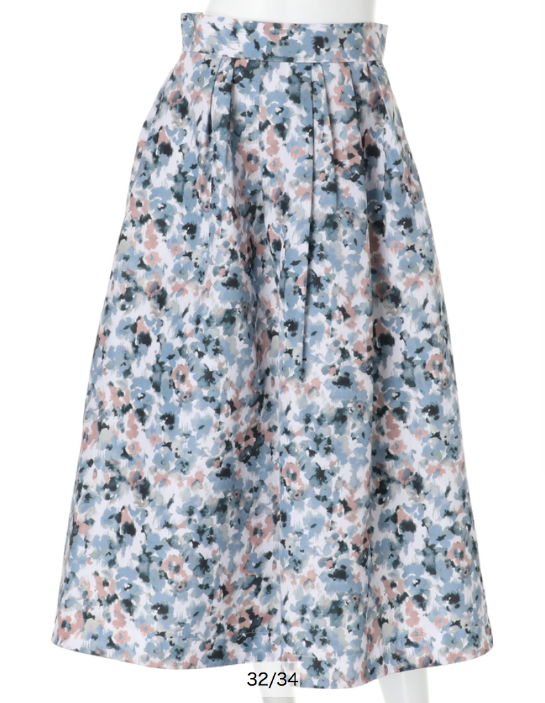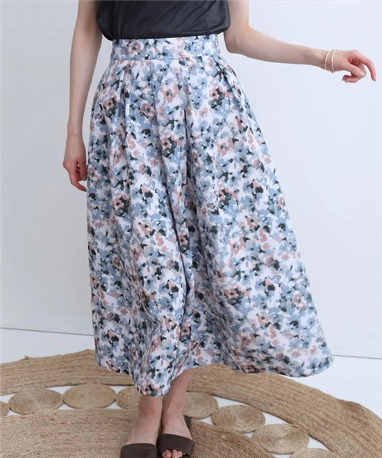 ぼかしフラワーの柔らかな風合いが、優しげな女性らしい表情を演出するスカート。