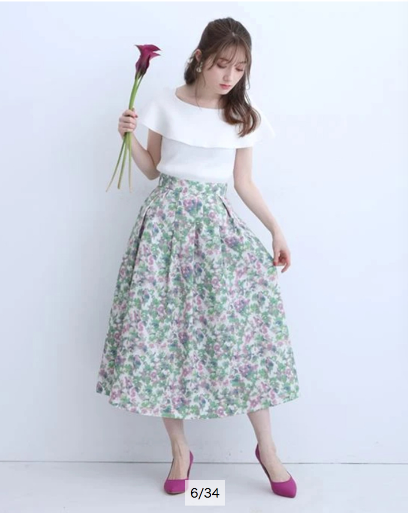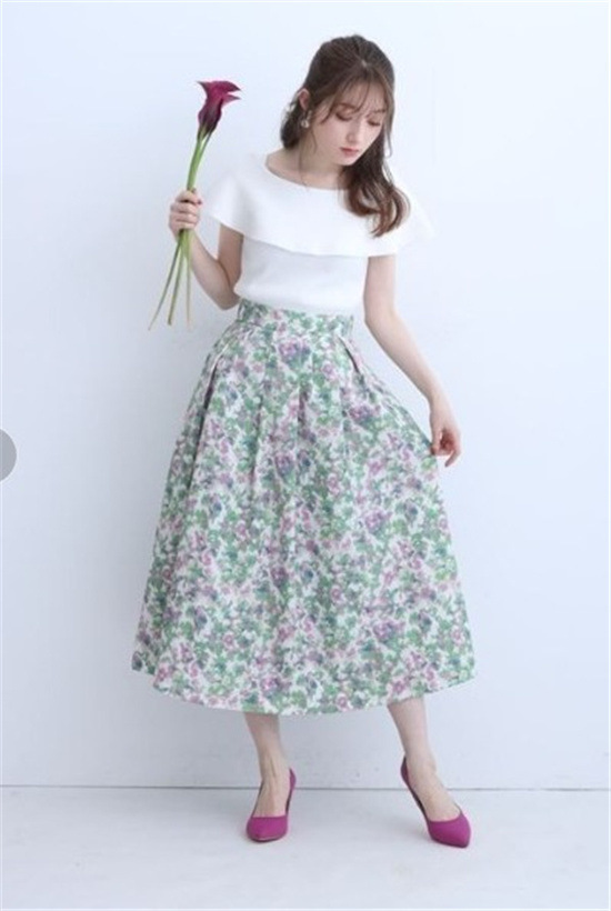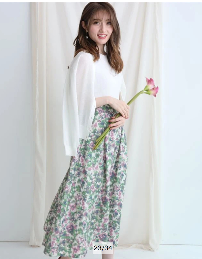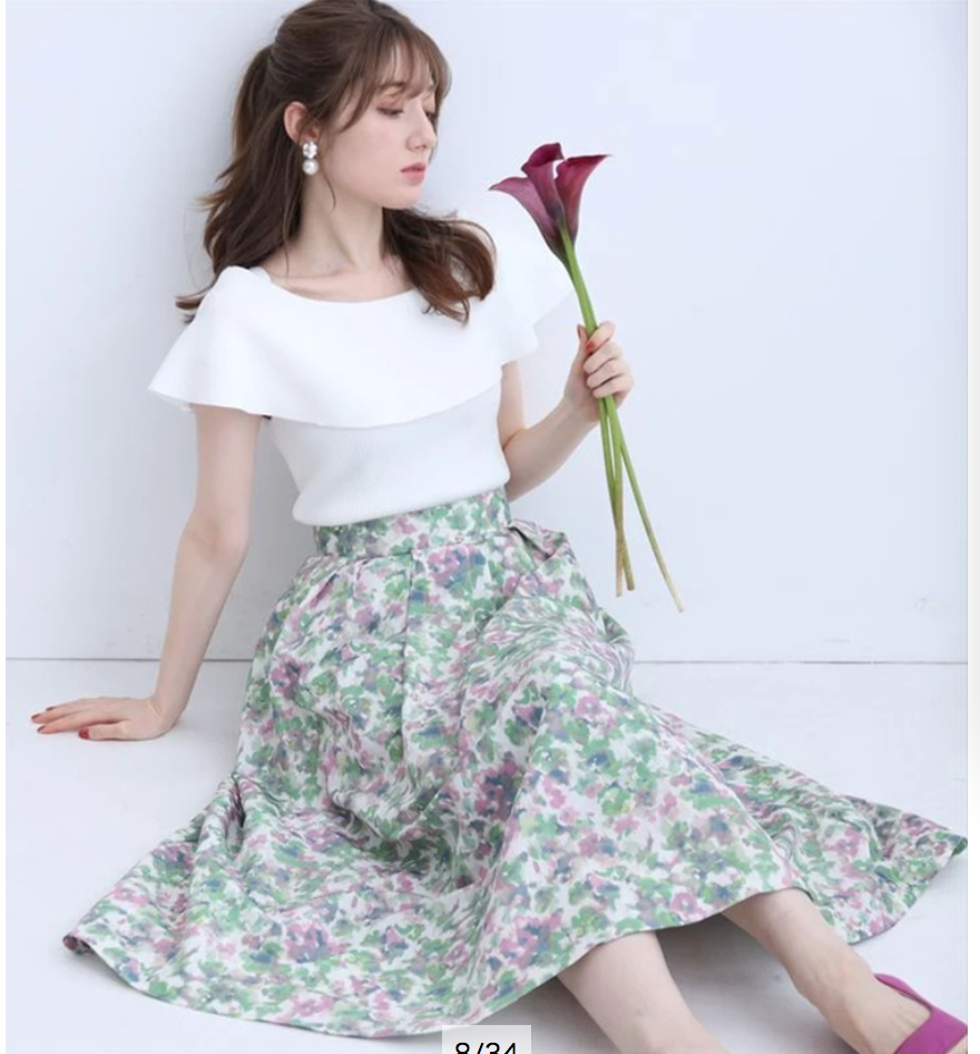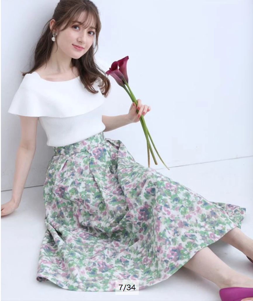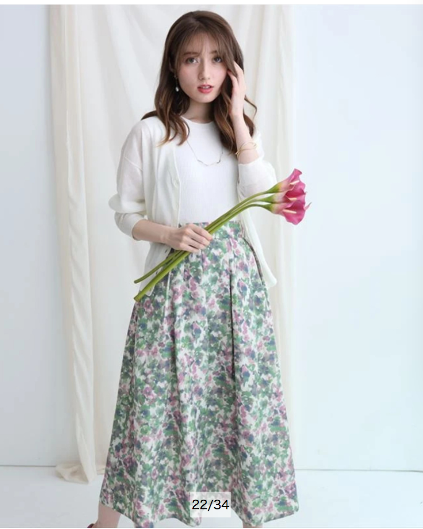 ぼかしフラワーの柔らかな風合いが、優しげな女性らしい表情を演出するスカート。
