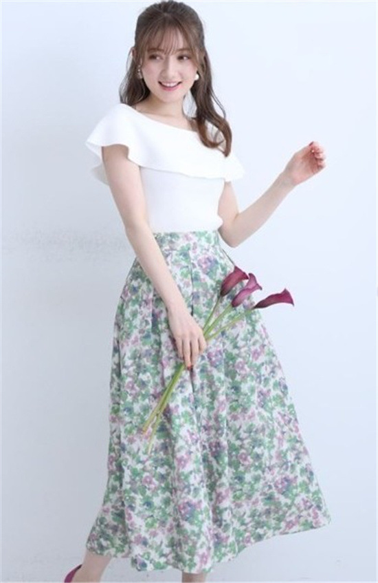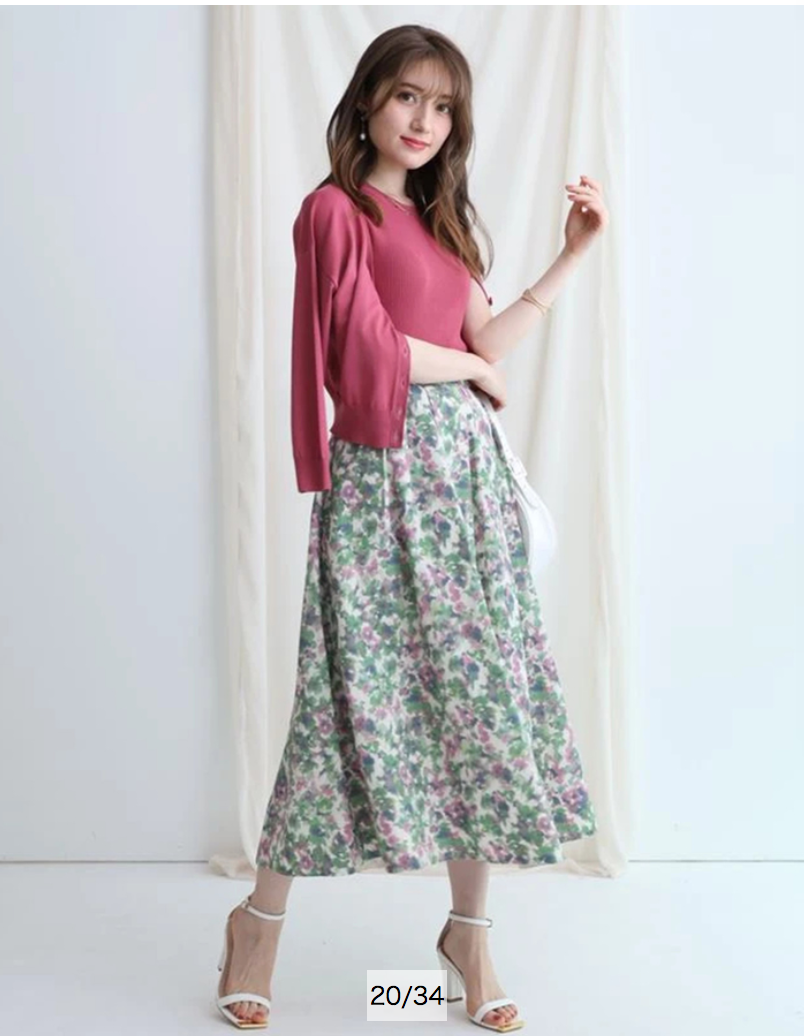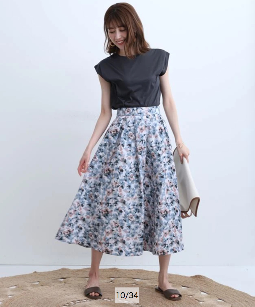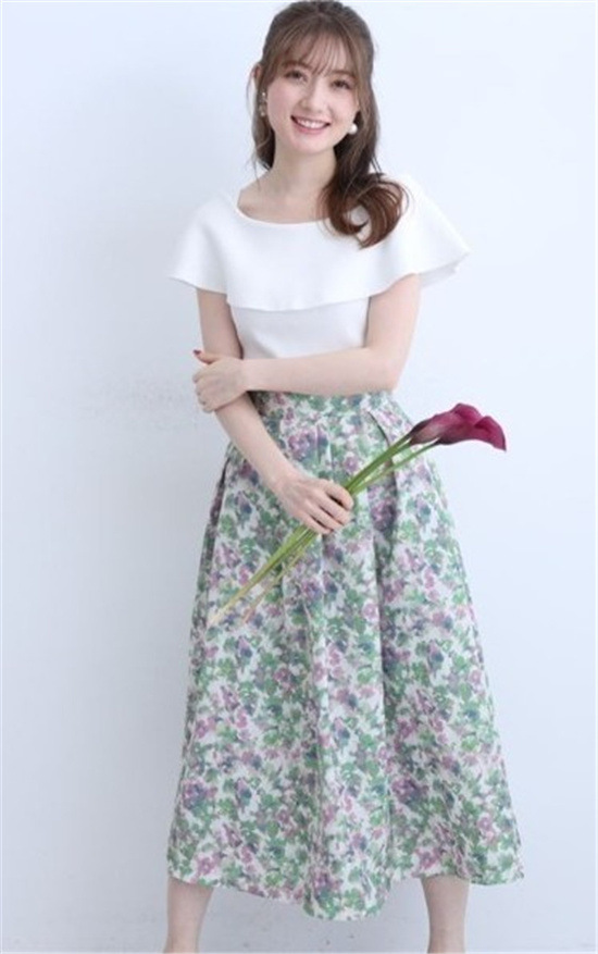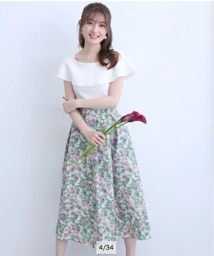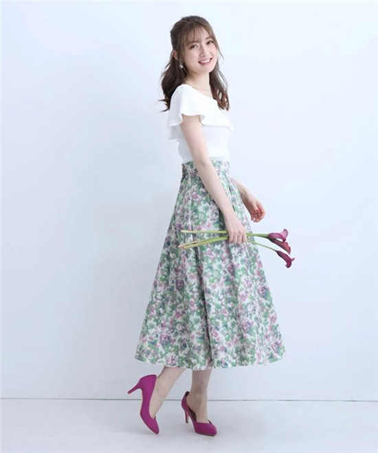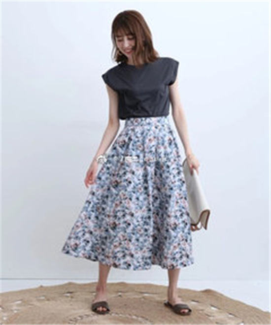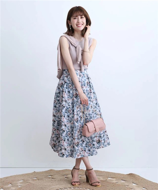 ぼかしフラワーの柔らかな風合いが、優しげな女性らしい表情を演出するスカート。