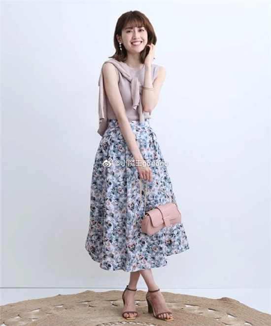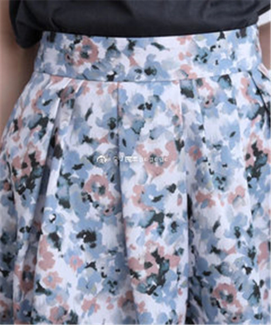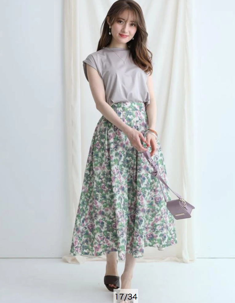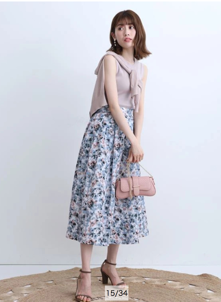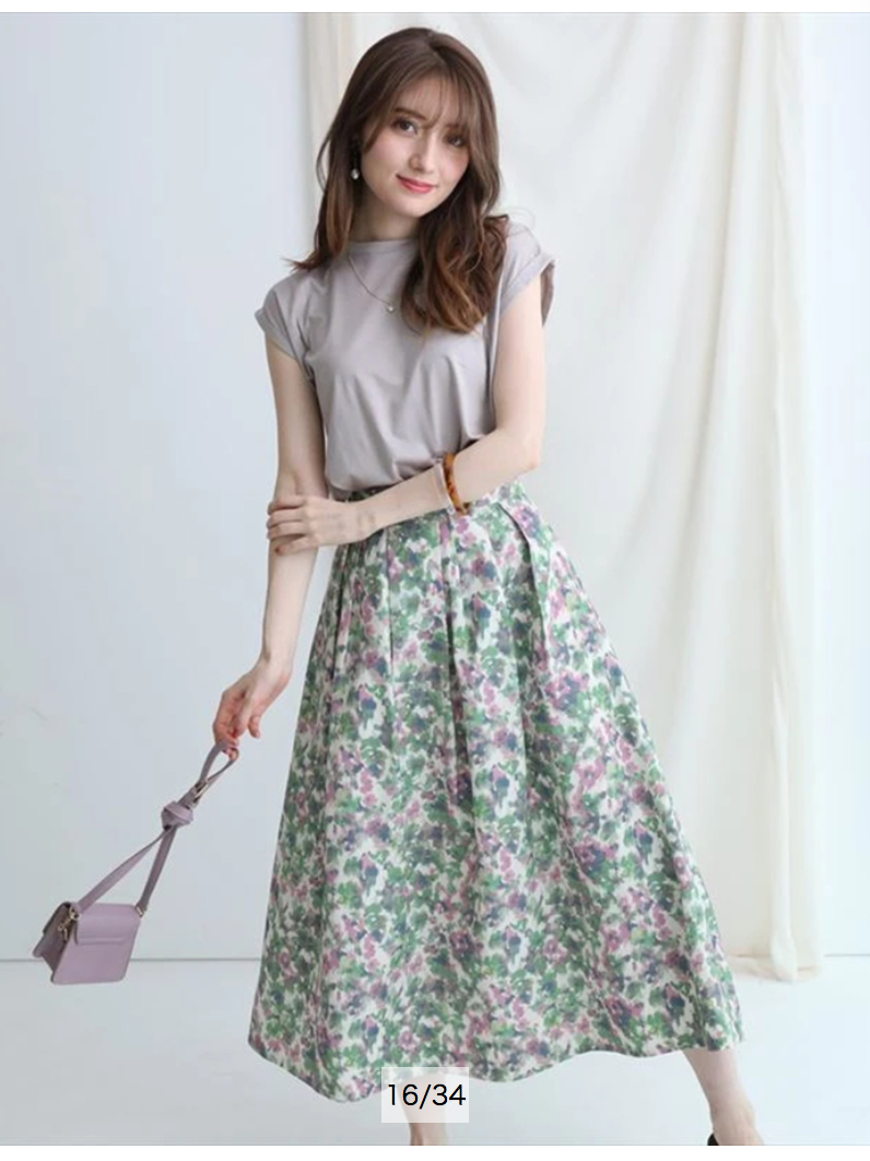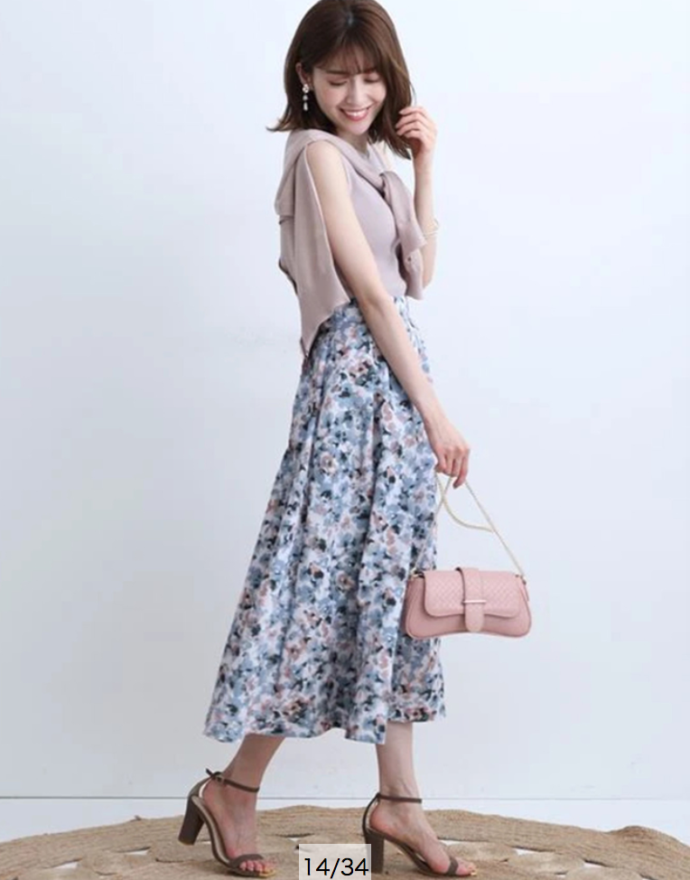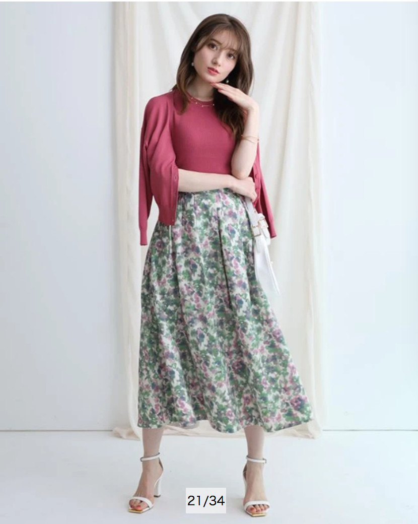 ぼかしフラワーの柔らかな風合いが、優しげな女性らしい表情を演出するスカート。