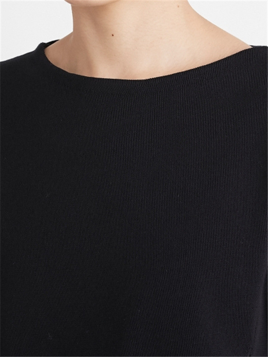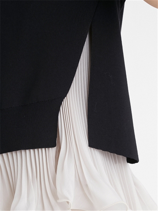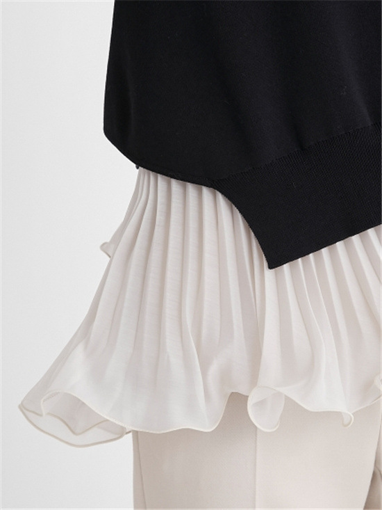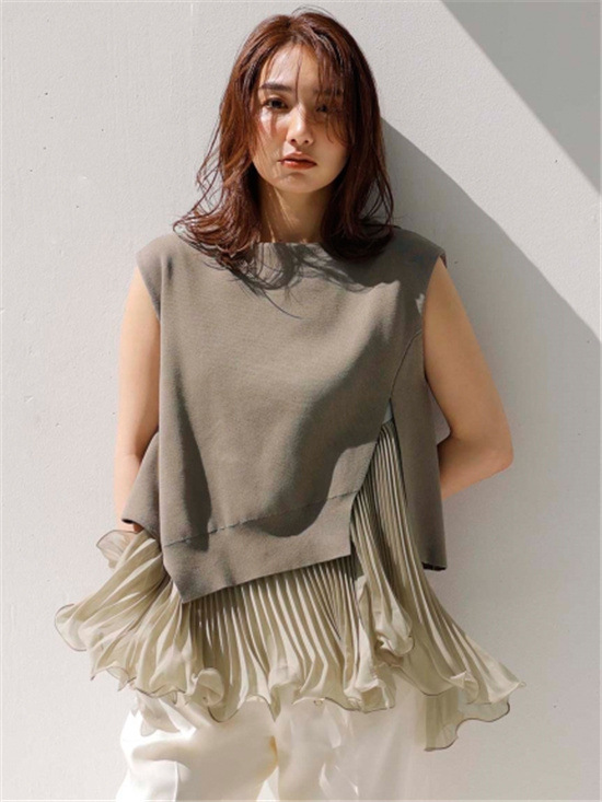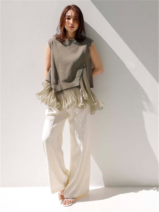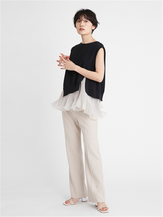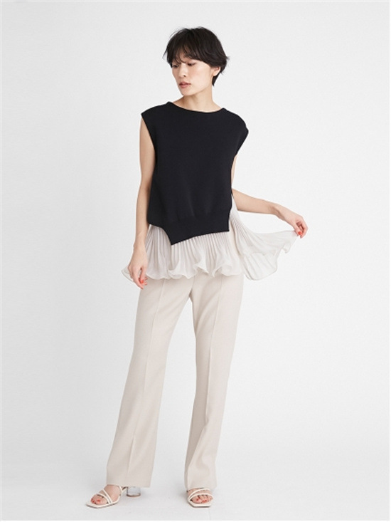 細やかなプリーツ加工をあしらった清涼感のあるスラブ調オーガンジーフリルのインナーと、アシンメトリーの大胆なスリット開きのニットを重ね着して完成するセットアイテムです。