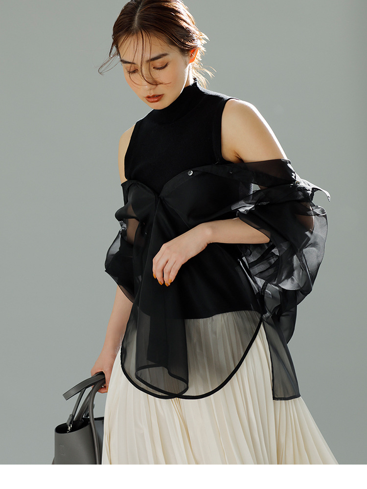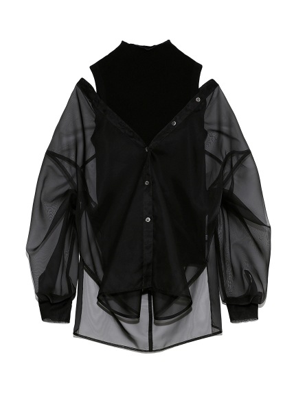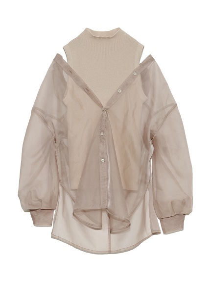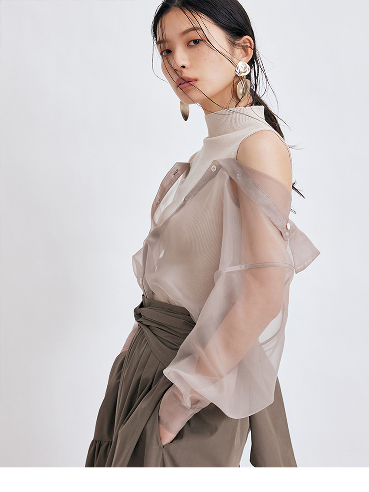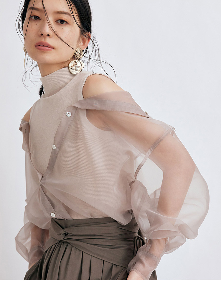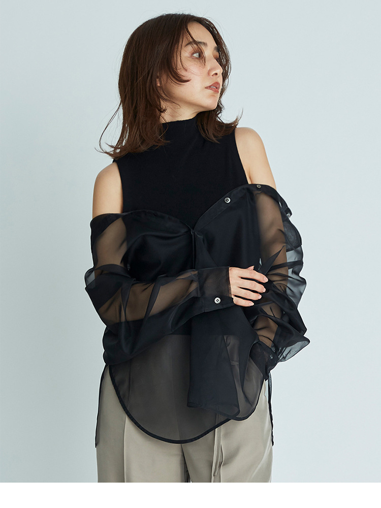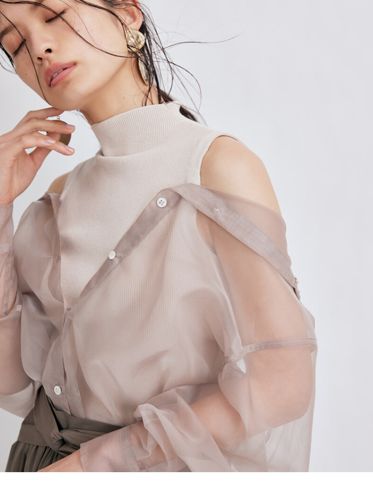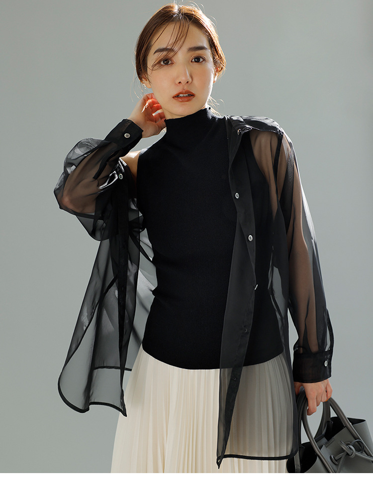 【別々でも使えるシンプルなボトルネックニットとシアーシャツのレイヤードアイテム】