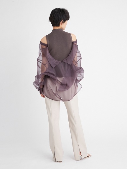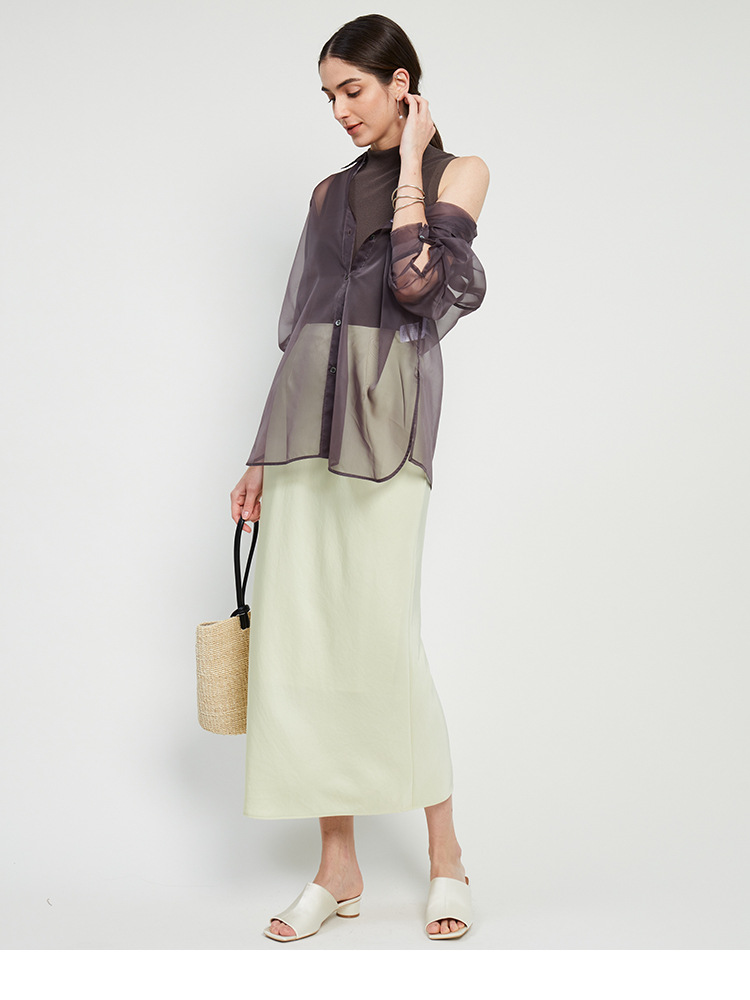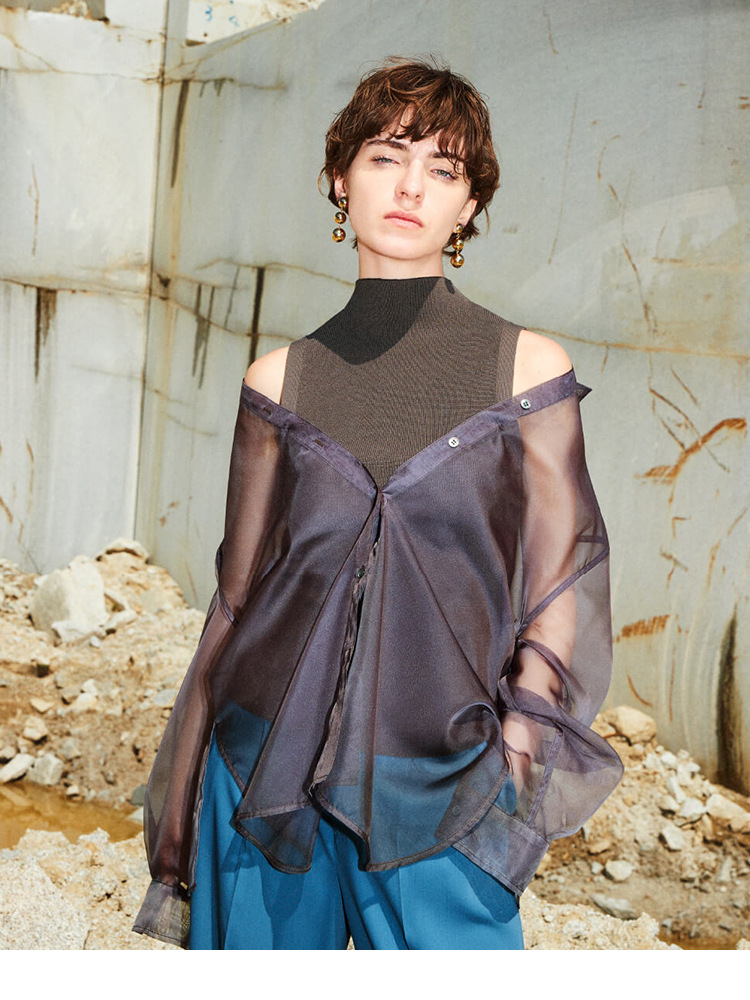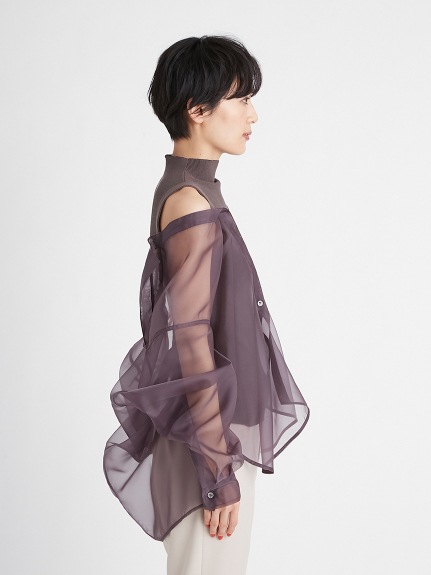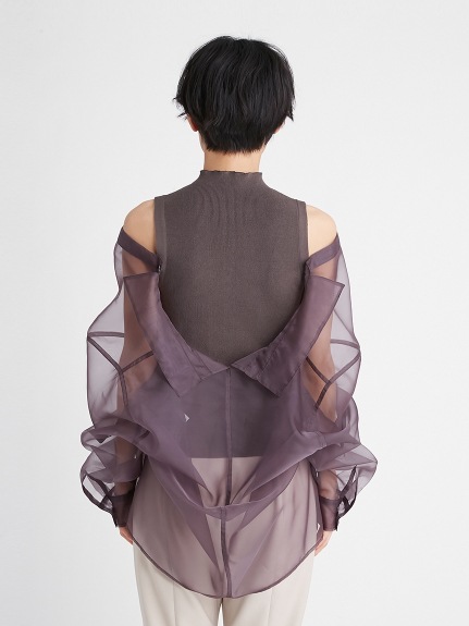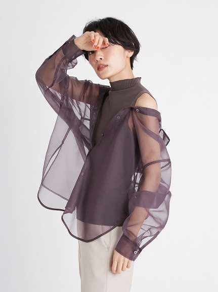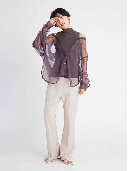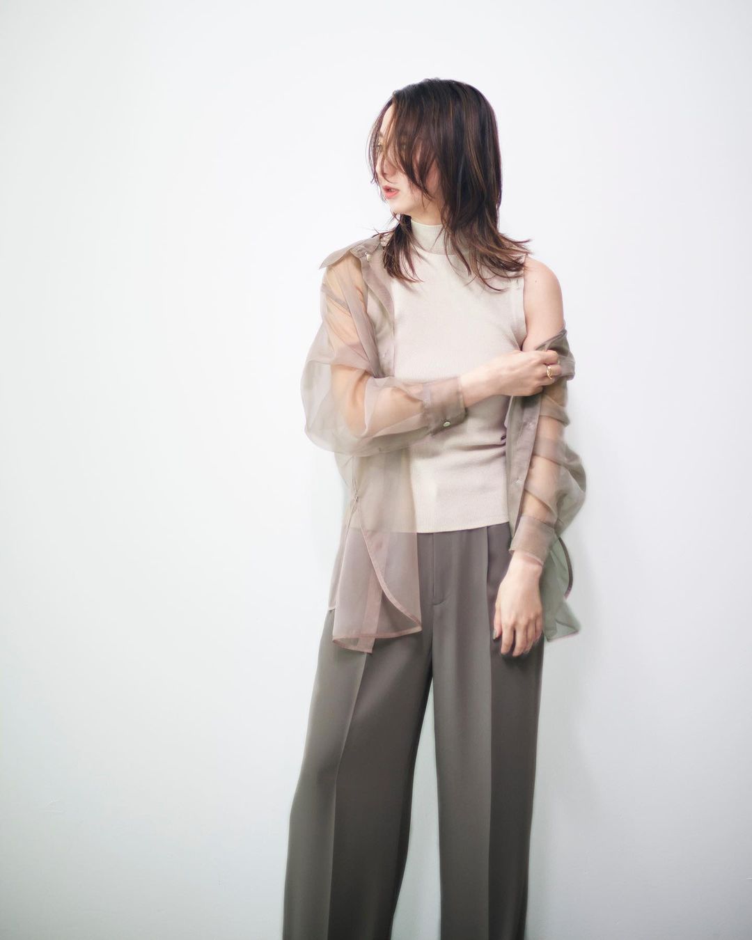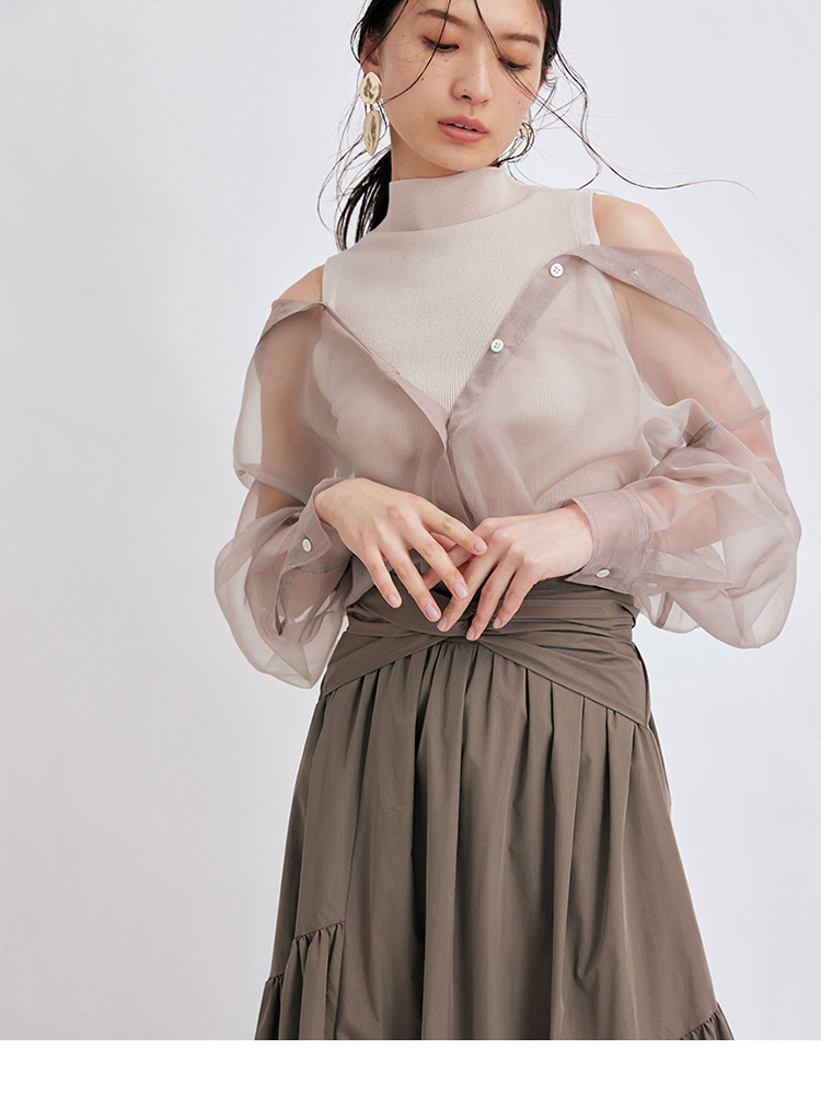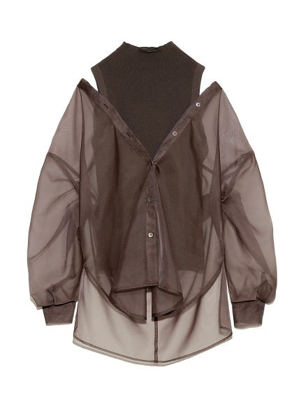 【別々でも使えるシンプルなボトルネックニットとシアーシャツのレイヤードアイテム】
