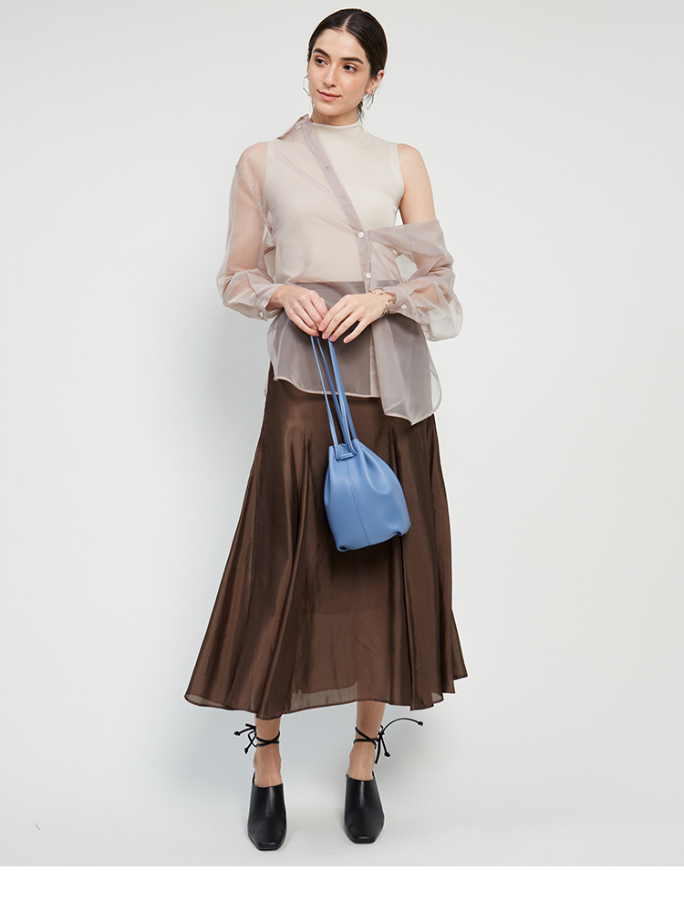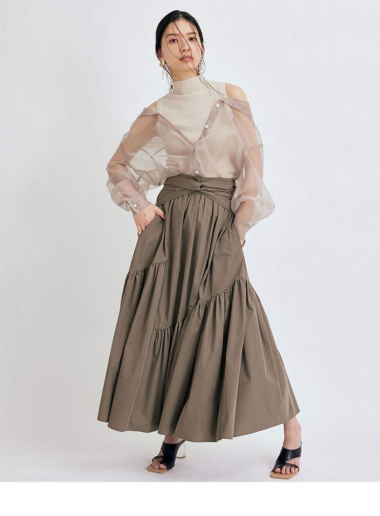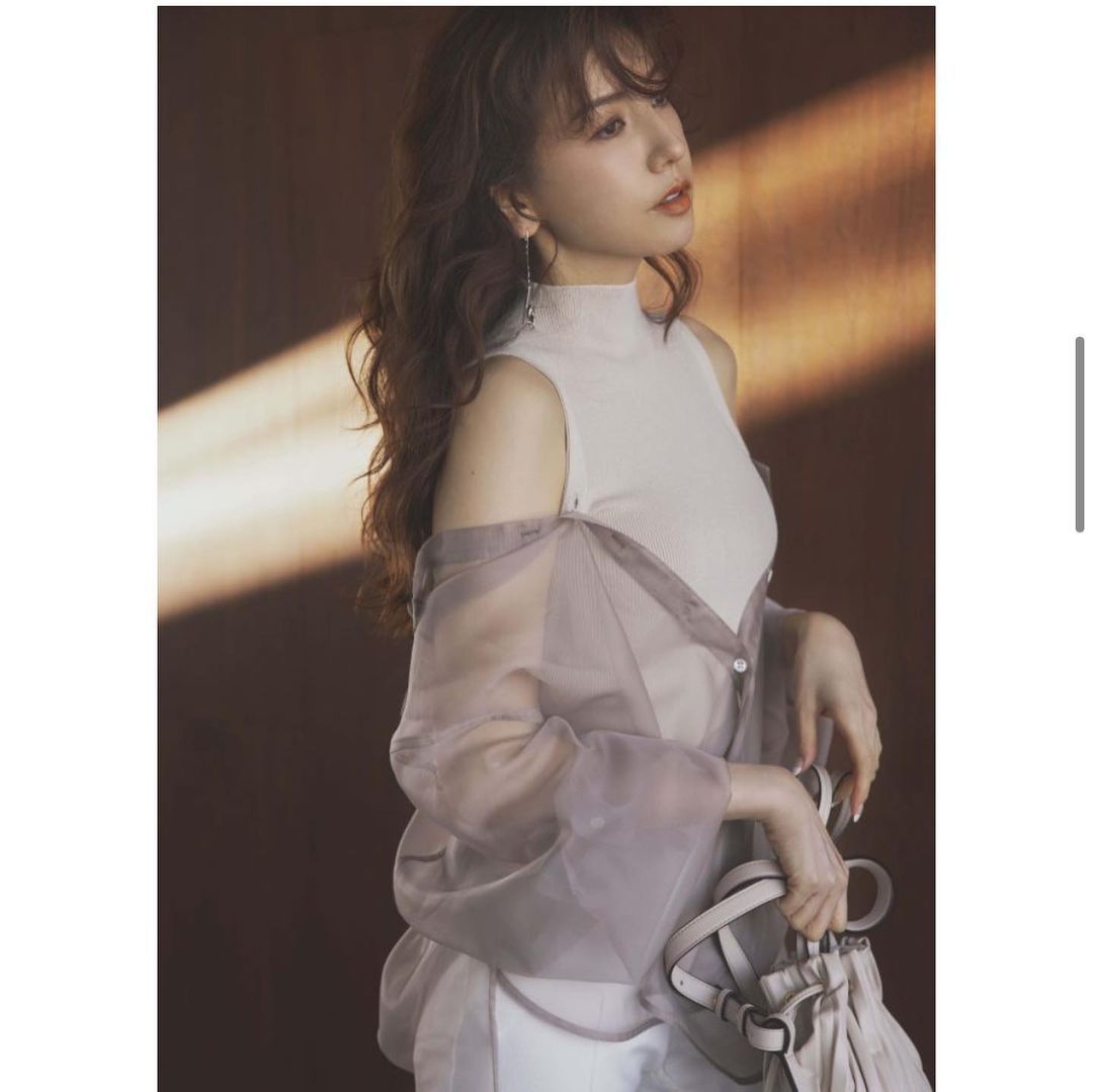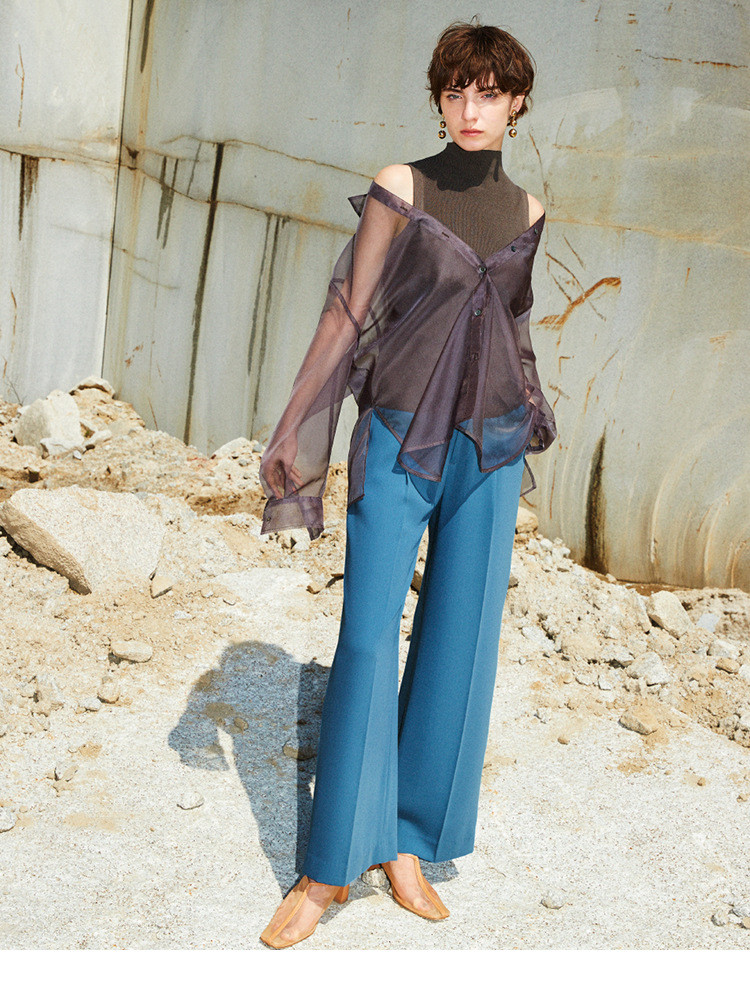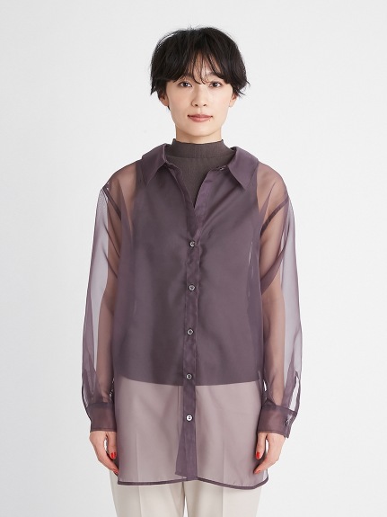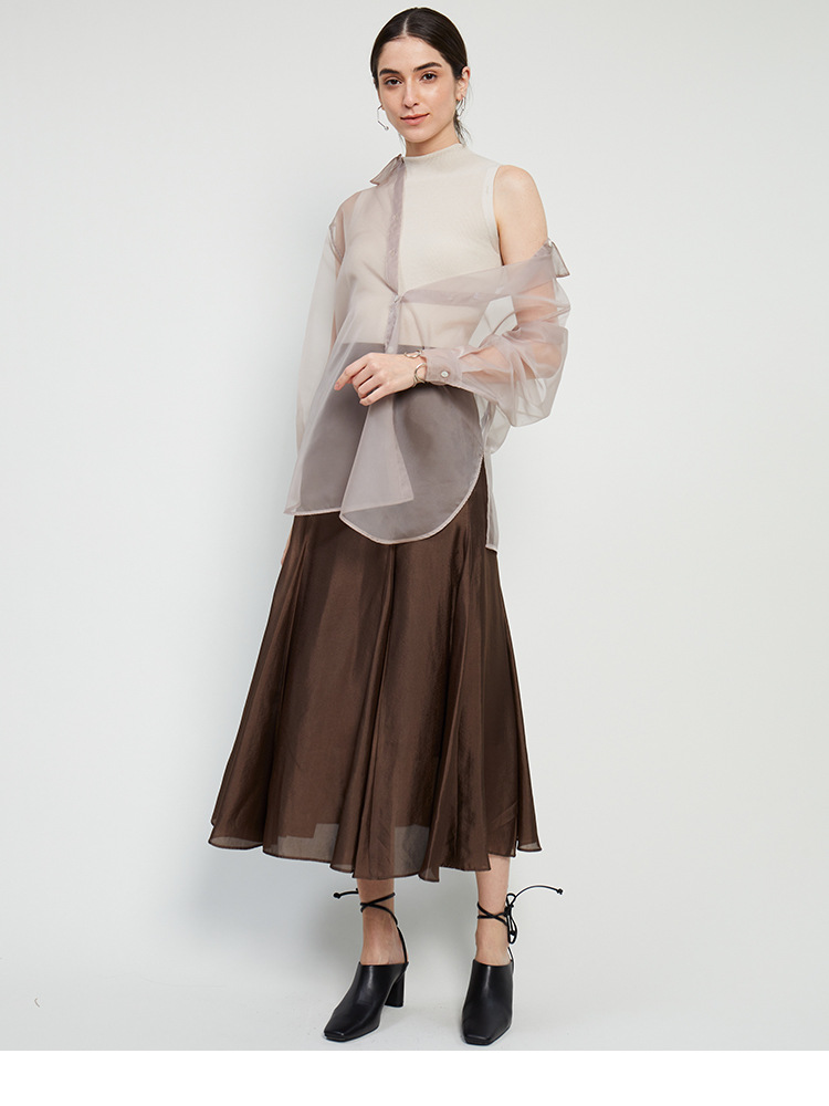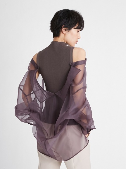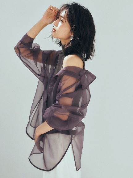 【別々でも使えるシンプルなボトルネックニットとシアーシャツのレイヤードアイテム】