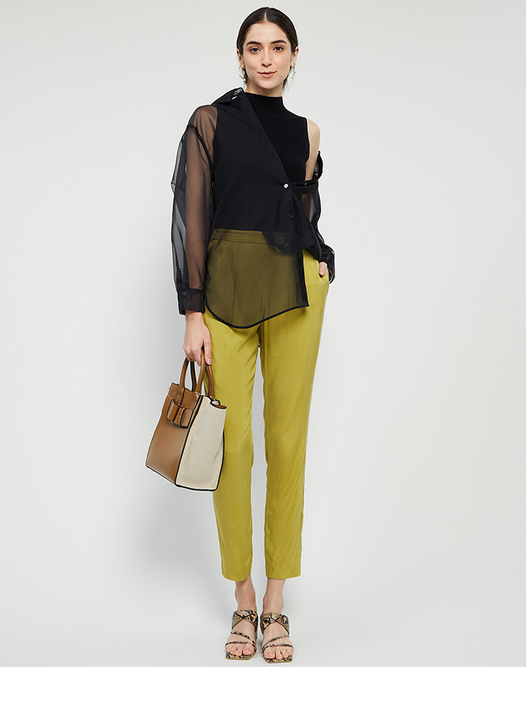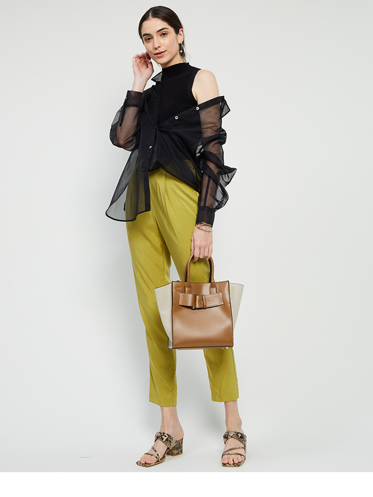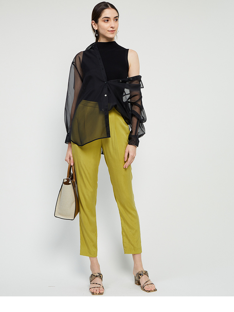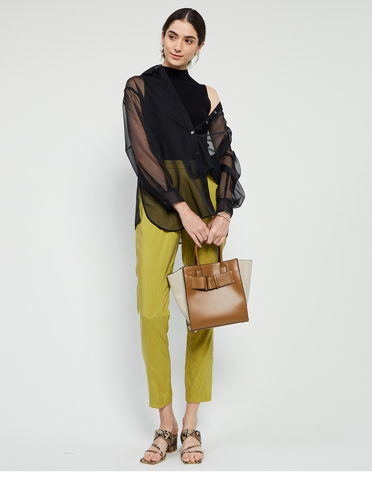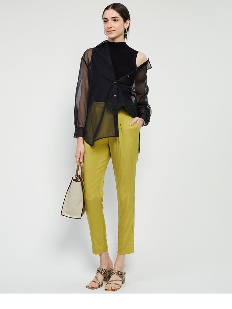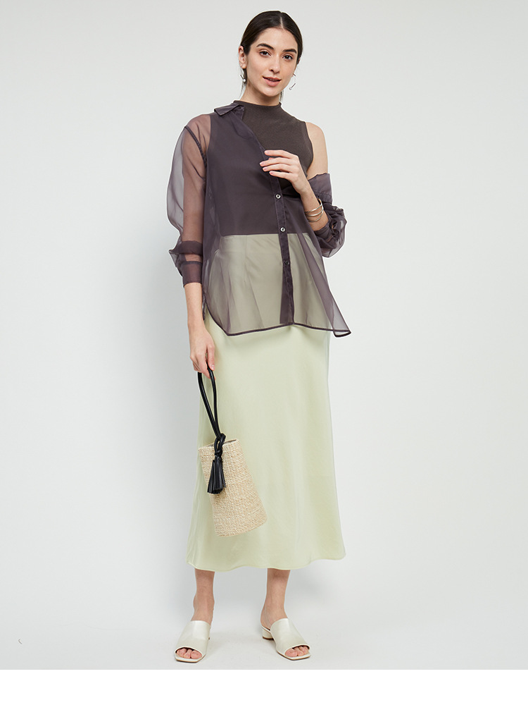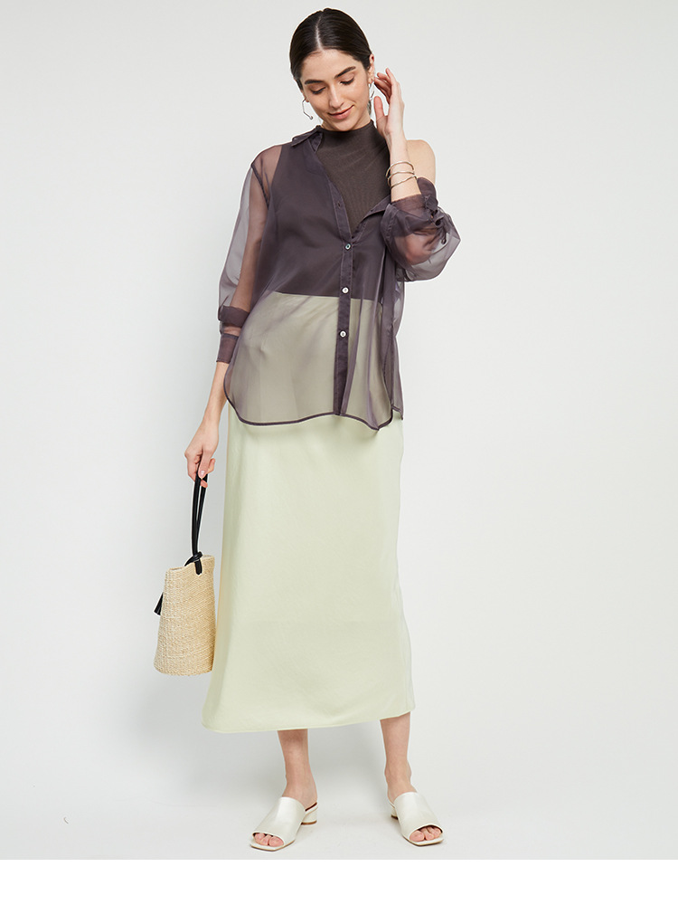 【別々でも使えるシンプルなボトルネックニットとシアーシャツのレイヤードアイテム】