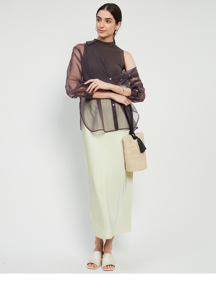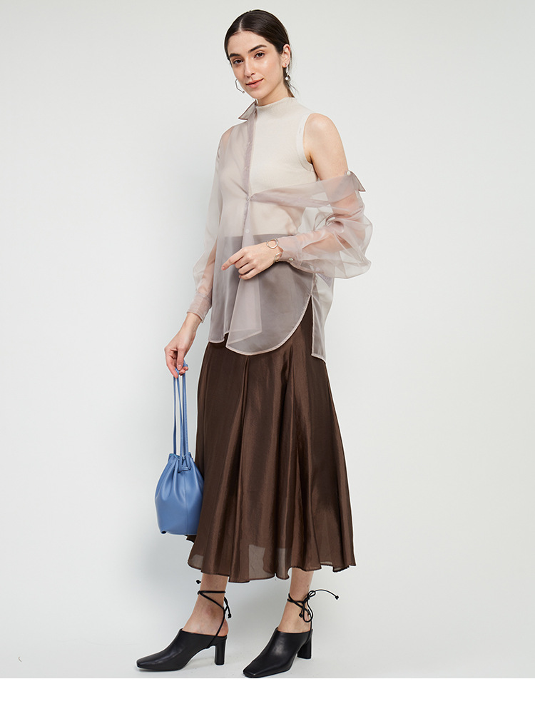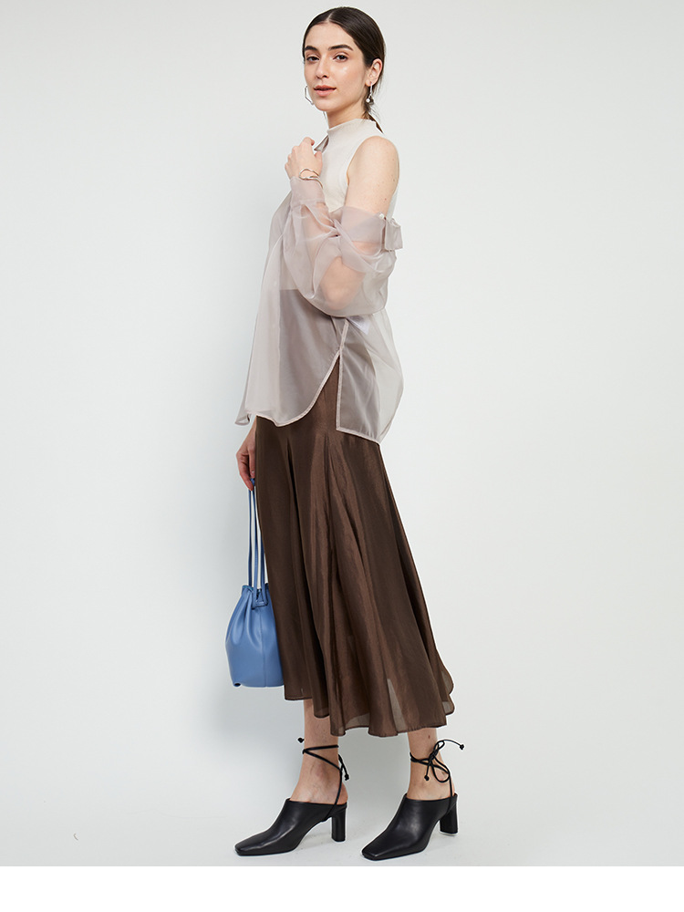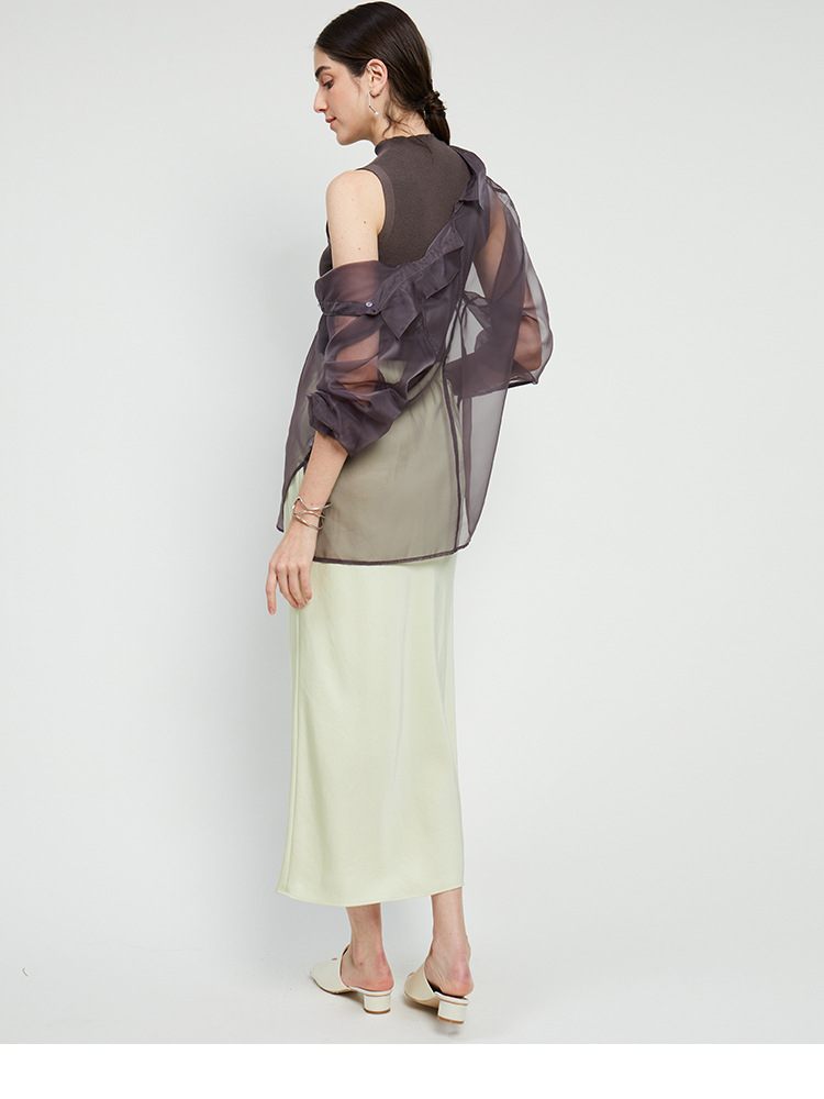 ノースリーブニットとマットな艶がきれいなオーガンジーシャツをワントーンで揃えたデザインで、自由にレイヤードスタイルを楽しむことができるセットアイテムです。