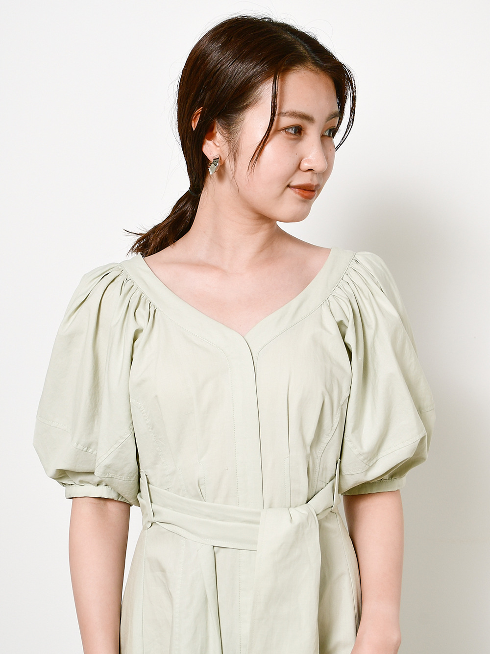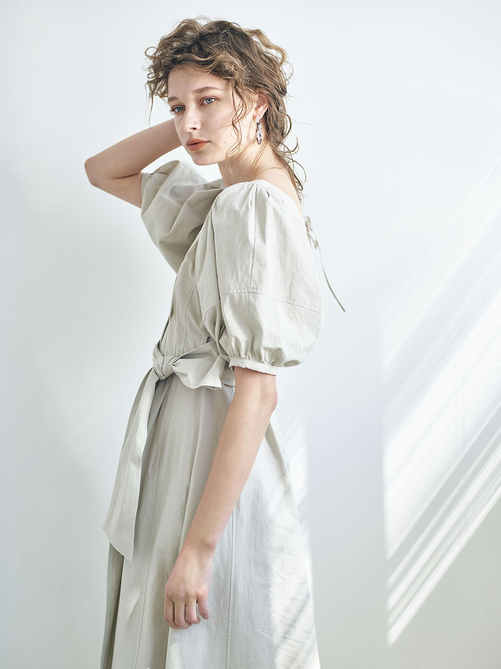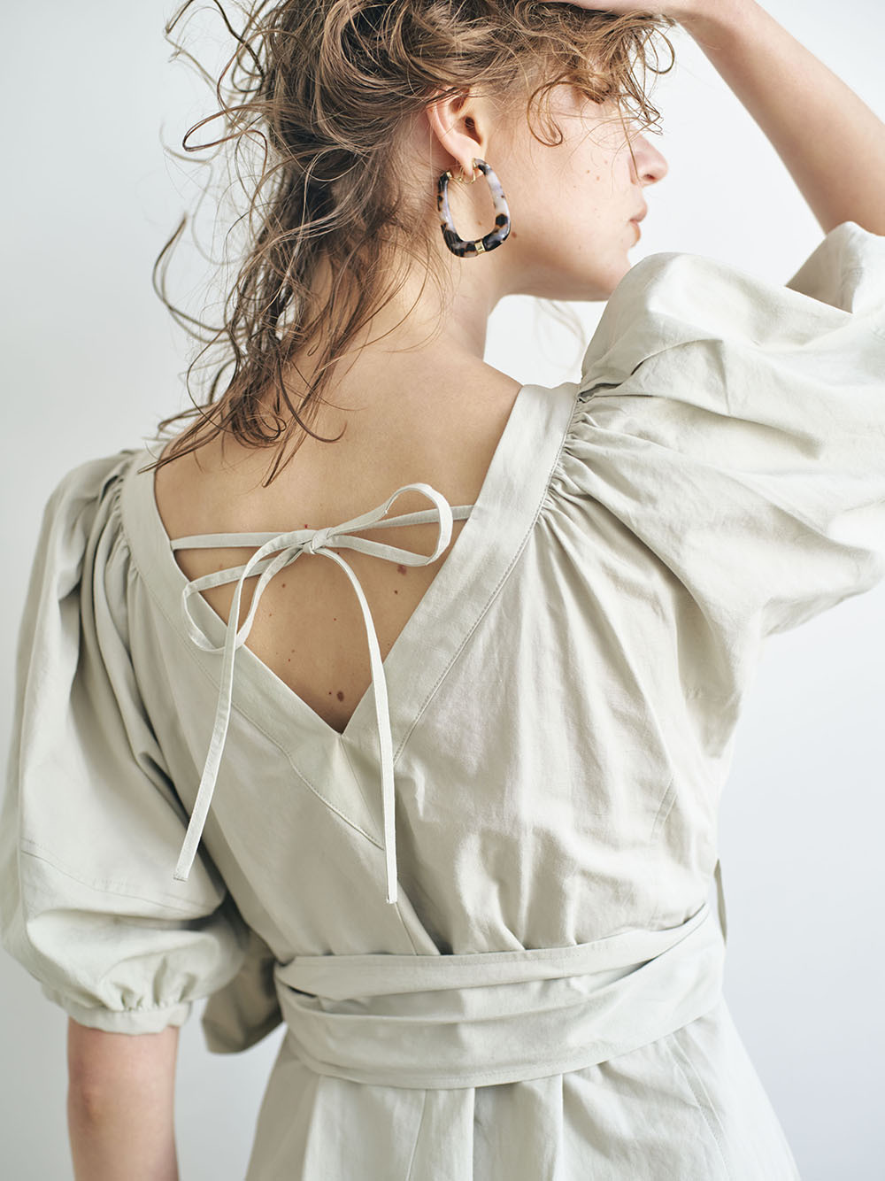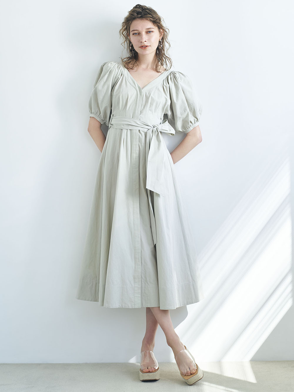 大胆にカッティングした前後のVネックが色香を纏う、コットンステッチワンピース。これからの季節に快適な清涼感のある生地を使用し、着心地の良さとナチュラルな雰囲気、女性らしい佇まいをバランス良く表現しました。ふっくらと丸いパフスリーブでトレンド感をプラス。タックでメリハリを出したウエストラインは、ベルトなしでも美しいシルエットを描きます。