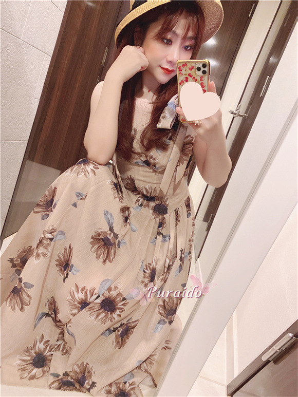 長さ調節可能な肩紐を配したスタイルで、印象的なシックなカラーの向日葵が大人の女性らしさを演出してくれます。