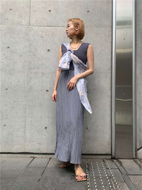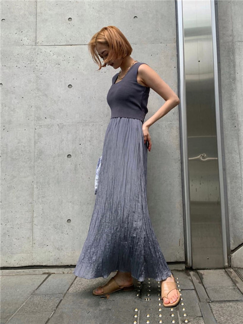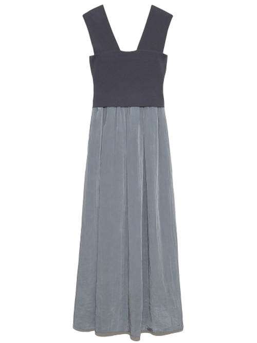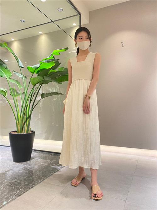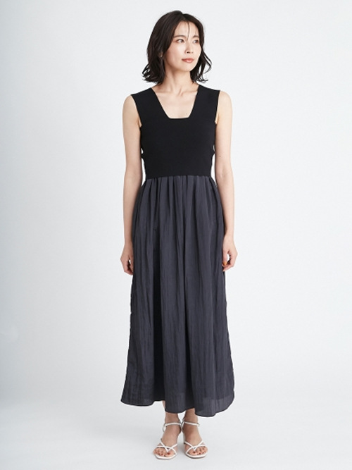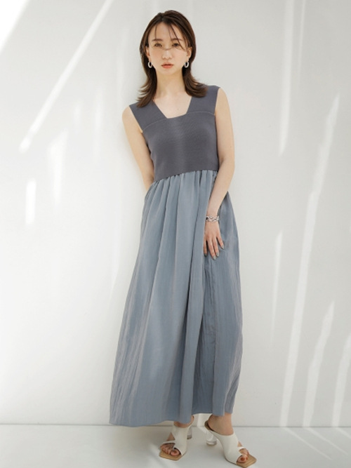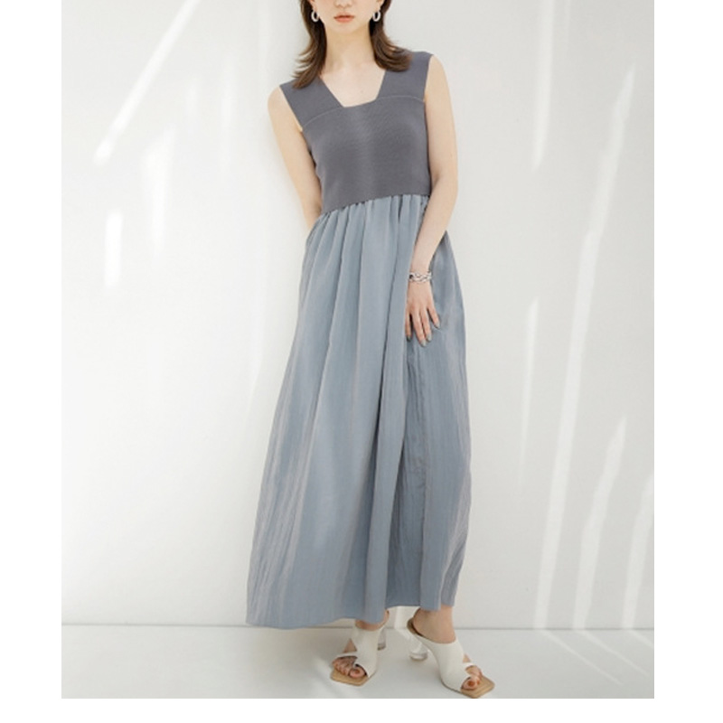 ニットビスチェを着ているような見え感が特徴で、裾をめくると内側はスカートとドッキングされており、表からは裾のウエストラインを縫い留めないフラシにすることで、スカートのギャザーの膨らみを抑え、重ね着をしているようなレイヤードデザインを作り出し、1着で心地よく着られます。