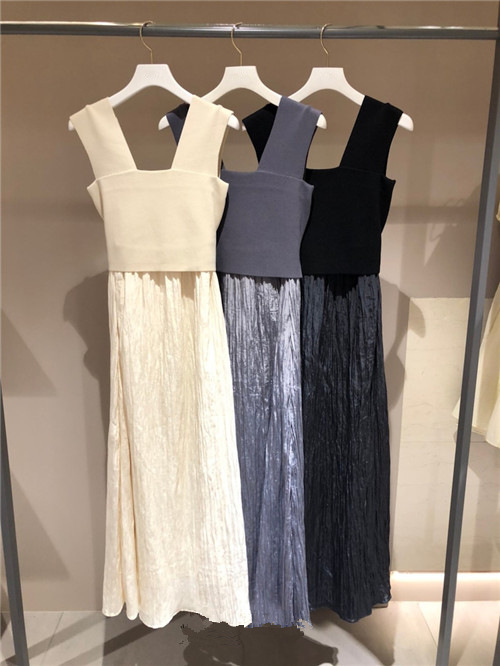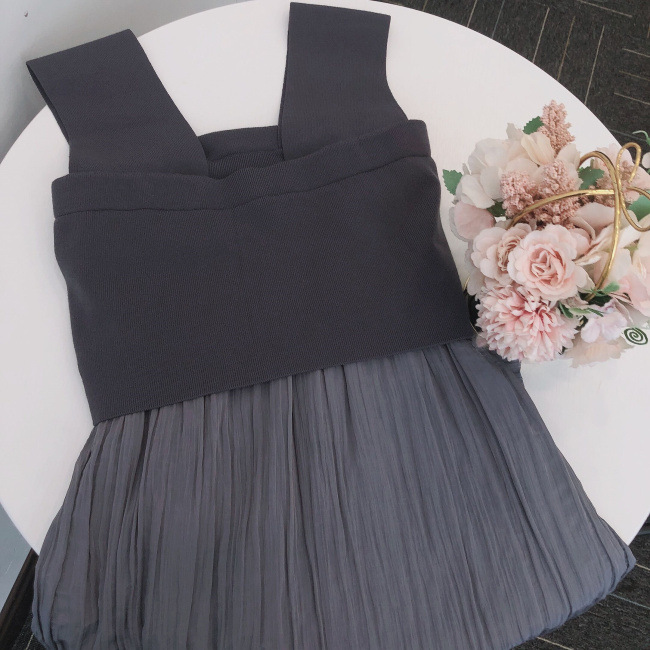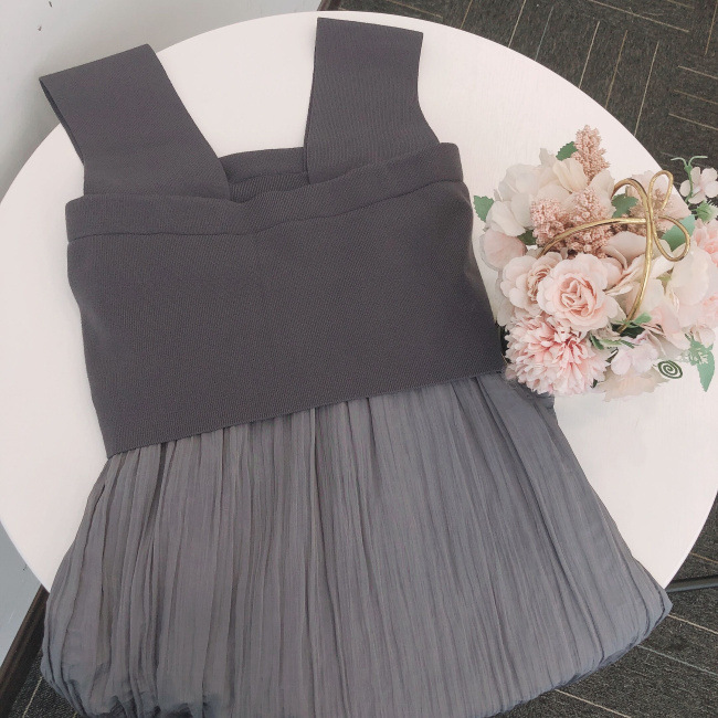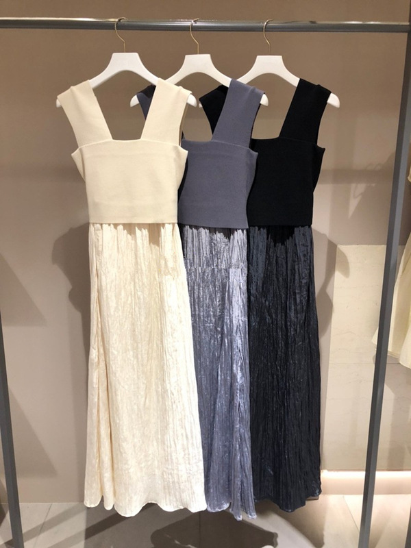 ビスチェ型のニットはヴィスコースナイロン糸の総針編みで、体にフィットするような心地よさ、太幅の肩ラインと背面のゴムでアンダーウェアを気にしないで着られます。