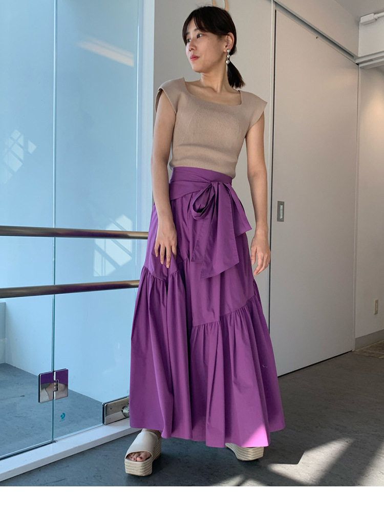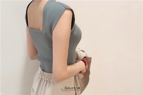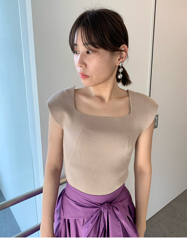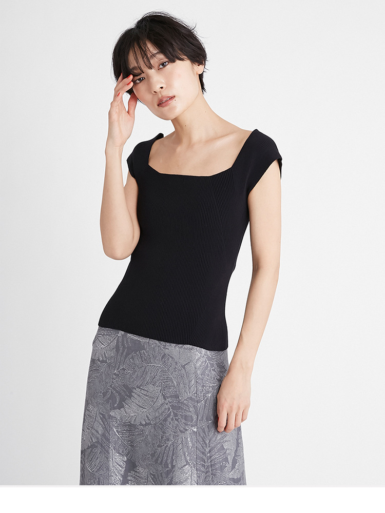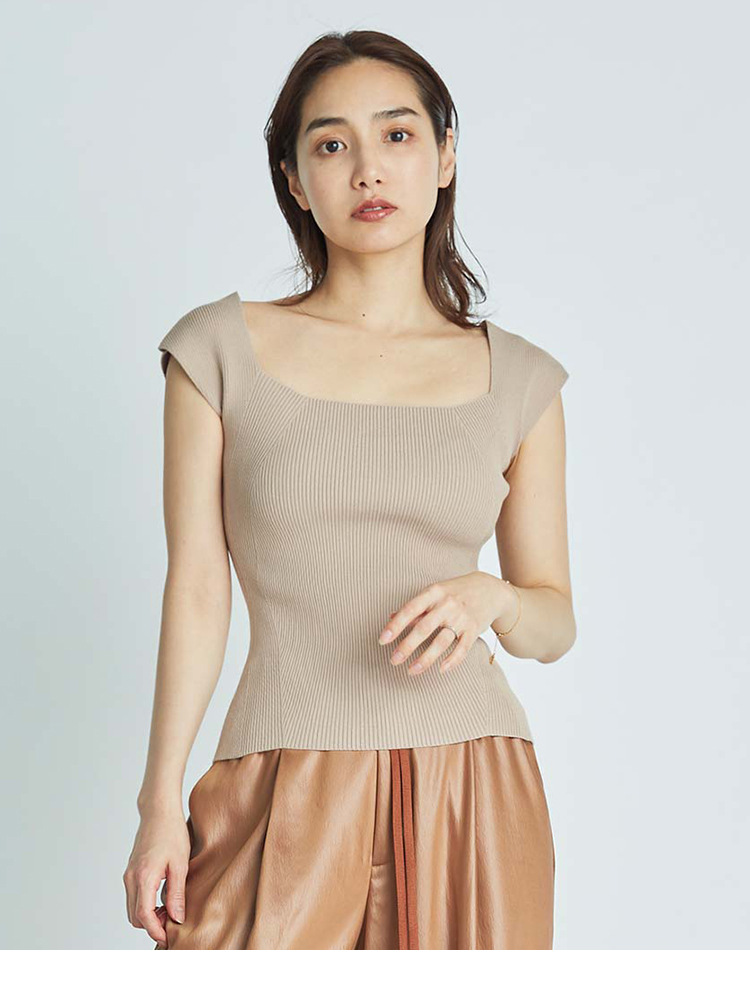 前後のスクエアネックで顔まわりをすっきりと、夏の暑い日にもサラッと着られるニットタンクです。