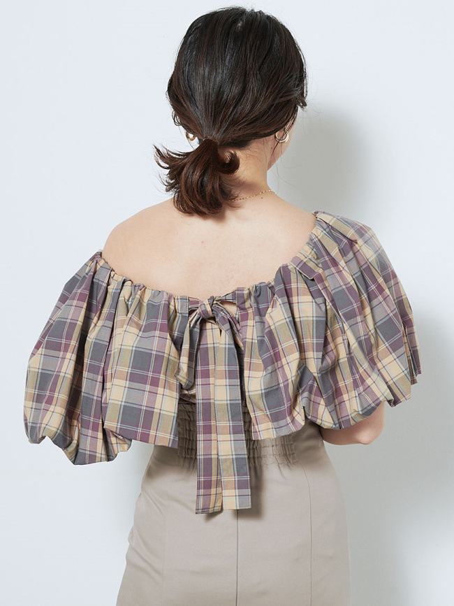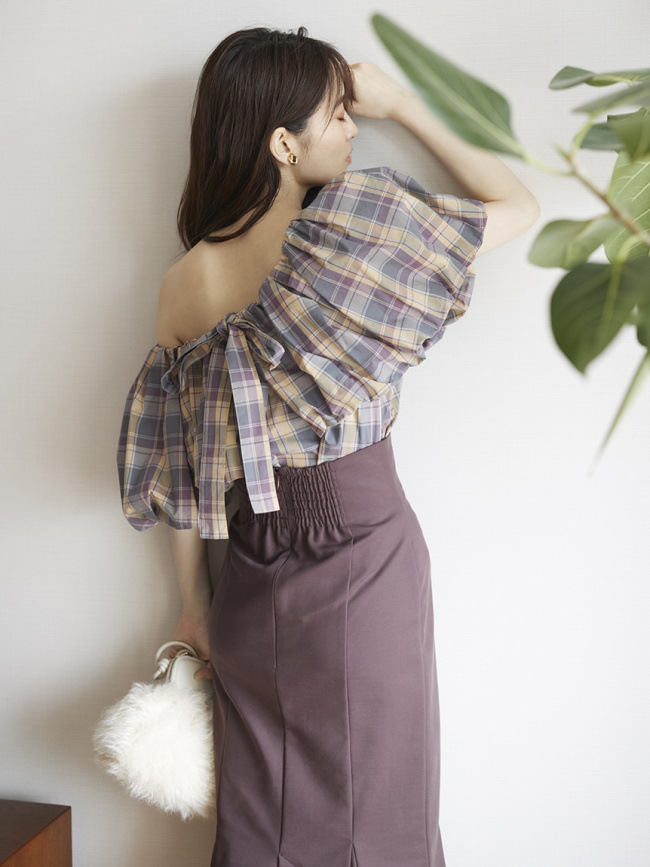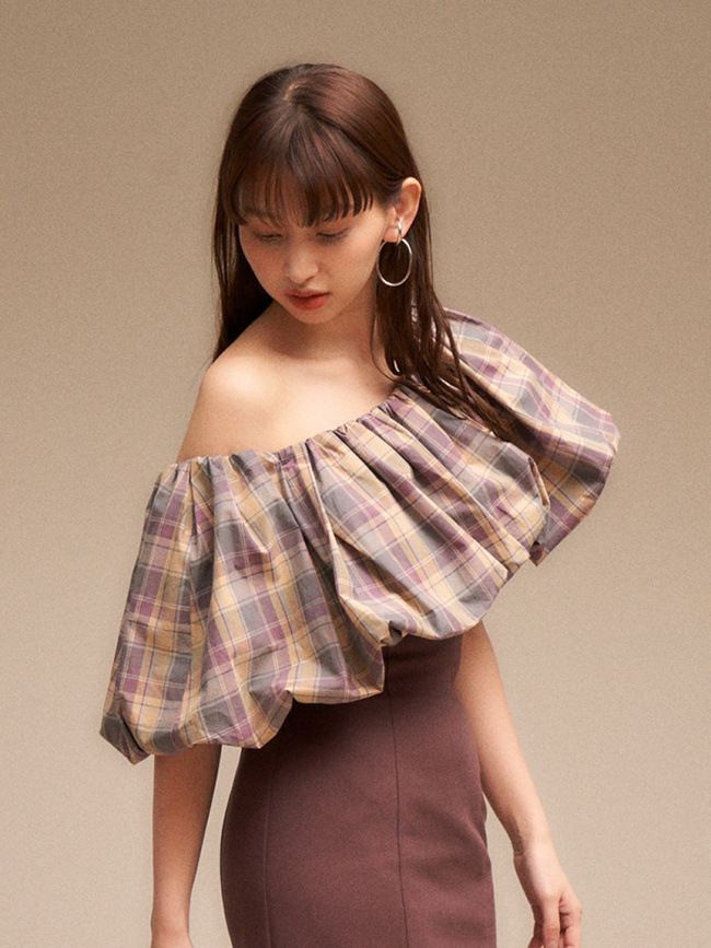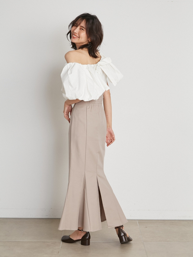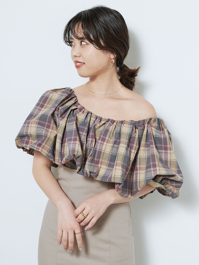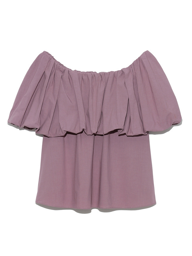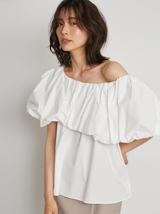 【ヘルシーな肌見せとインパクトあるボリュームスリーブが特徴のオフショルダーブラウス】