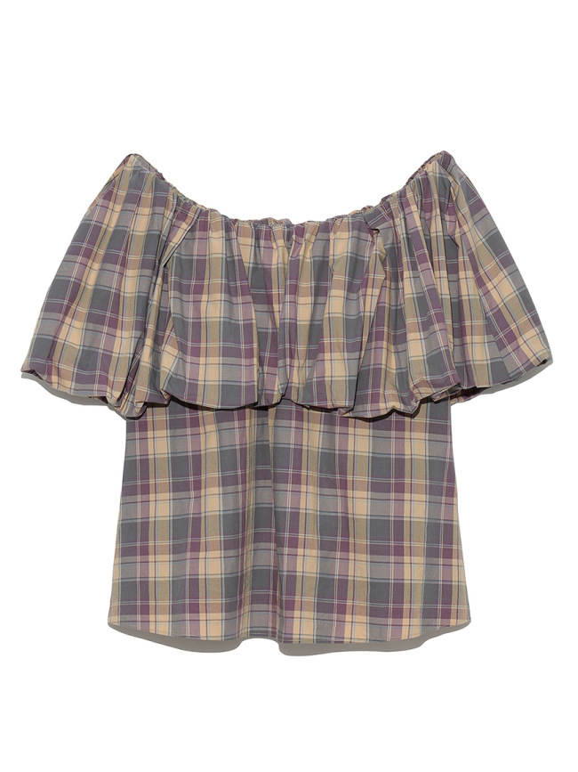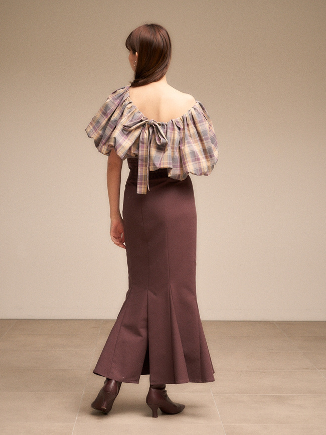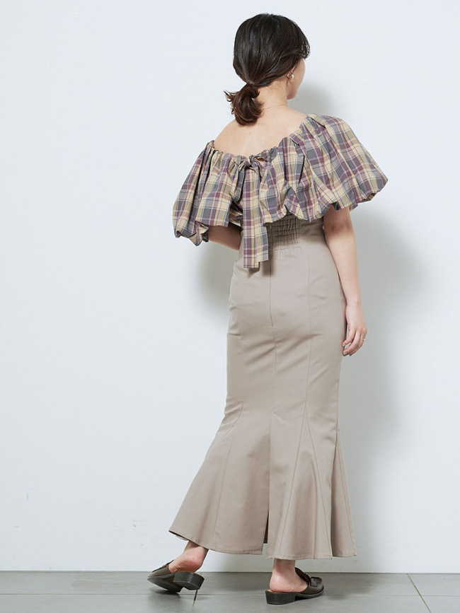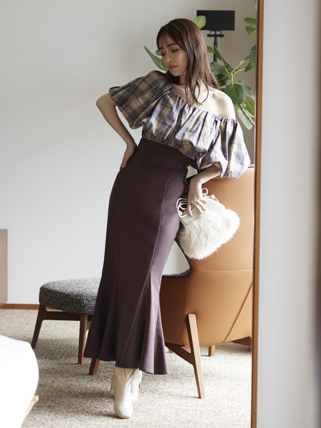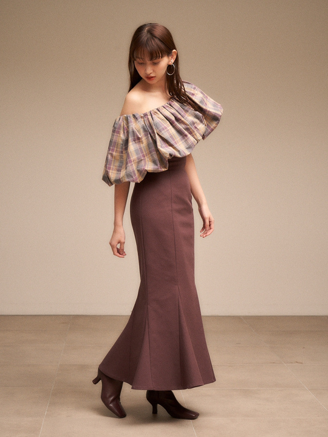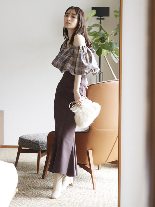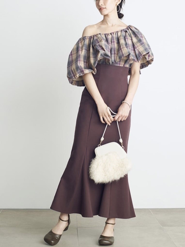 【ヘルシーな肌見せとインパクトあるボリュームスリーブが特徴のオフショルダーブラウス】