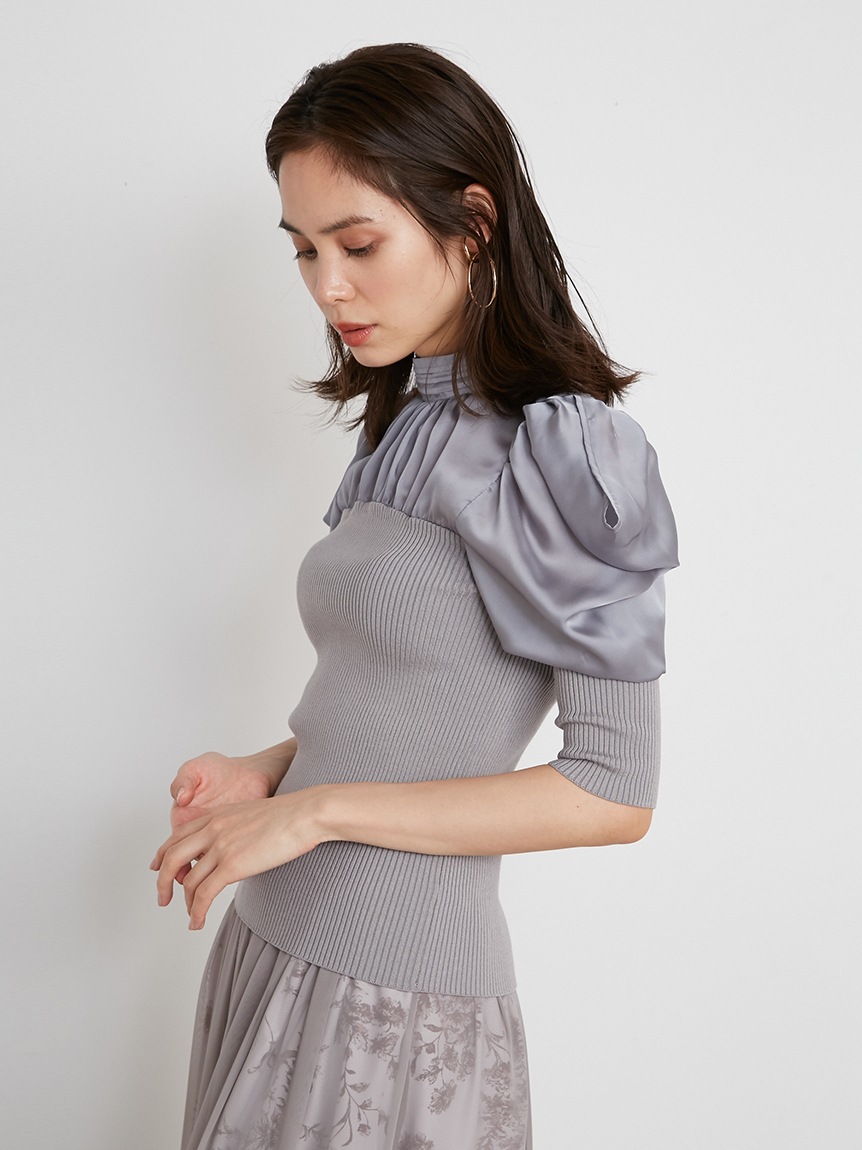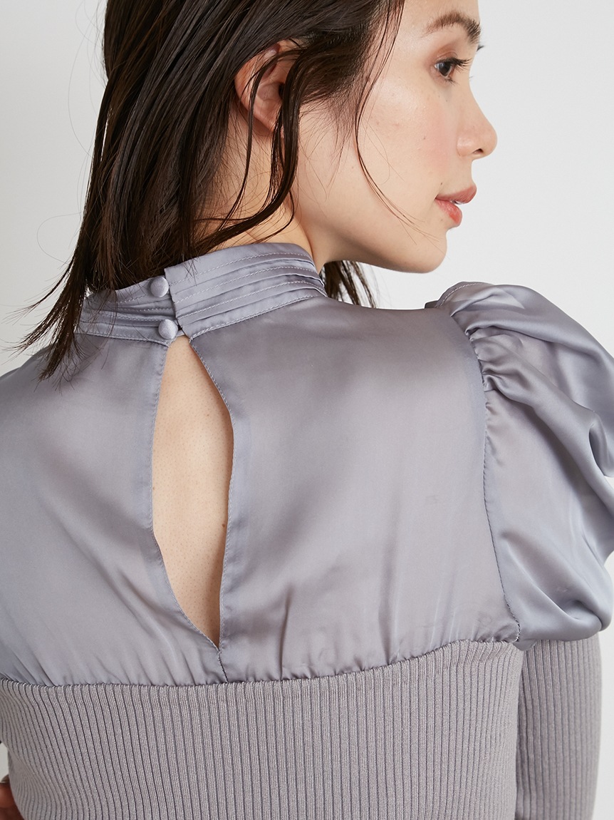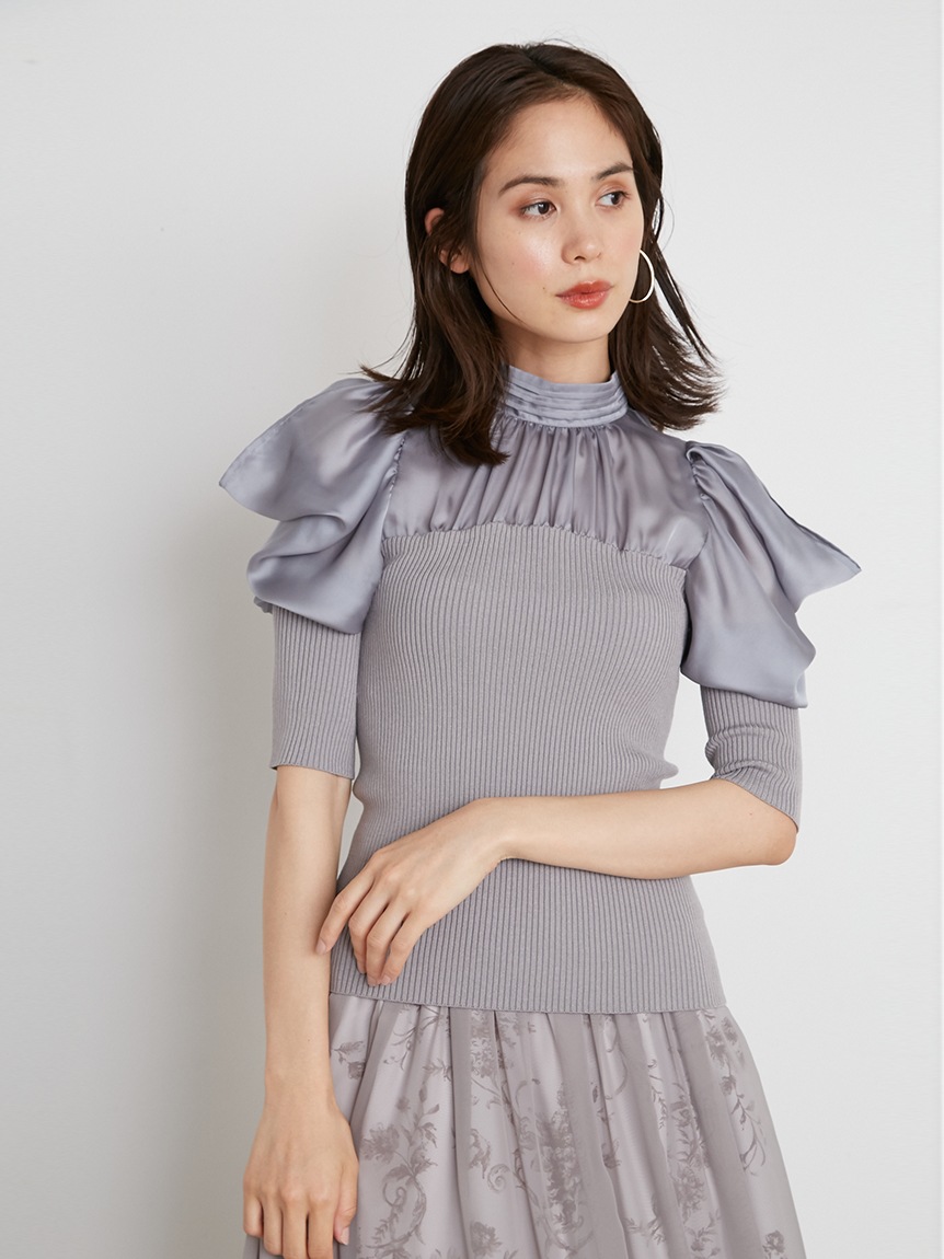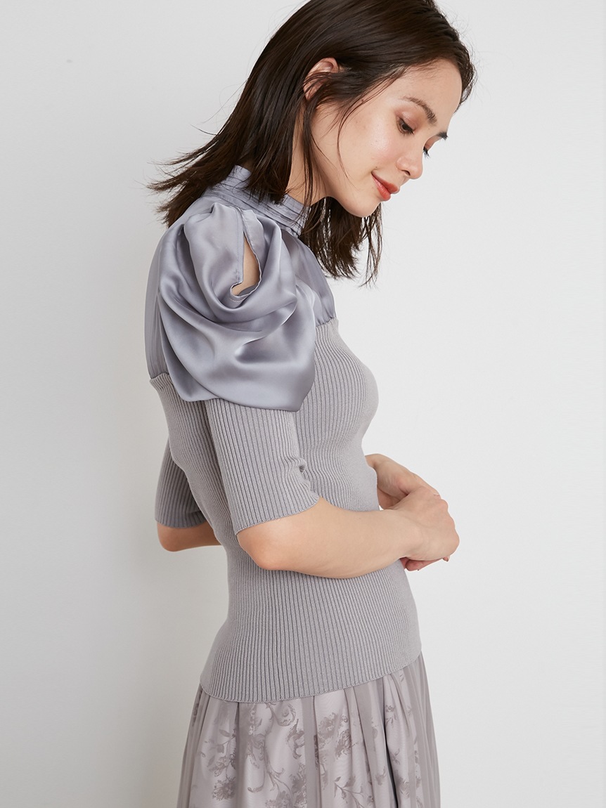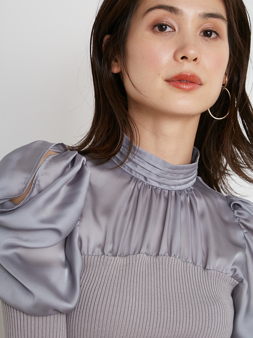 身頃と袖に異なるマテリアルを使用し、ワントーンでシックに整えたドッキングトップス。タックを寄せたスタンドカラー、美しいドレープを描く胸元、スリットをあしらったパフショルダーなど、「SNIDEL」らしいデザイン性の高さでワンランク上の1枚を表現しました。品の良さがありながらも程良い個性を放ち、オフィスからデイリーまでコーディネートの主役を担い秋のワードローブを彩ります。