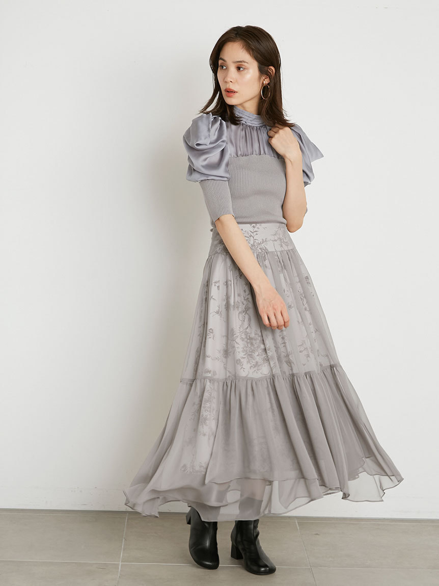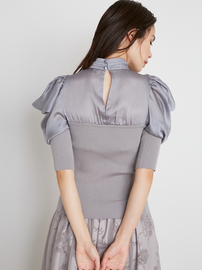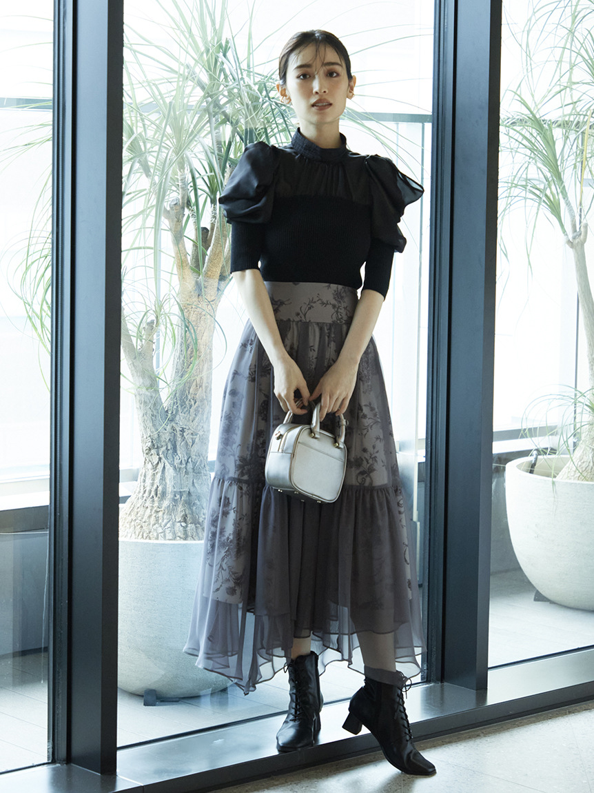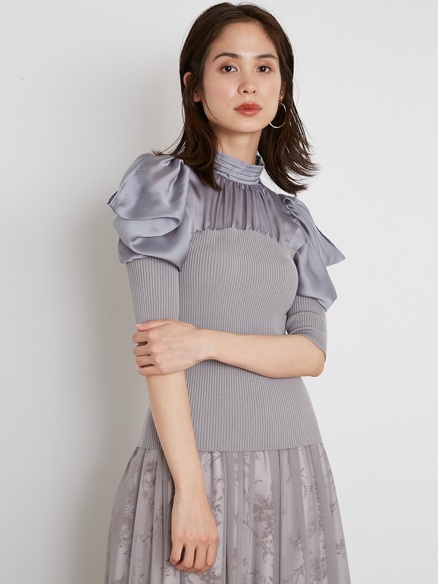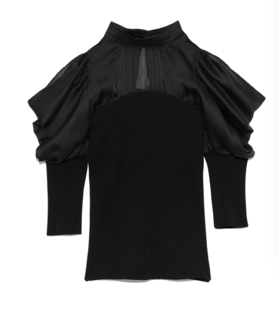 身頃と袖に異なるマテリアルを使用し、ワントーンでシックに整えたドッキングトップス。タックを寄せたスタンドカラー、美しいドレープを描く胸元、スリットをあしらったパフショルダーなど、「SNIDEL」らしいデザイン性の高さでワンランク上の1枚を表現しました。品の良さがありながらも程良い個性を放ち、オフィスからデイリーまでコーディネートの主役を担い秋のワードローブを彩ります。
