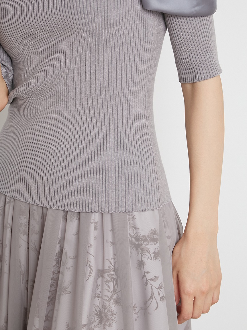 肩から袖にかけては程良い透け感ときれいな落ち感を兼ね備えた素材を、身頃にはきれいめ見えするハイゲージニットを使用しました。アイボリー、グレー、ブラック、ボルドーの4色展開です。