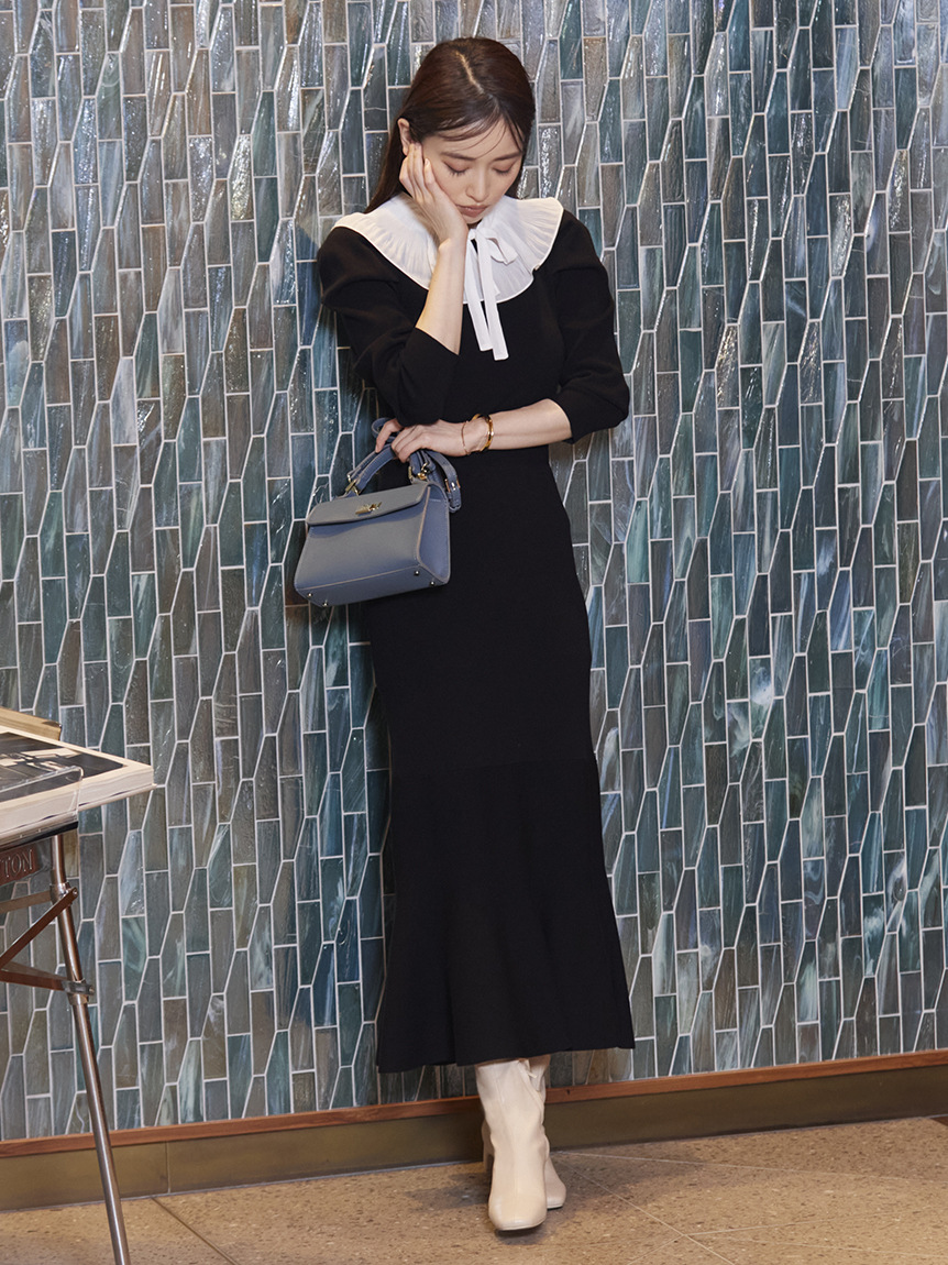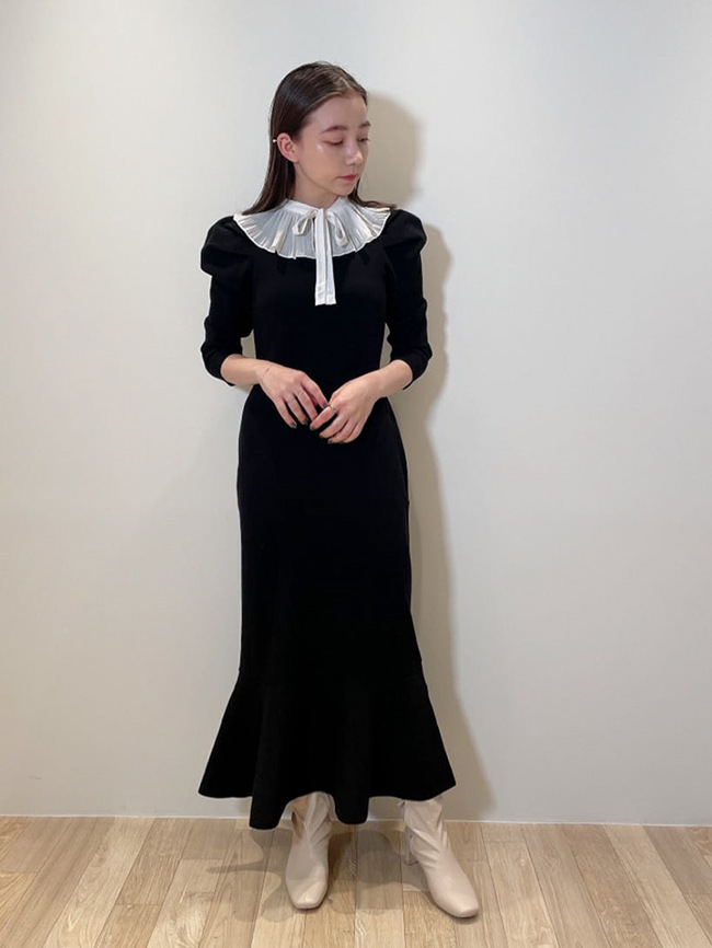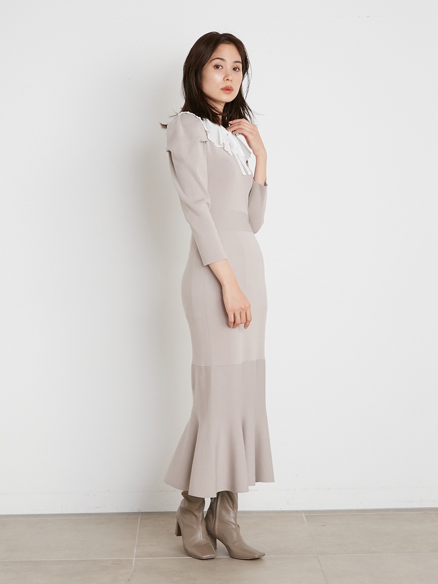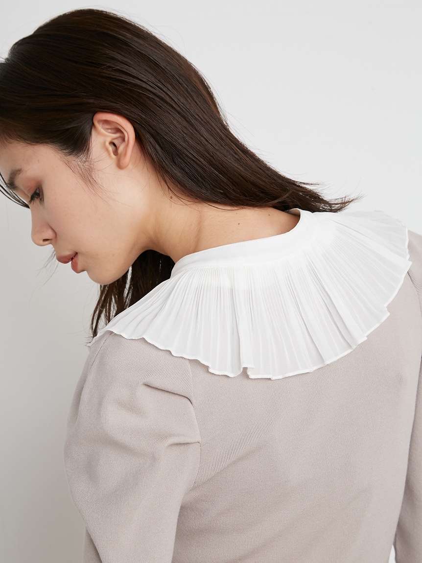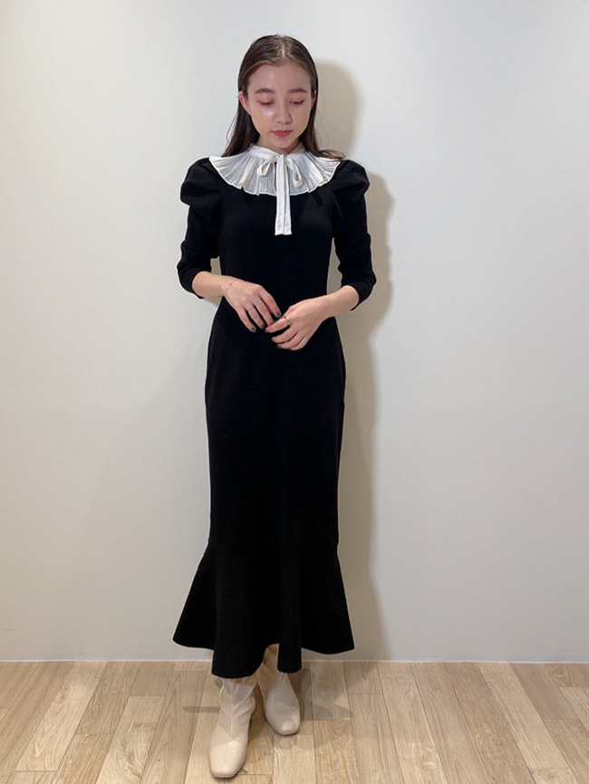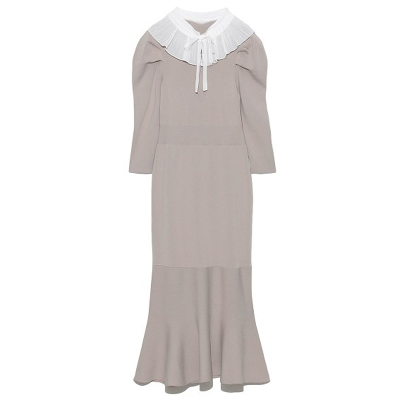 取り外し可能なフリルカラーが印象的なクラシックワンピース。細プリーツでボリュームを出した襟は取り外しが可能なので、シーンに合わせてお好みでアレンジいただけます。胸元の涙スリットとパワーショルダーでレトロに仕上げたニットワンピースは、目の詰まった上品な仕上がりがポイント。程良いフィット感がボディラインを美しく魅せ、裾にかけて広がるマーメイドフレアにレディムードが漂います。