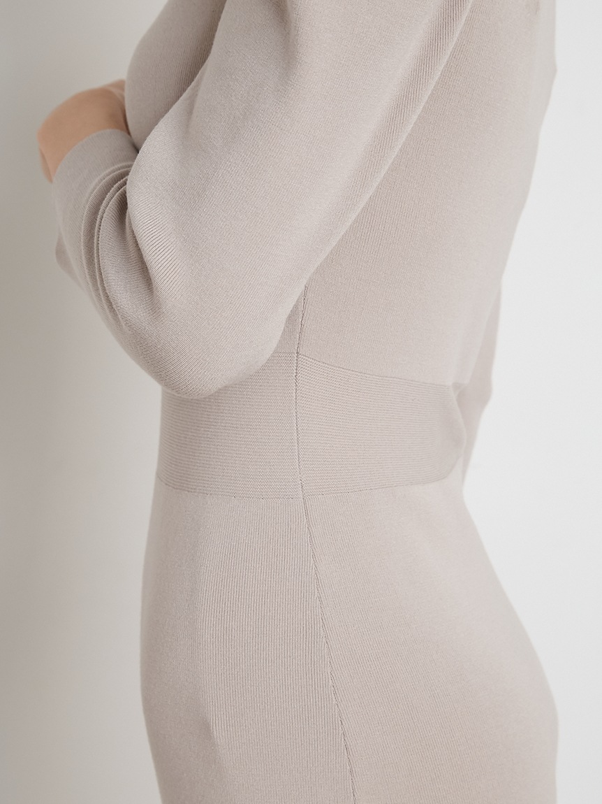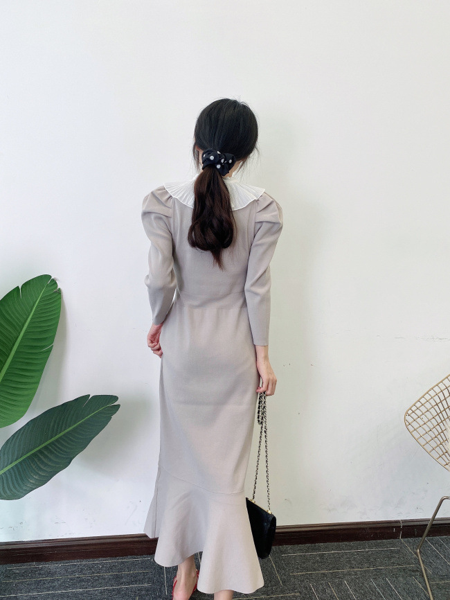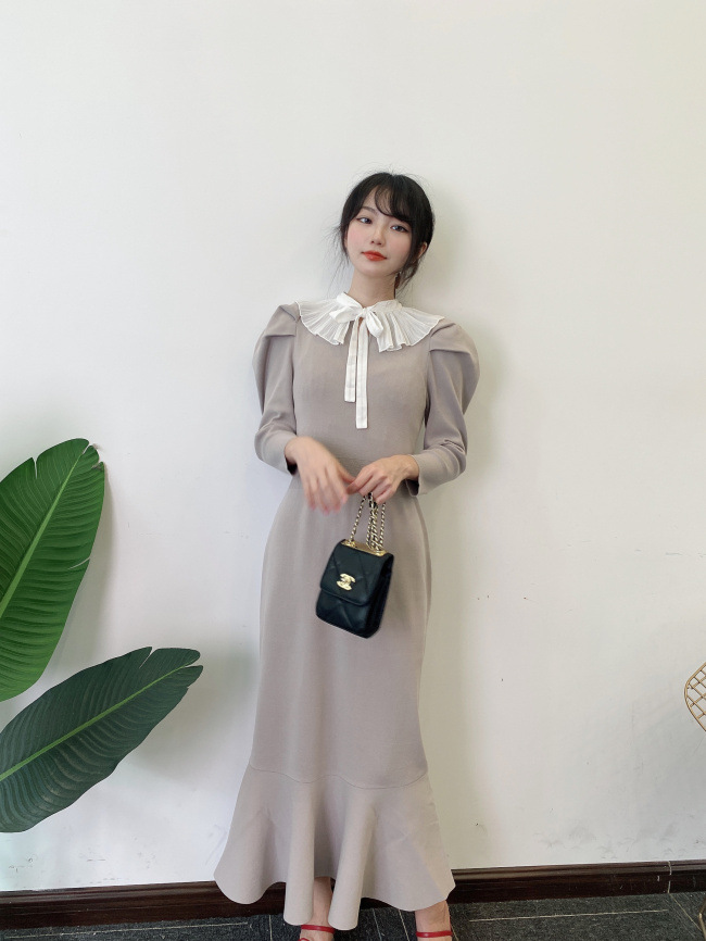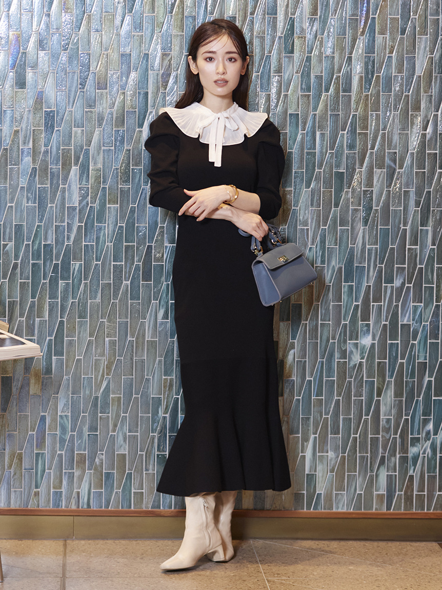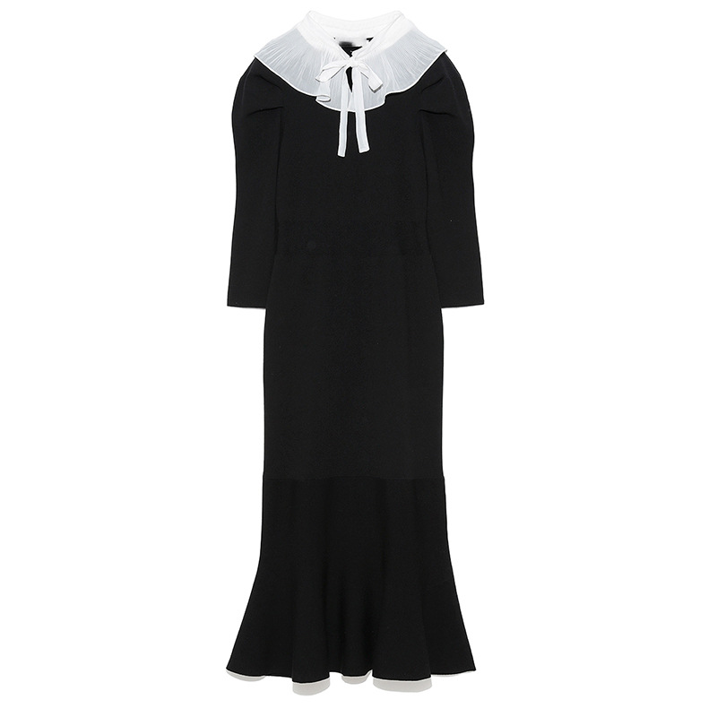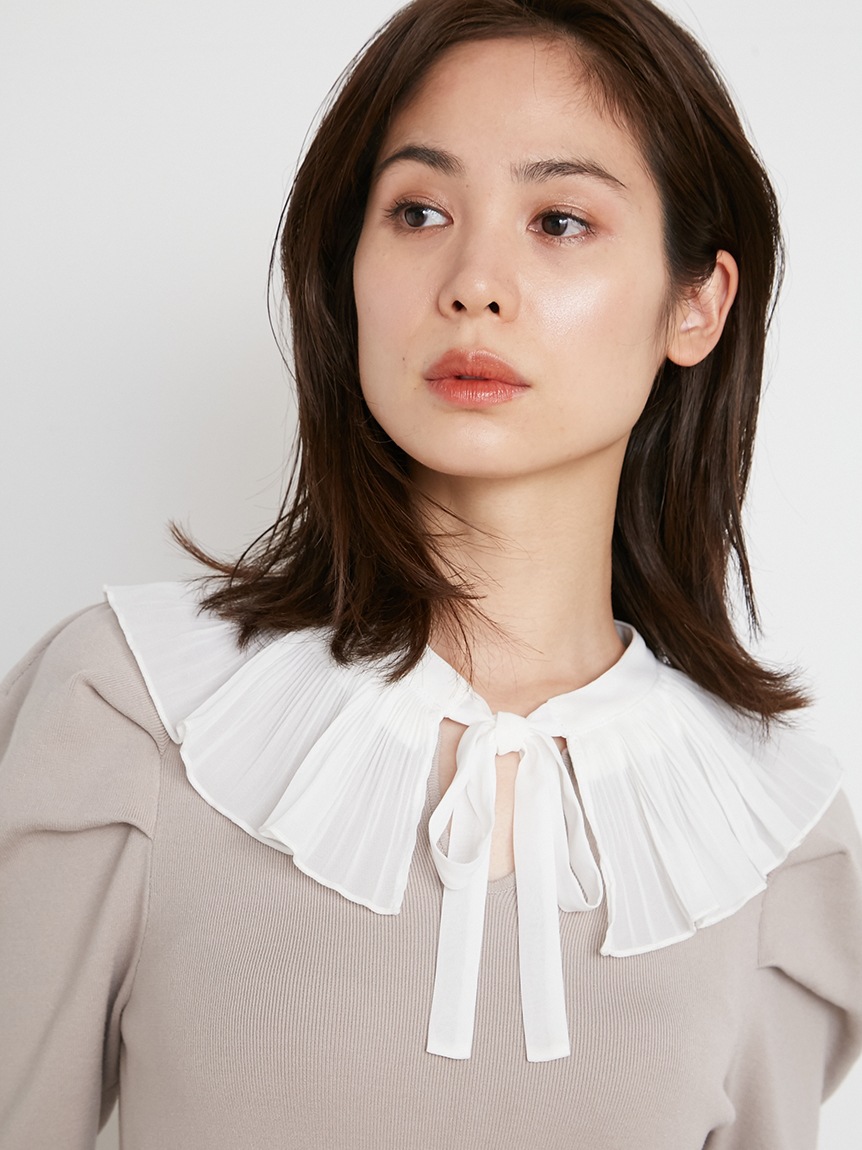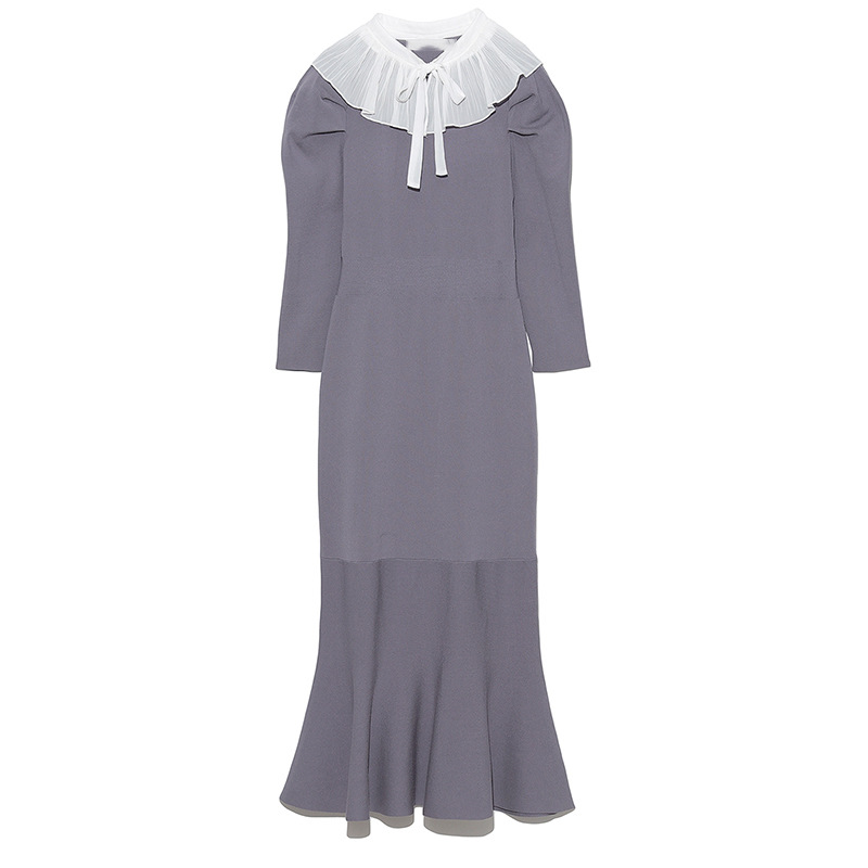取り外し可能なフリルカラーが印象的なクラシックワンピース。細プリーツでボリュームを出した襟は取り外しが可能なので、シーンに合わせてお好みでアレンジいただけます。胸元の涙スリットとパワーショルダーでレトロに仕上げたニットワンピースは、目の詰まった上品な仕上がりがポイント。程良いフィット感がボディラインを美しく魅せ、裾にかけて広がるマーメイドフレアにレディムードが漂います。