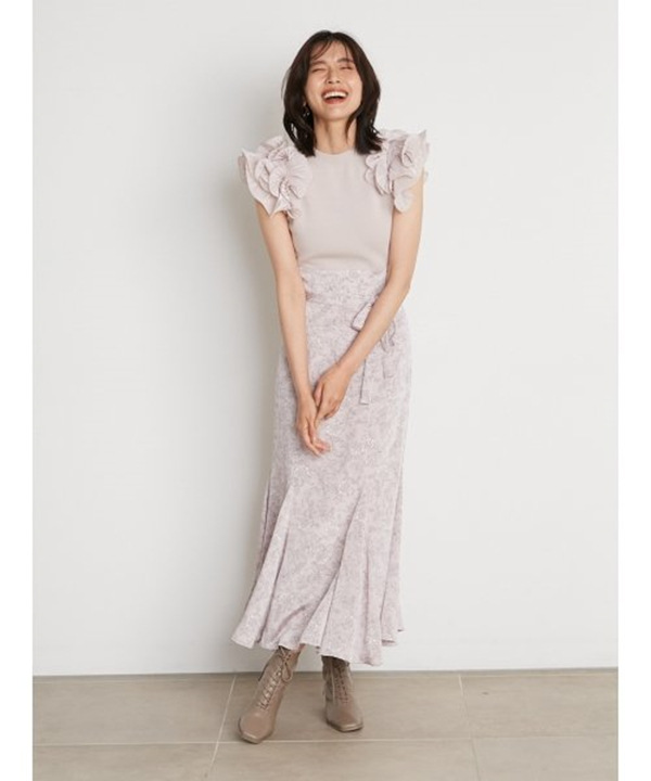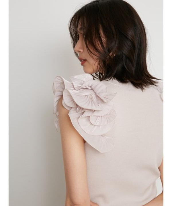 羽のように愛らしいラッフルスリーブがキャッチーなニットトップス。光沢のあるオーガンジーのラッフルとハイゲージニットを組み合わせ、ワントーンでシックにデザインしました。キーポイントとなるラッフルには、計算された様々なディティールを表現。分量たっぷりのオーガンジーのフリル先にテグスを入れることで華やかなシルエットをメイクしました。身頃をシンプルにすることで大人な印象に仕上げ、フェミニンとモードのバランスが絶妙な1枚です。