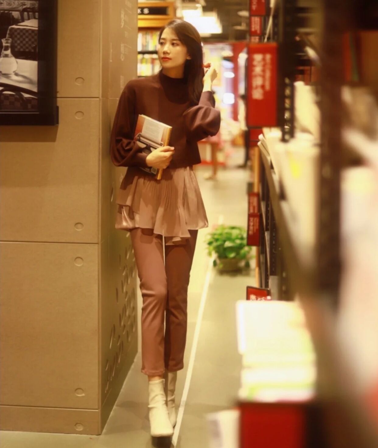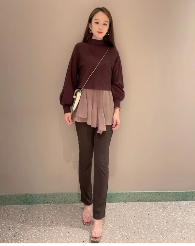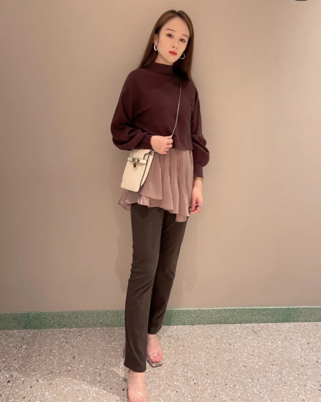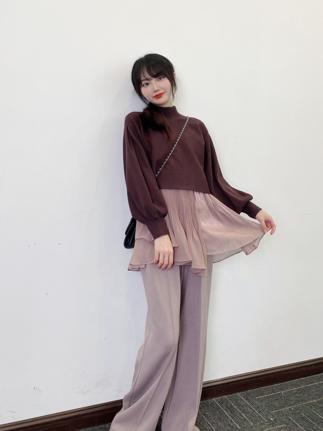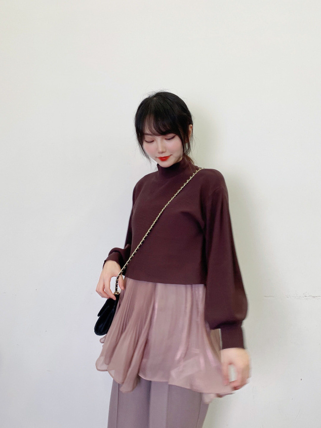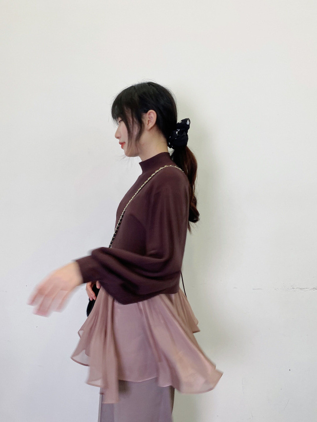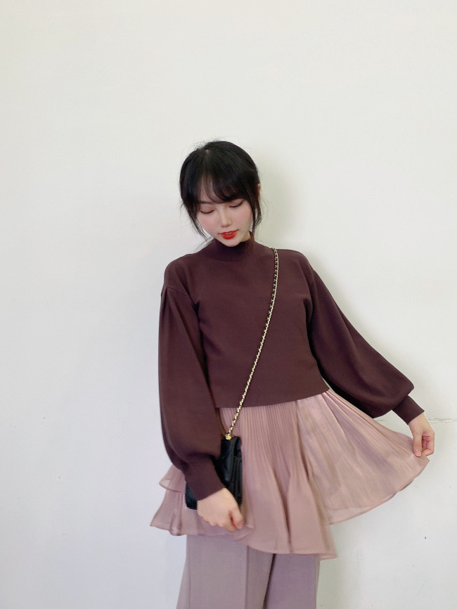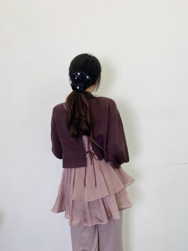 ニットは品良く目の詰まった編み地で仕立て、インナー布帛にはシアー感のあるシフォン生地を使用しました。ライトピンクとブラウンは同色ワントーンで、ブラックのみ配色セットにしています。