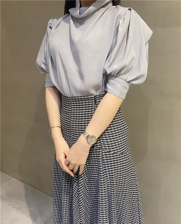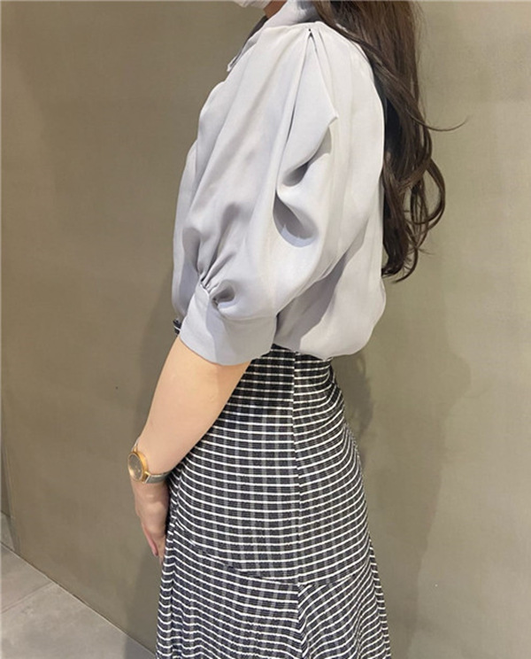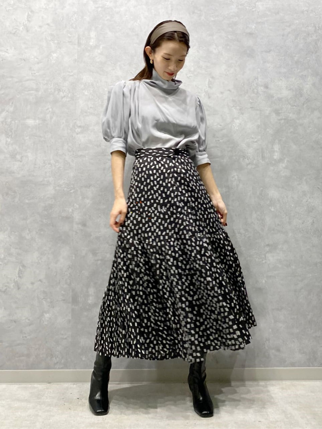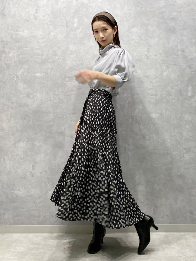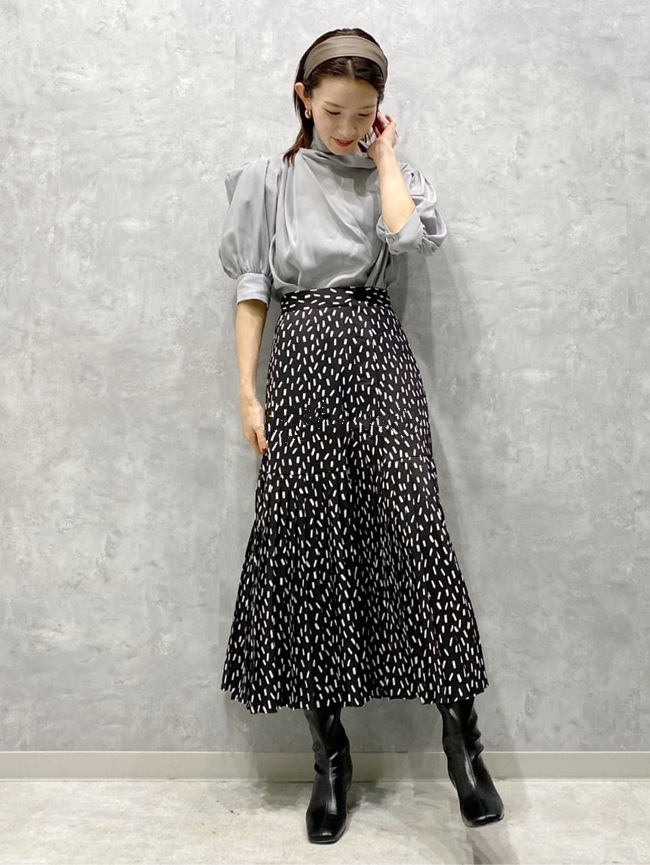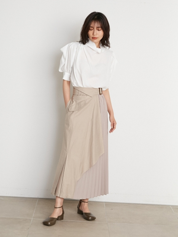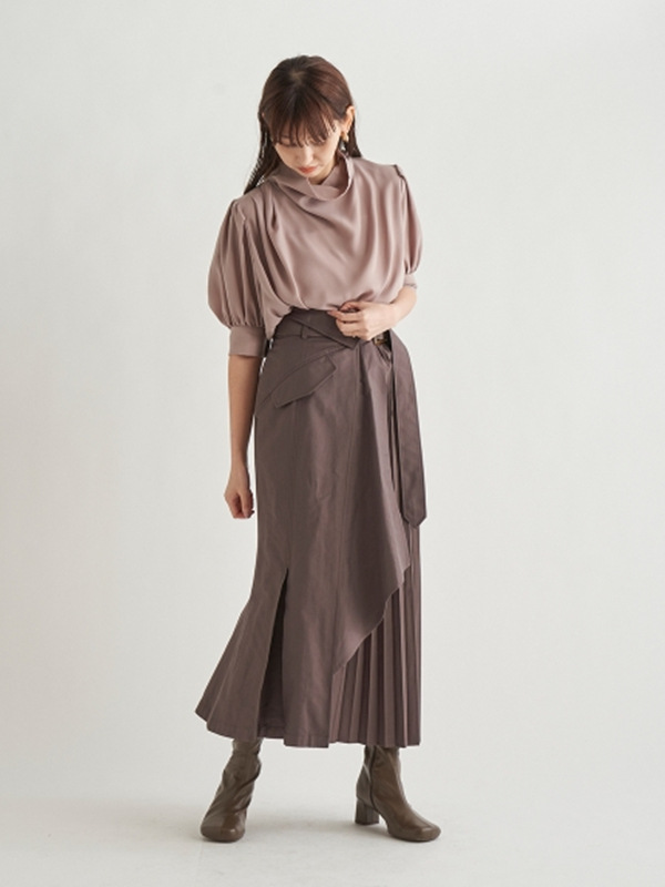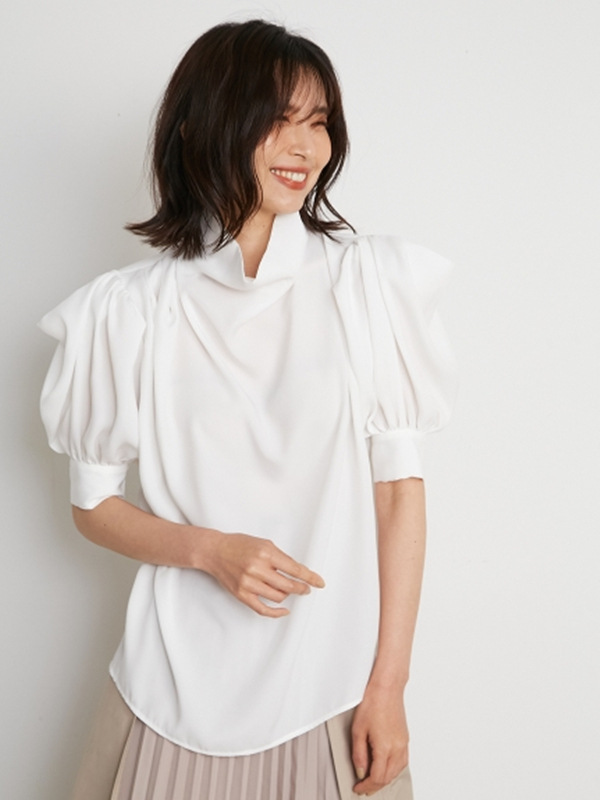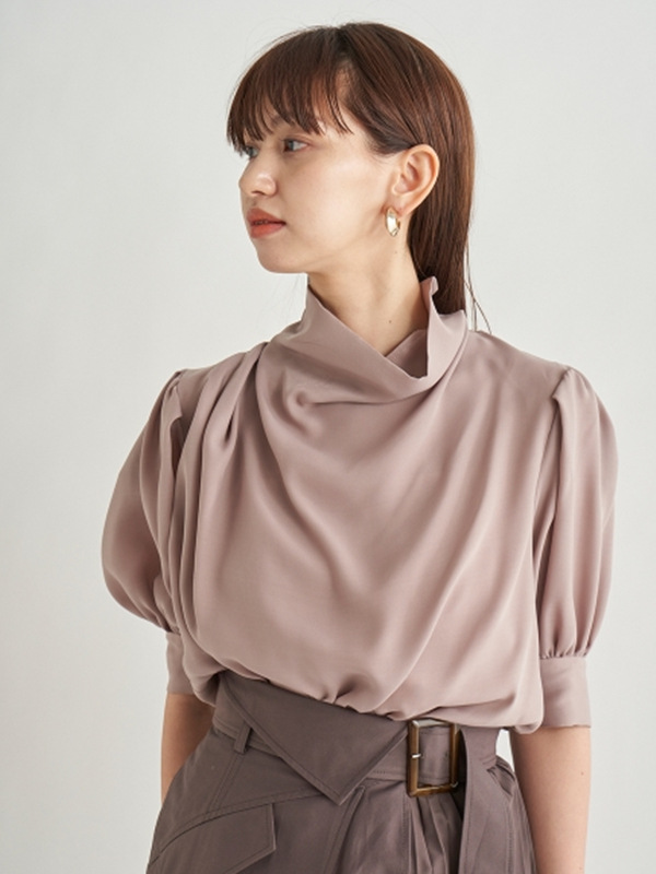 光沢感のあるしなやかな生地が、美しく柔らかなドレープを描くブラウス。立体的な襟や肩のギャザーできれいなドレープをつくり、纏うだけで女性らしさを際立たせる品の良さを目指しました。たっぷりのボリュームを持たせたスリーブやバックの涙スリットなど、デザイン性も兼ね備えた1着に。ドレープ感が一層際立つ、トップスインの着こなしがおすすめです。