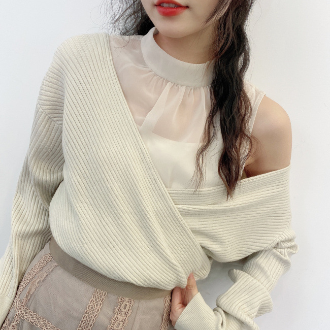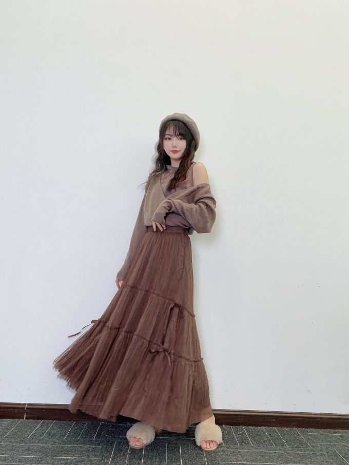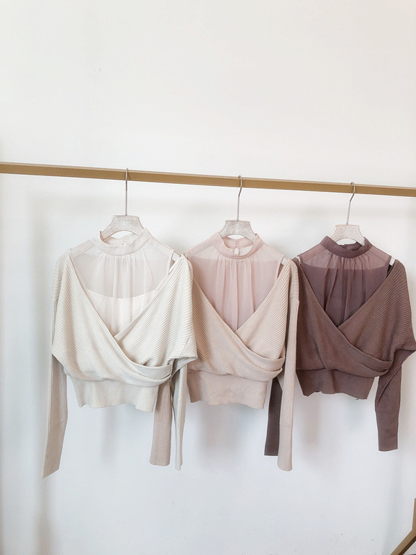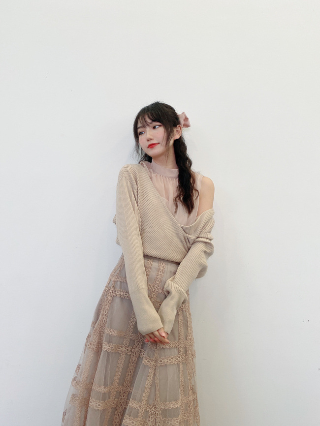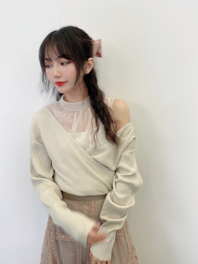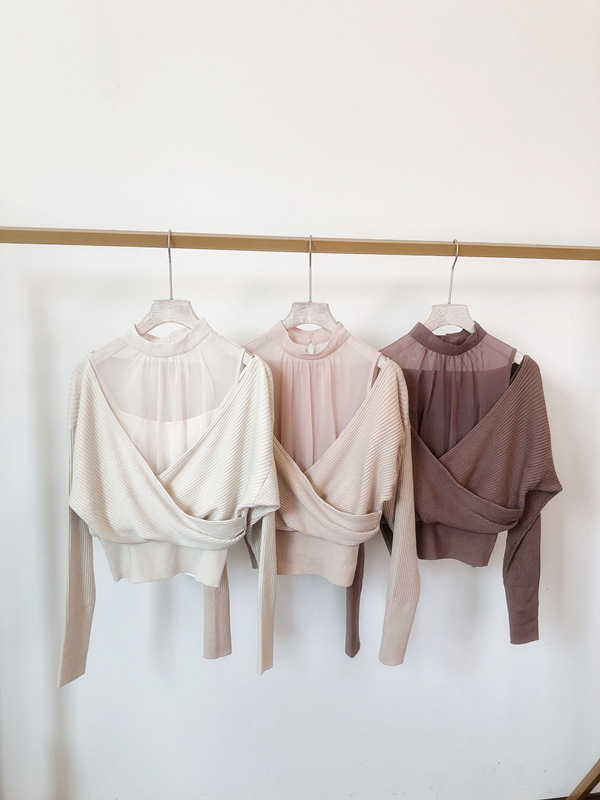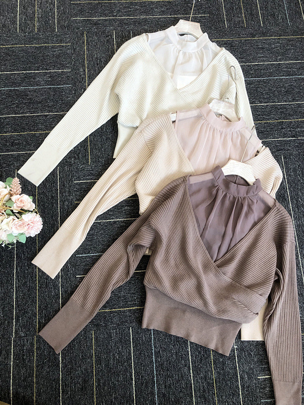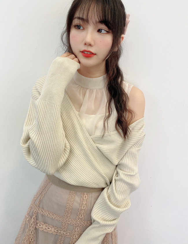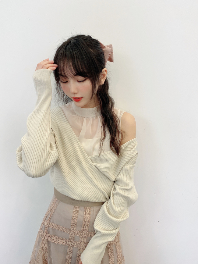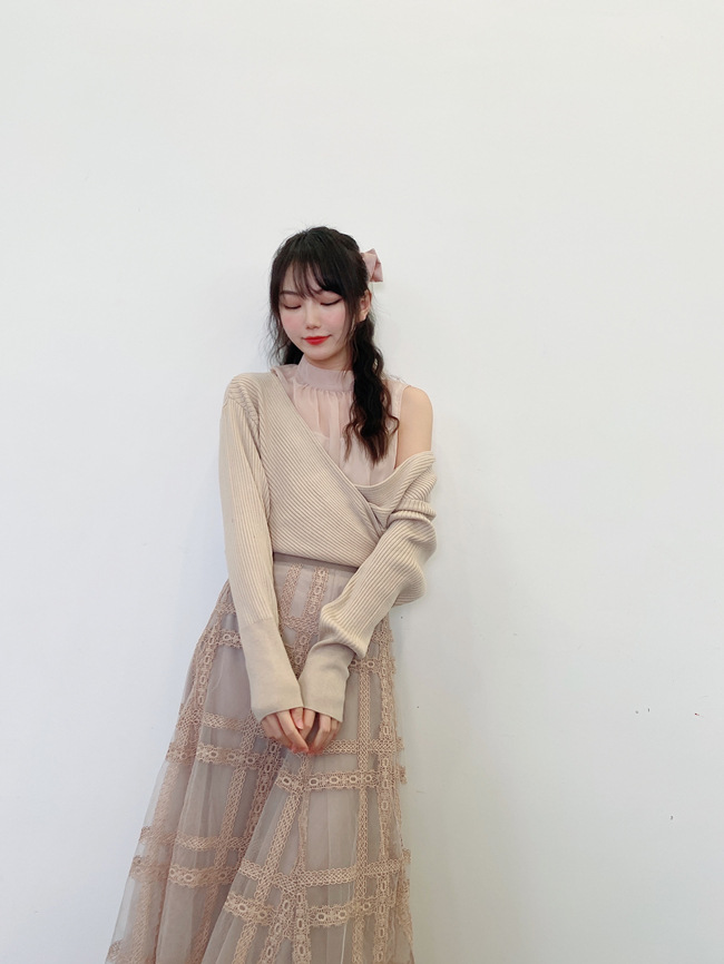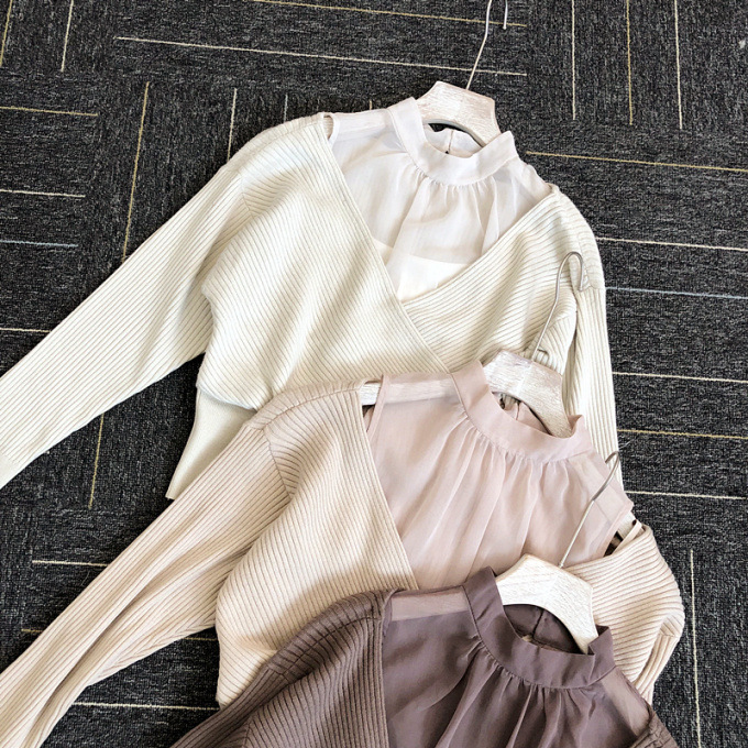 ブラウスには透け感のあるシフォンを、ニットには編み地の映えるやや肉厚の糸を使用しました。アイボリー、ピンクベージュ、モカの3色展開です。