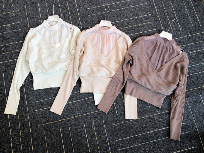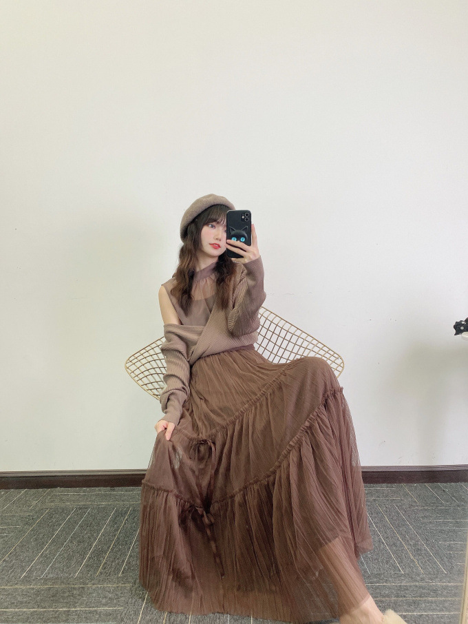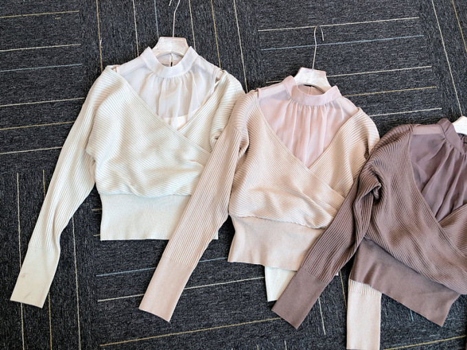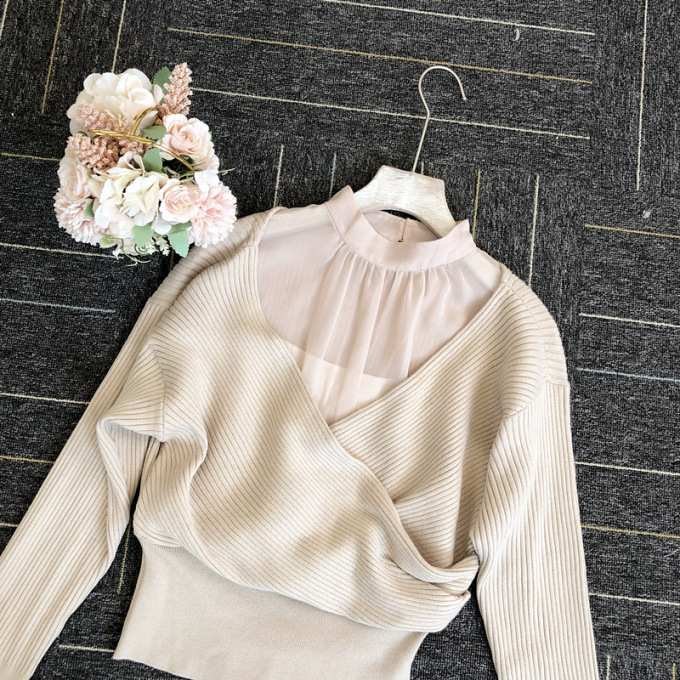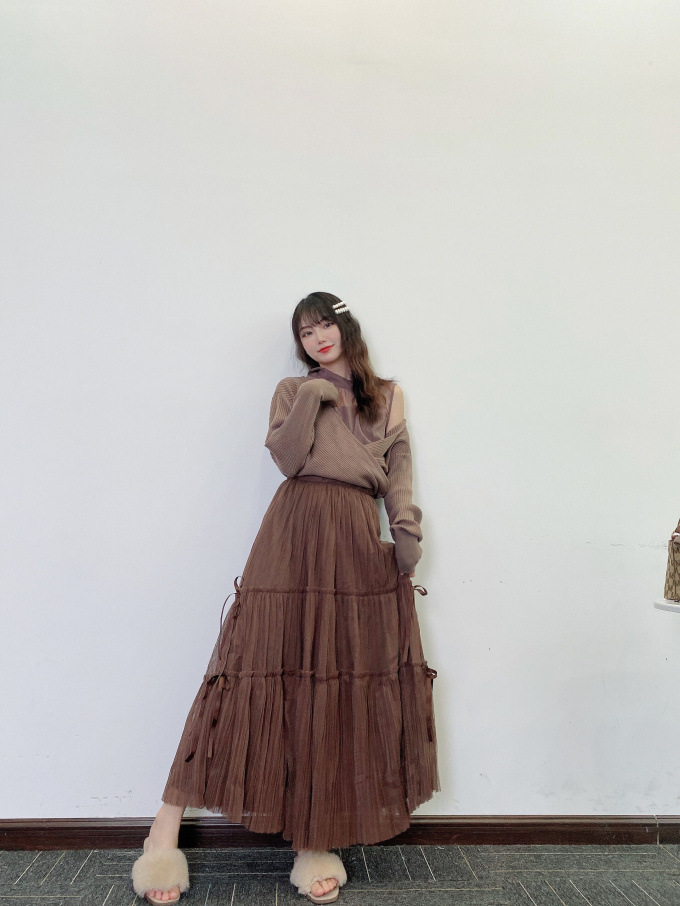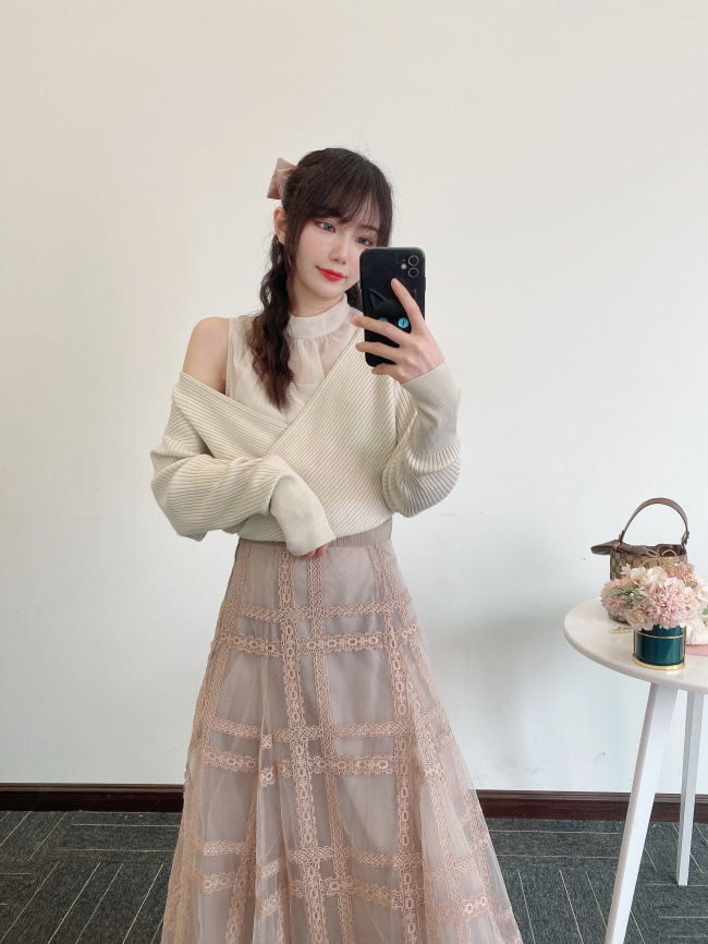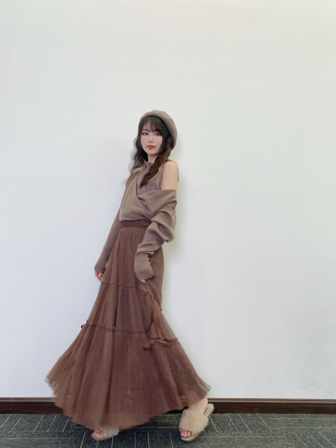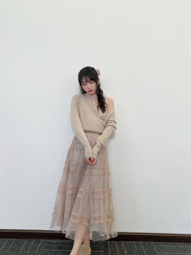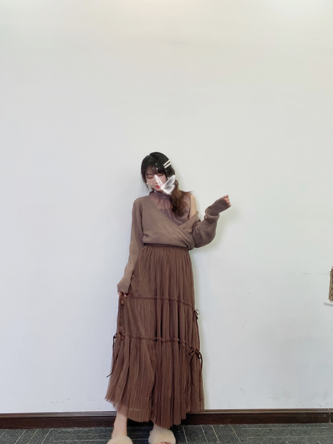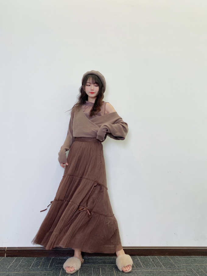 ブラウスには透け感のあるシフォンを、ニットには編み地の映えるやや肉厚の糸を使用しました。アイボリー、ピンクベージュ、モカの3色展開です。