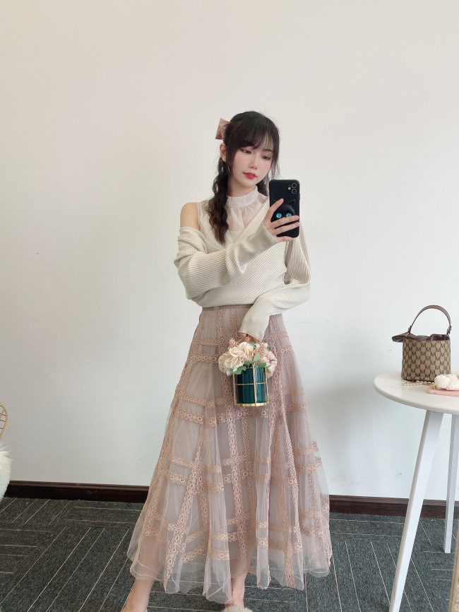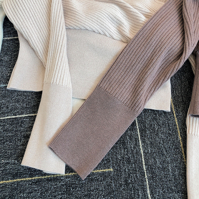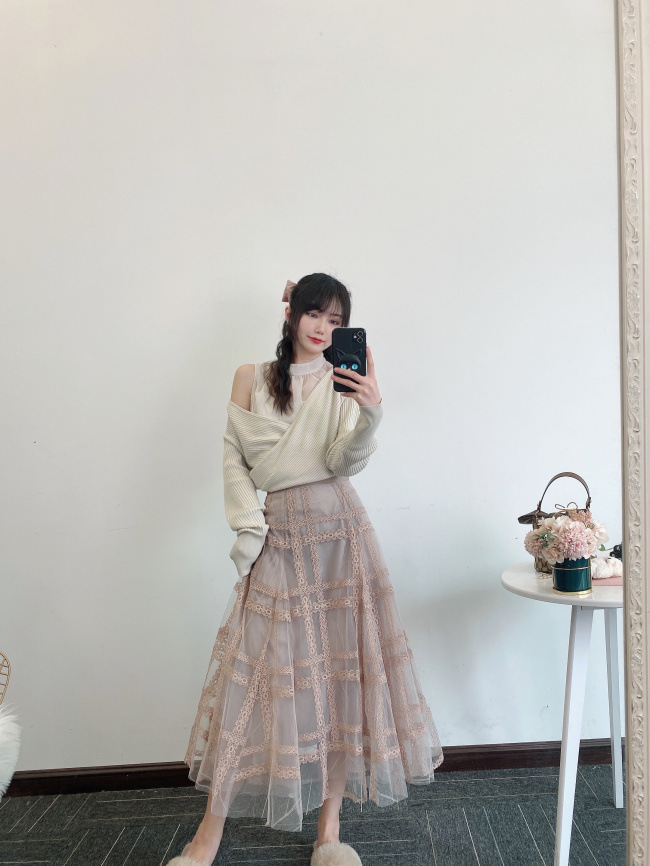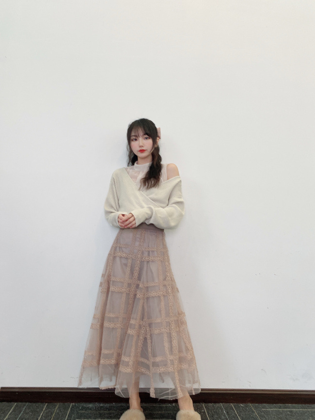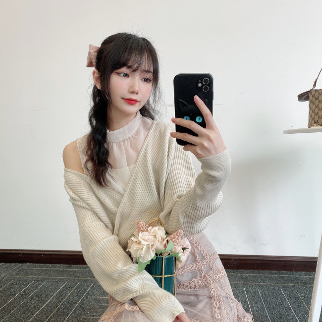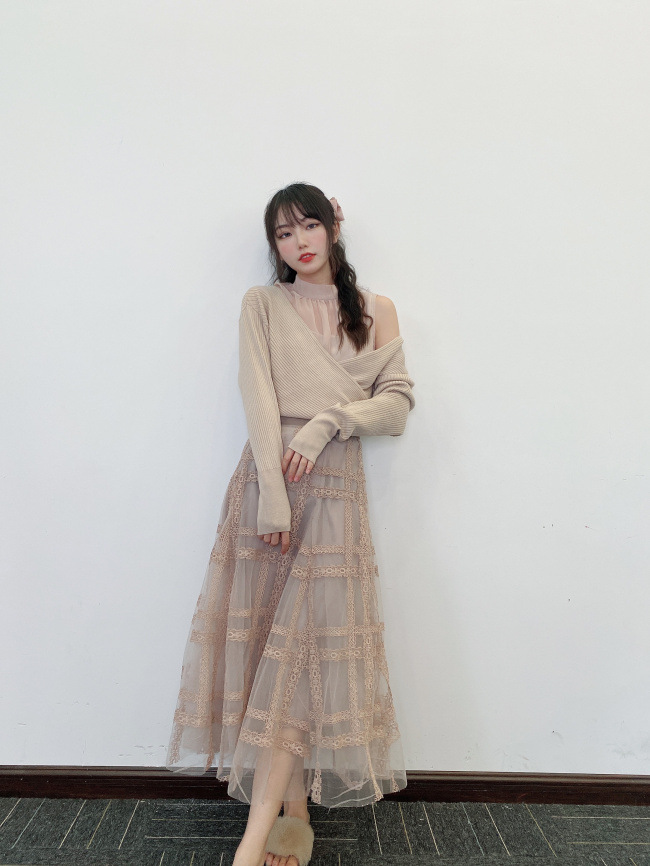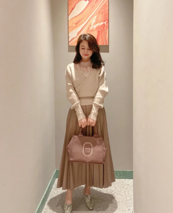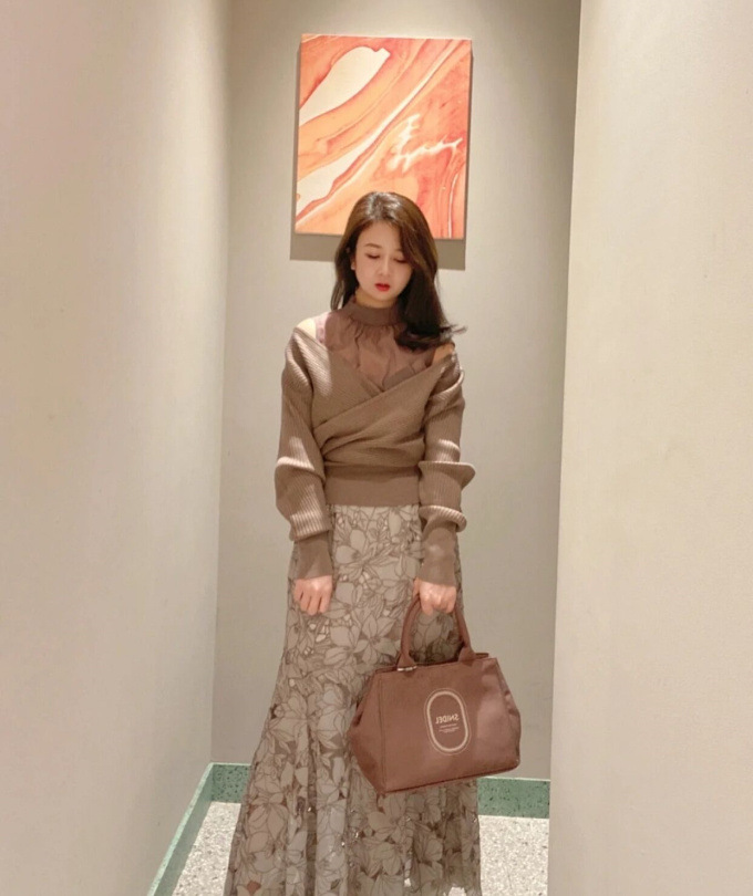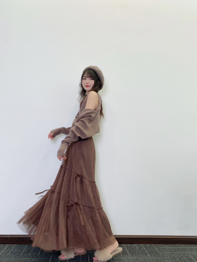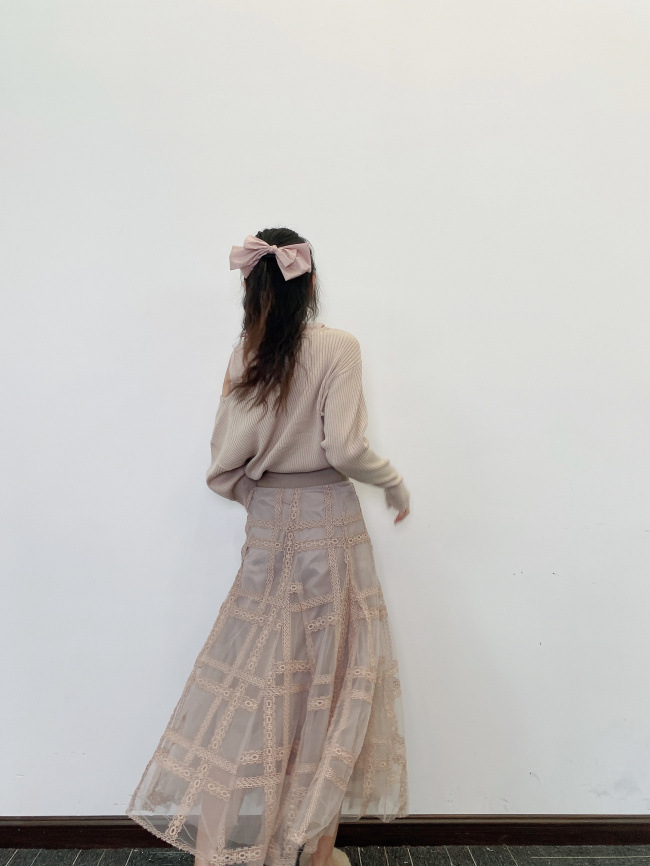 ブラウスには透け感のあるシフォンを、ニットには編み地の映えるやや肉厚の糸を使用しました。アイボリー、ピンクベージュ、モカの3色展開です。