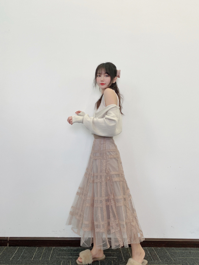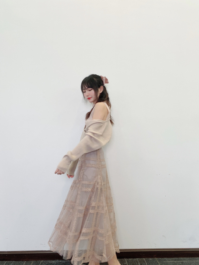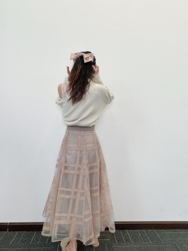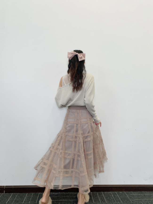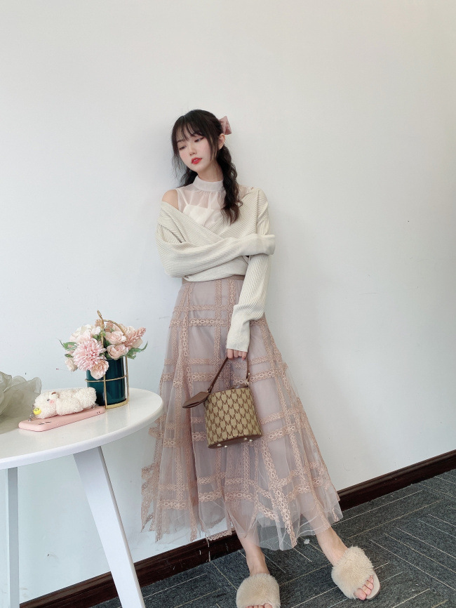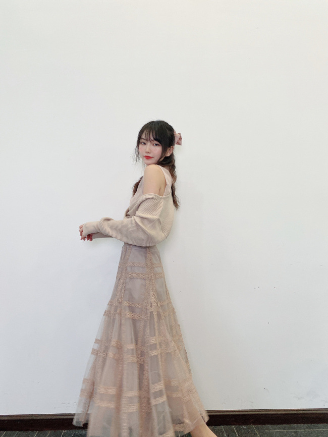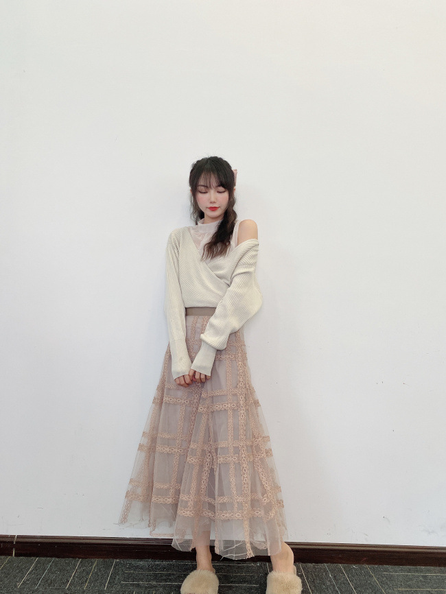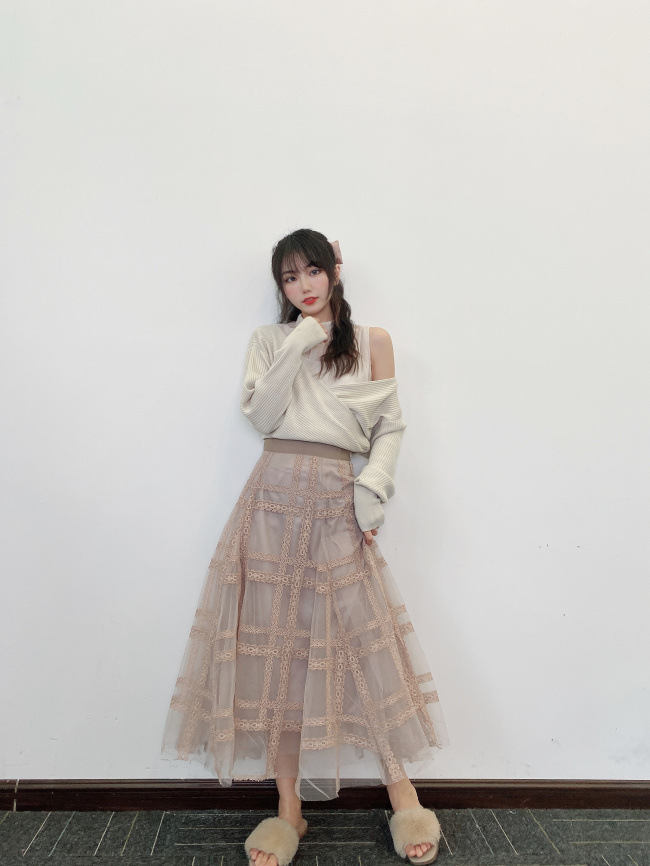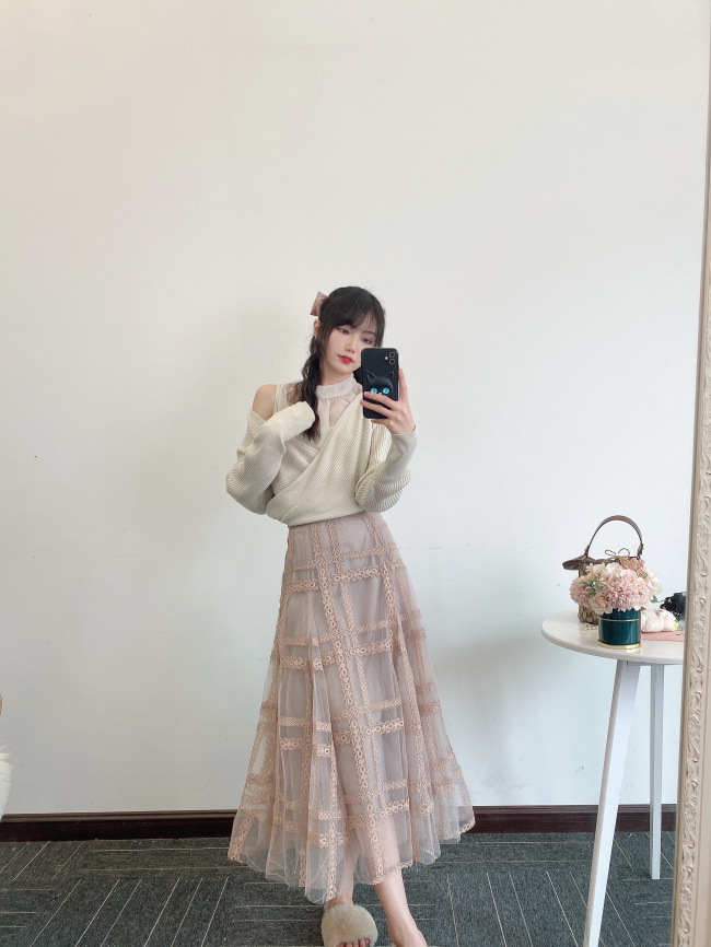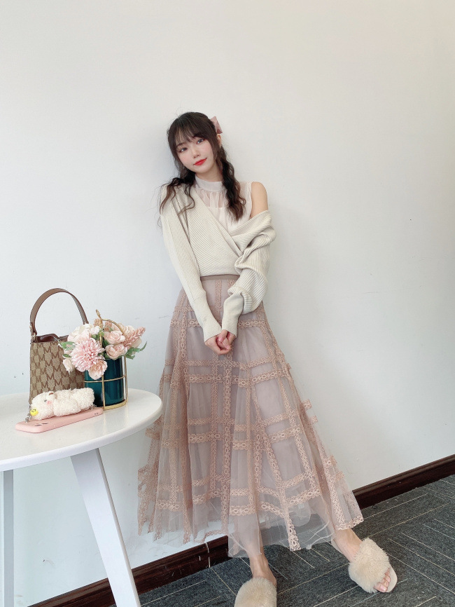 ブラウスには透け感のあるシフォンを、ニットには編み地の映えるやや肉厚の糸を使用しました。アイボリー、ピンクベージュ、モカの3色展開です。