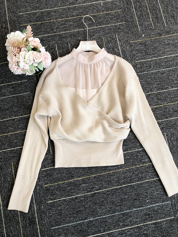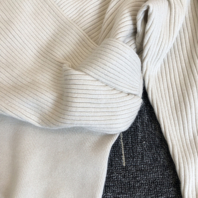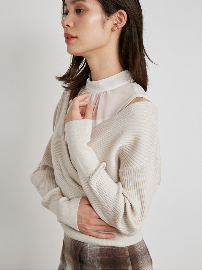 【異素材ミックスが奥行きをもたらすカシュクールレイヤードニット】