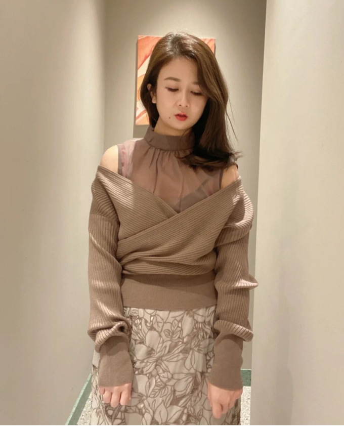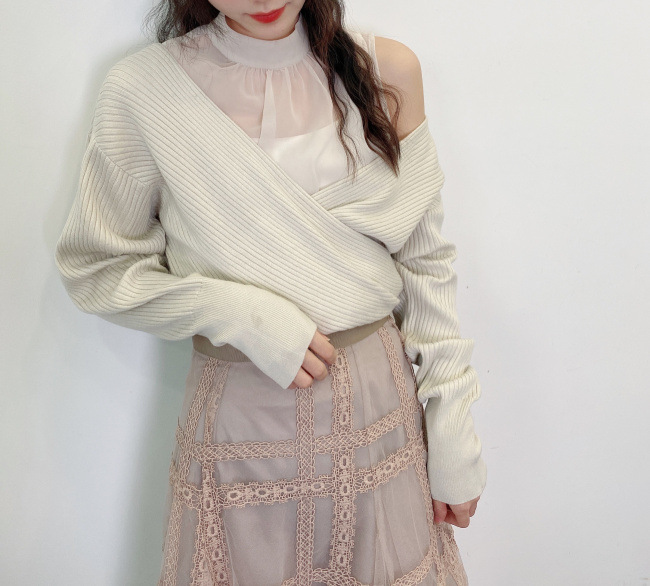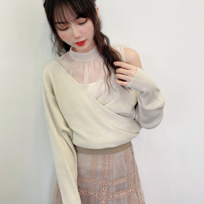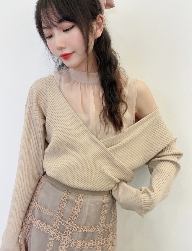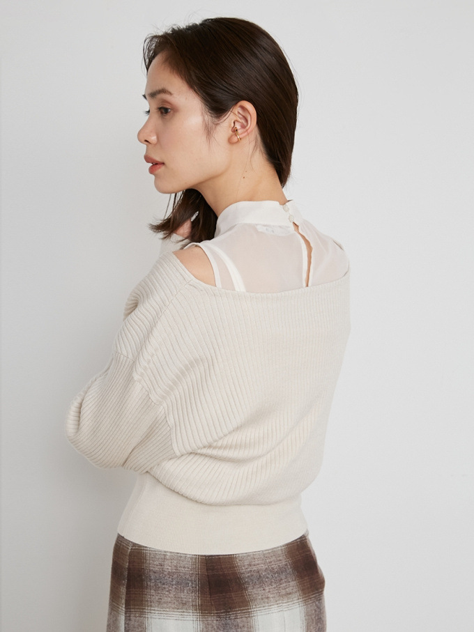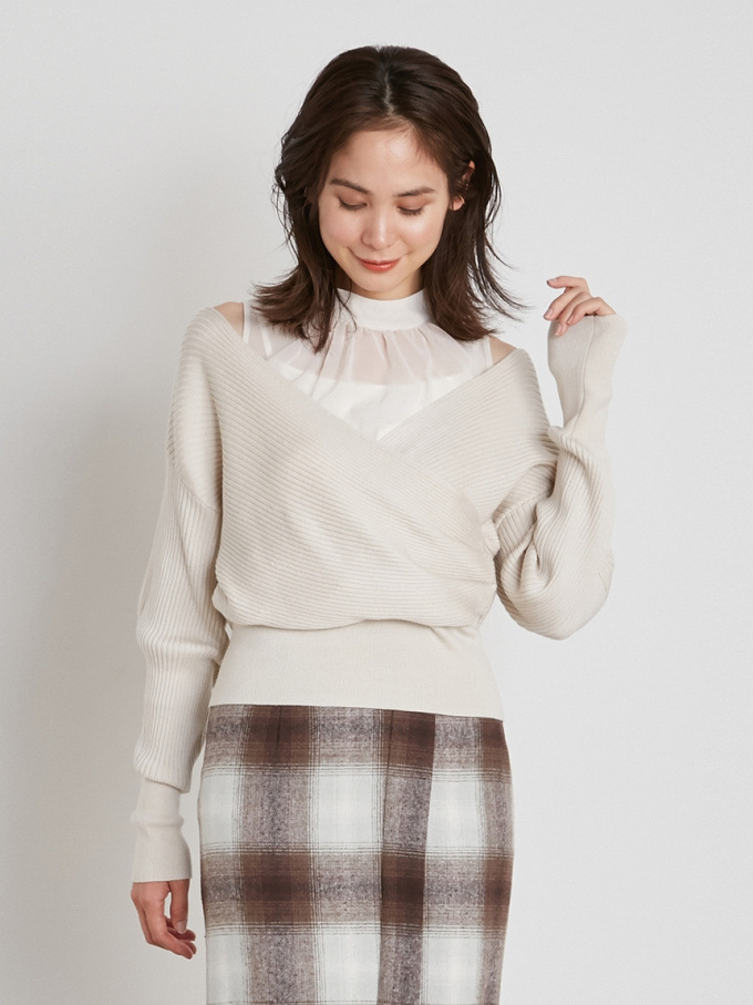 シフォンのノースリーブブラウスにカシュクールニットをレイヤードし、1着にドッキングしたトップス。ニットとシフォンの異なるマテリアル使いが奥行きを醸し、大人なワントーンを更にムードアップさせます。着用すると自然と肩が見え、重たくなりがちな秋冬コーディネートにヘルシーな抜け感をプラス。1枚でコーディネートが完成する優れもので、透け防止のインナーキャミソールがセットになっています。