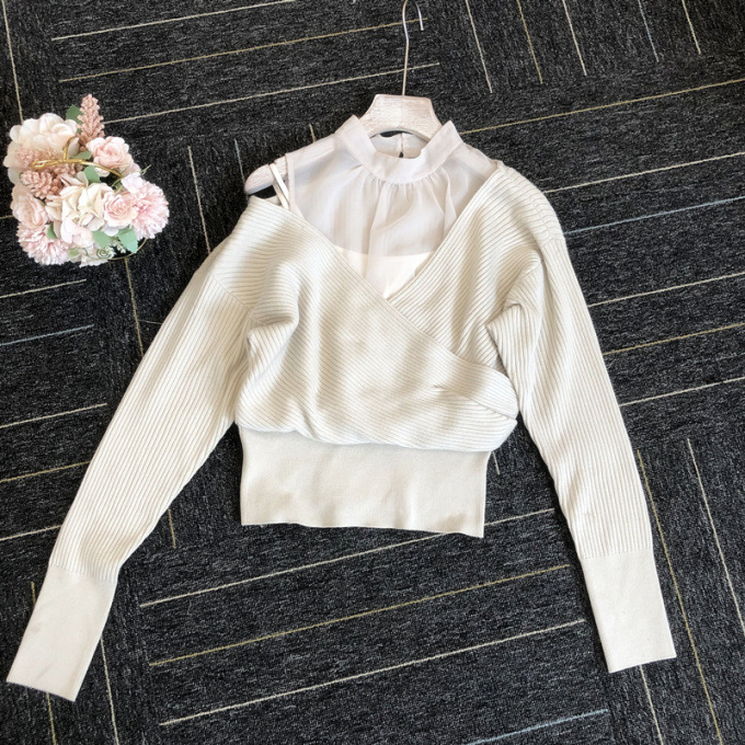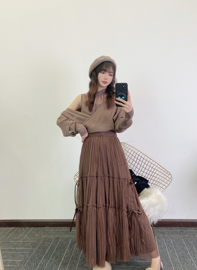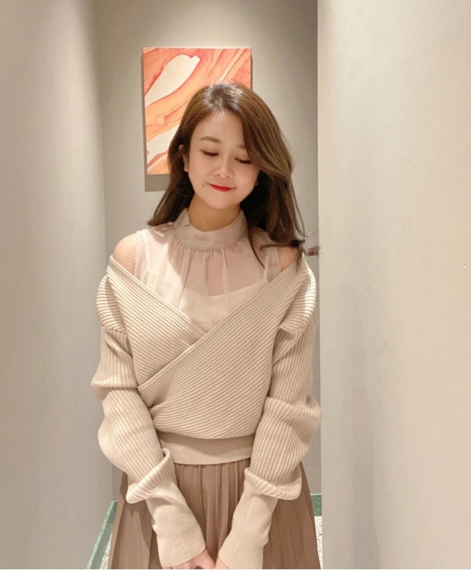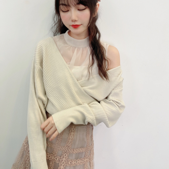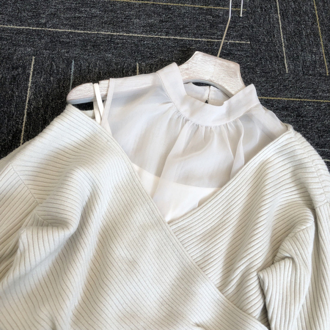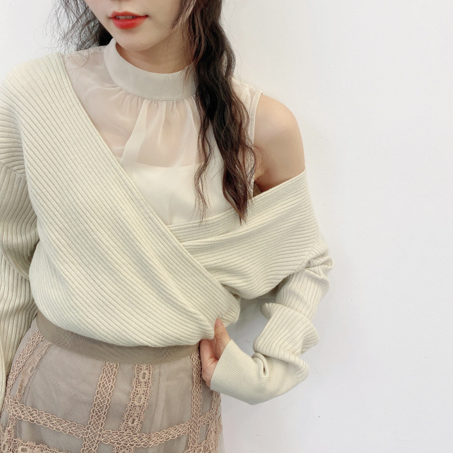 シフォンのノースリーブブラウスにカシュクールニットをレイヤードし、1着にドッキングしたトップス。ニットとシフォンの異なるマテリアル使いが奥行きを醸し、大人なワントーンを更にムードアップさせます。着用すると自然と肩が見え、重たくなりがちな秋冬コーディネートにヘルシーな抜け感をプラス。1枚でコーディネートが完成する優れもので、透け防止のインナーキャミソールがセットになっています。