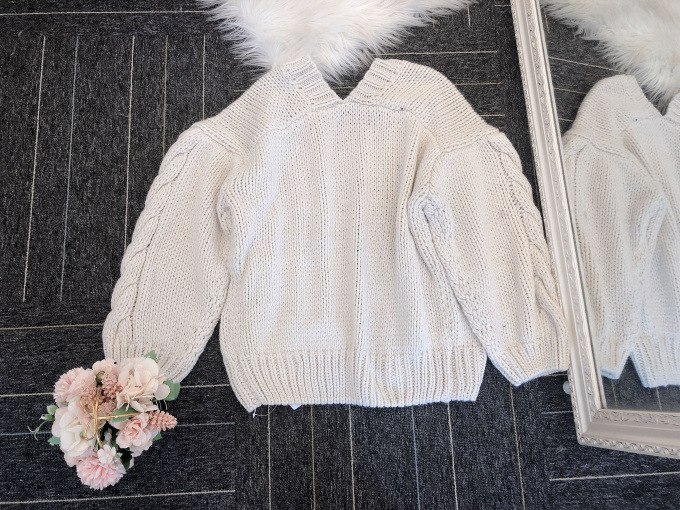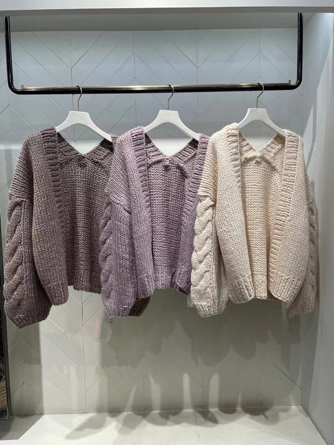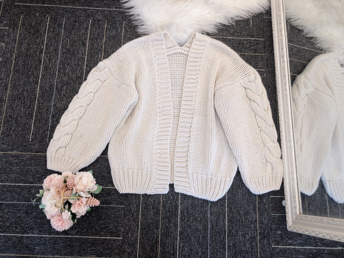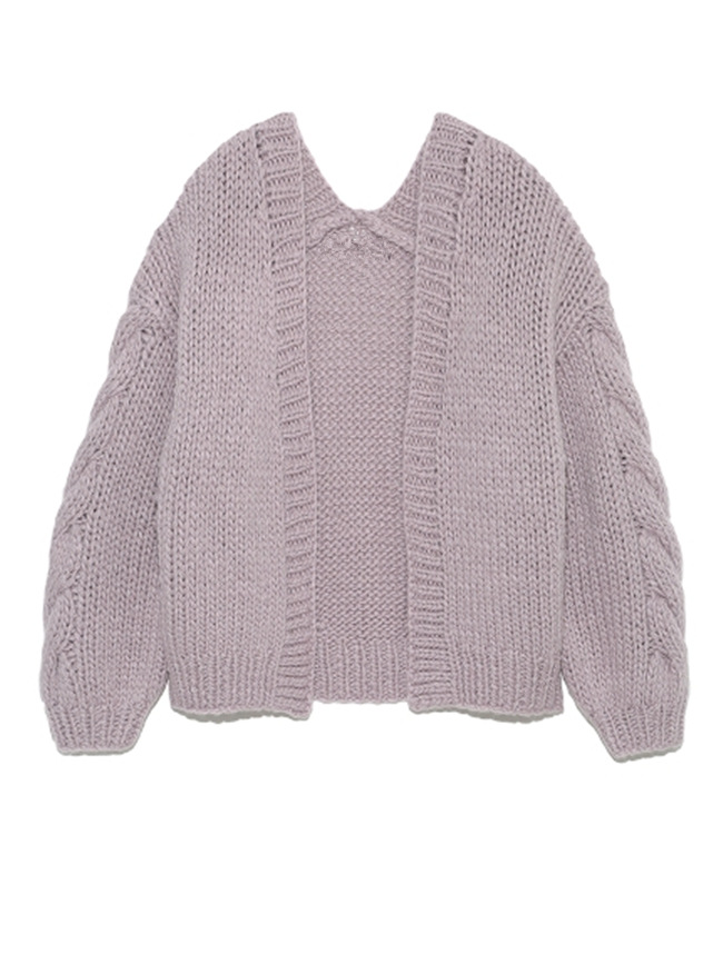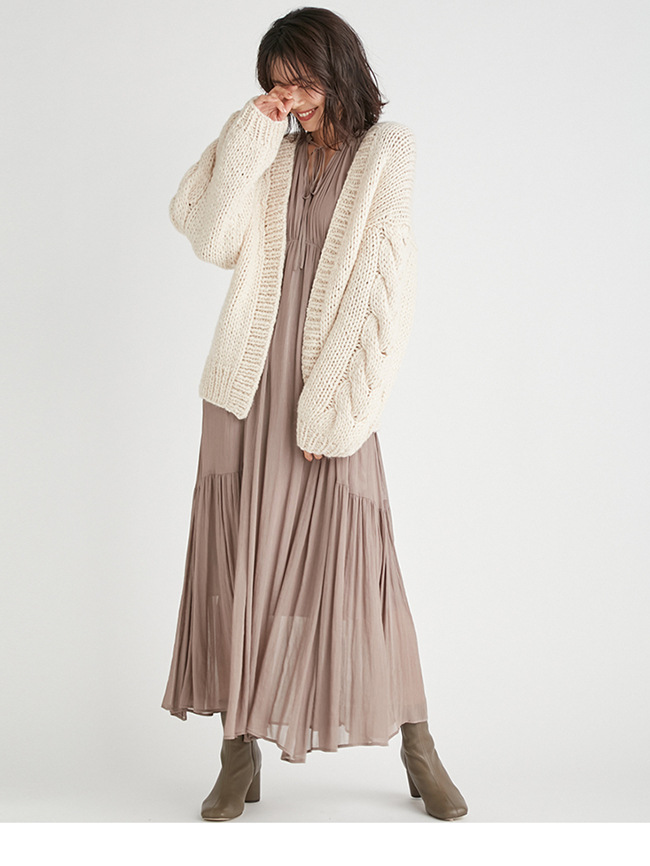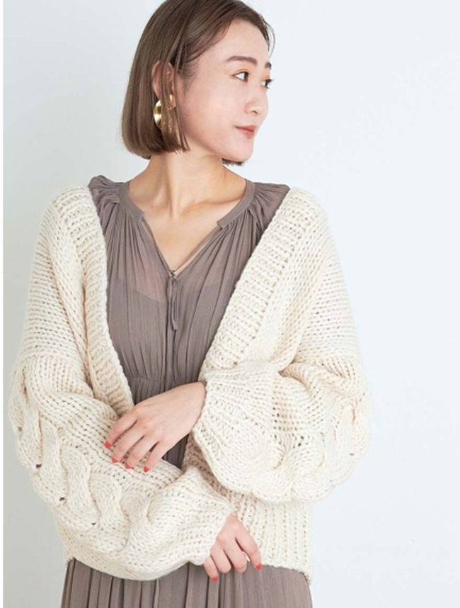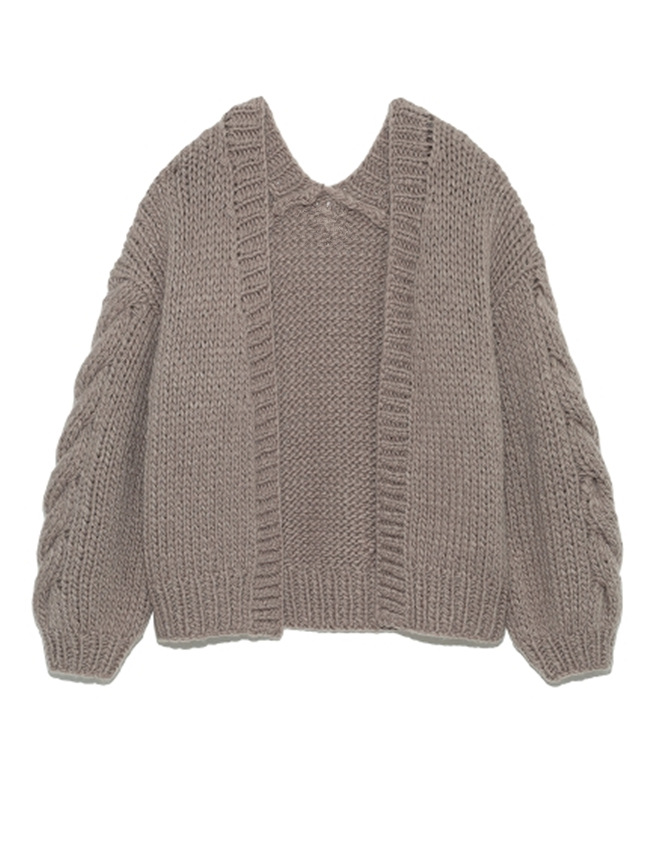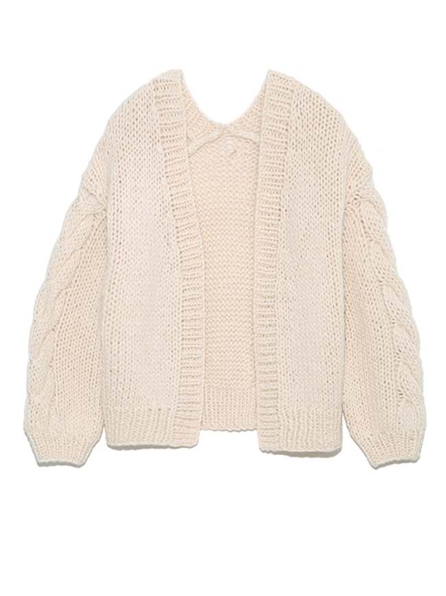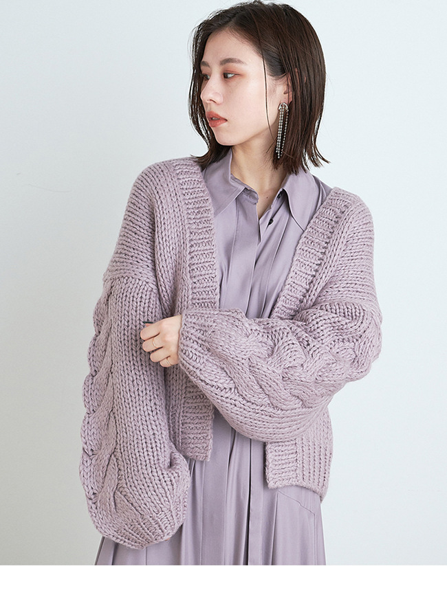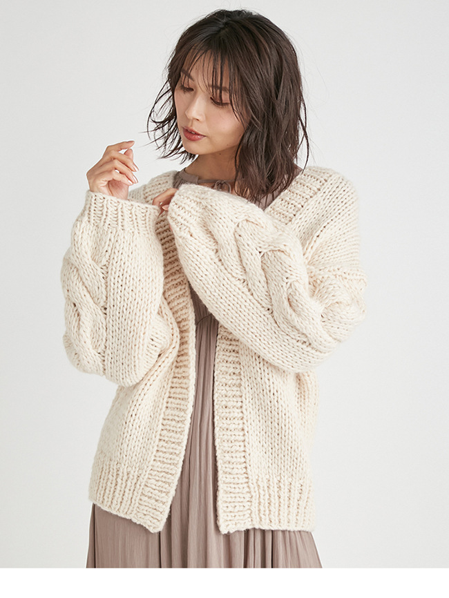 しっかりと肉感がありながらも、肩を落としたデザインとケーブル柄を施したスリーブライン、ボタンレスの着流しデザインでゆったりとしたストレスフリーな着心地です。