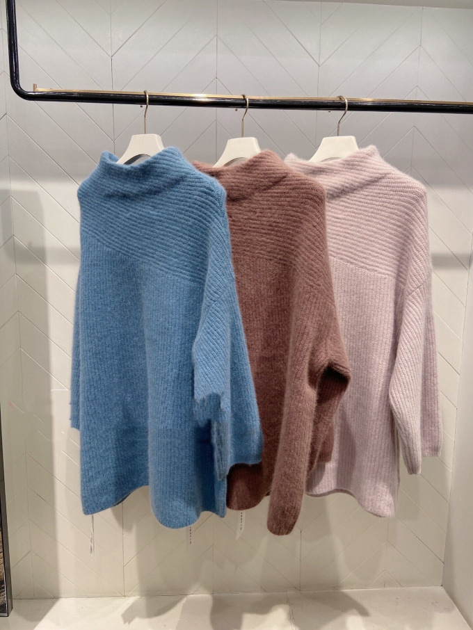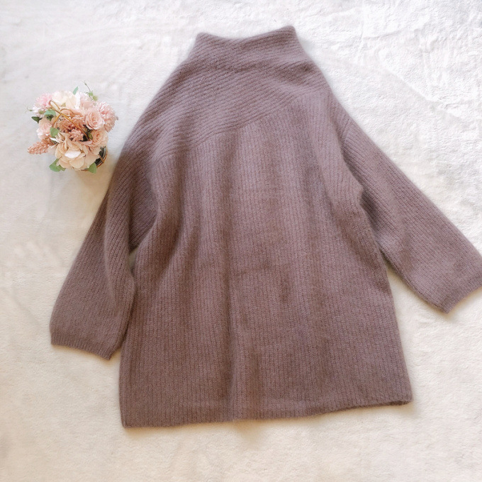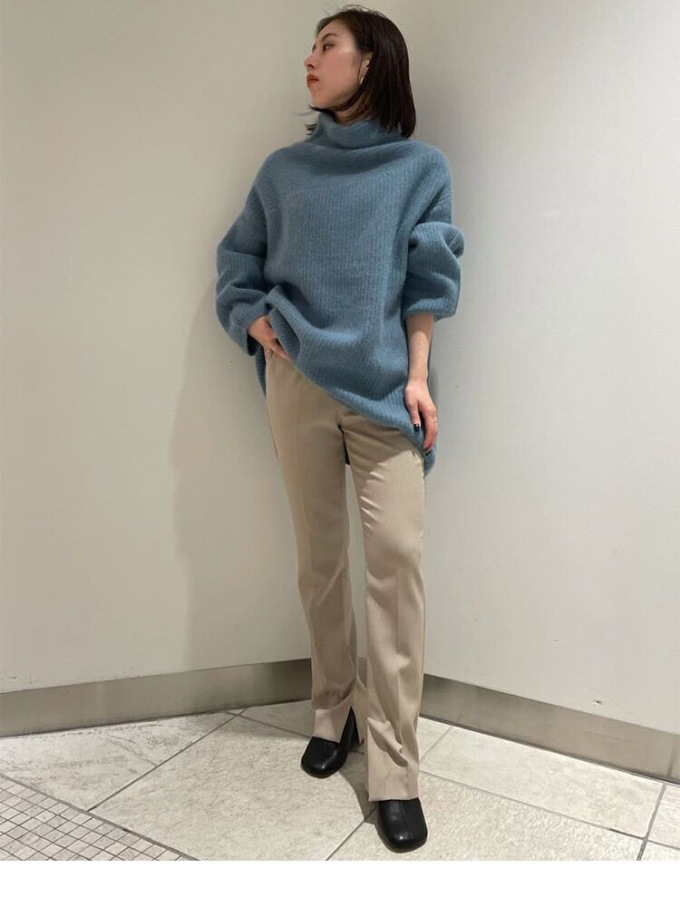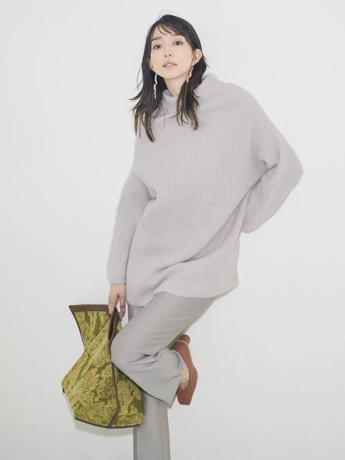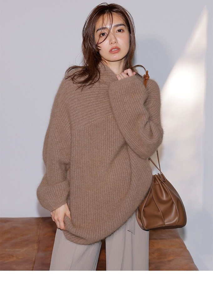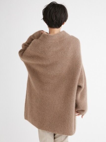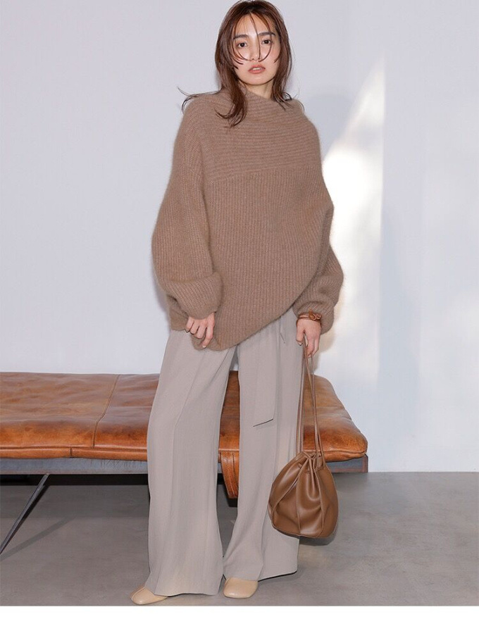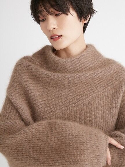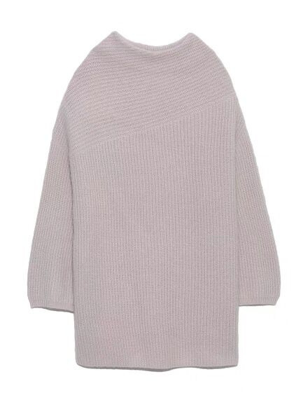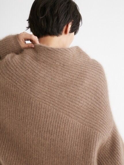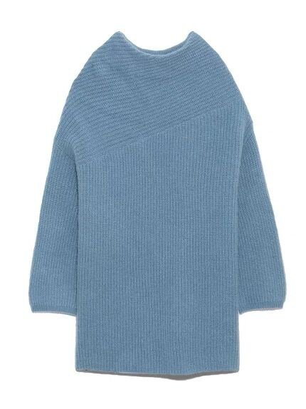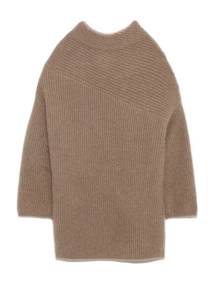 肩の付近で斜めにシームを入れて、編み方向に変化をつけたアシンメトリーなデザインでモード感高まる装いに。