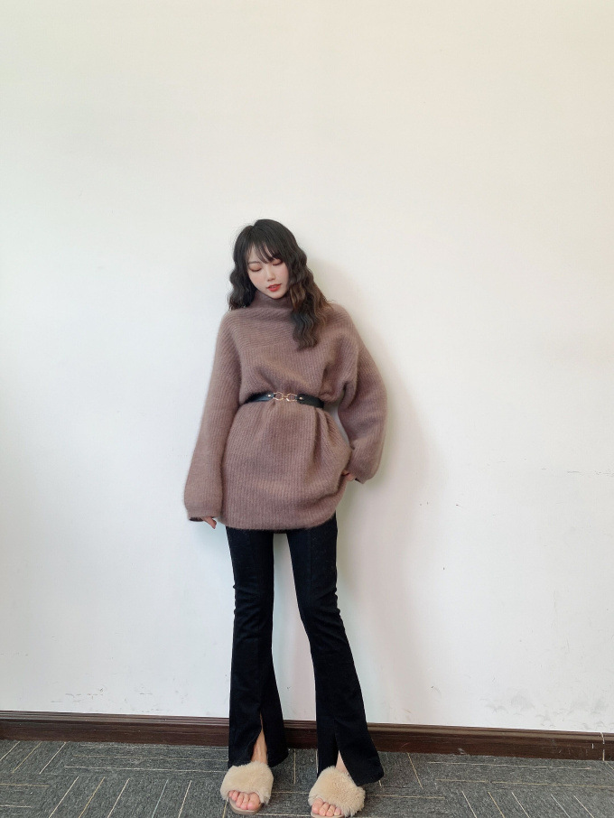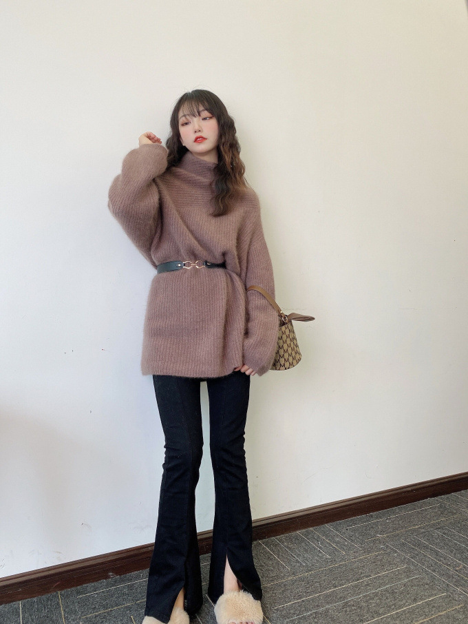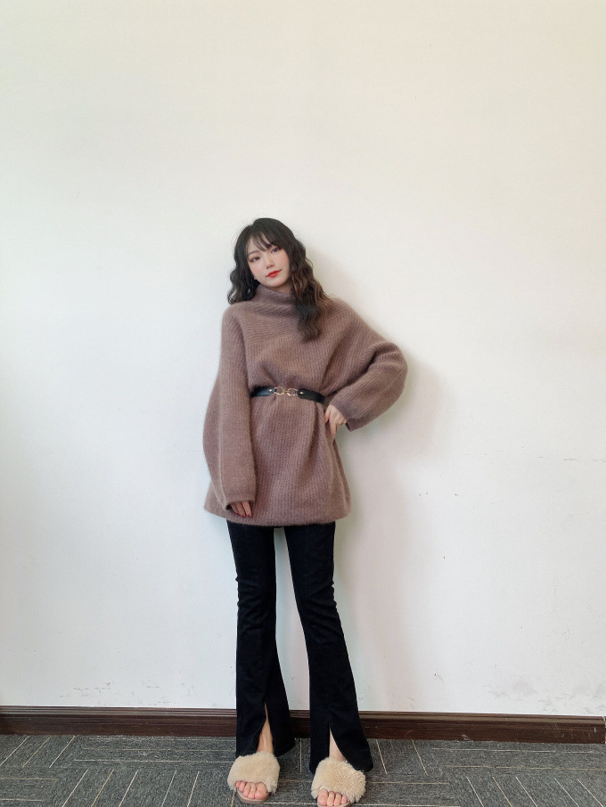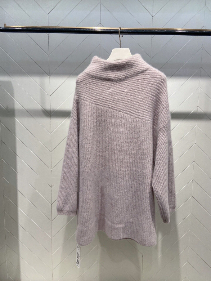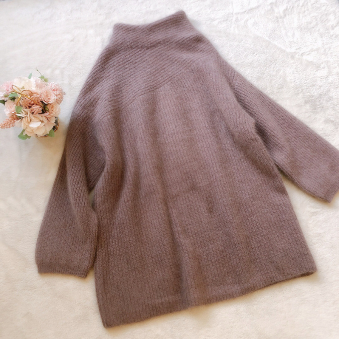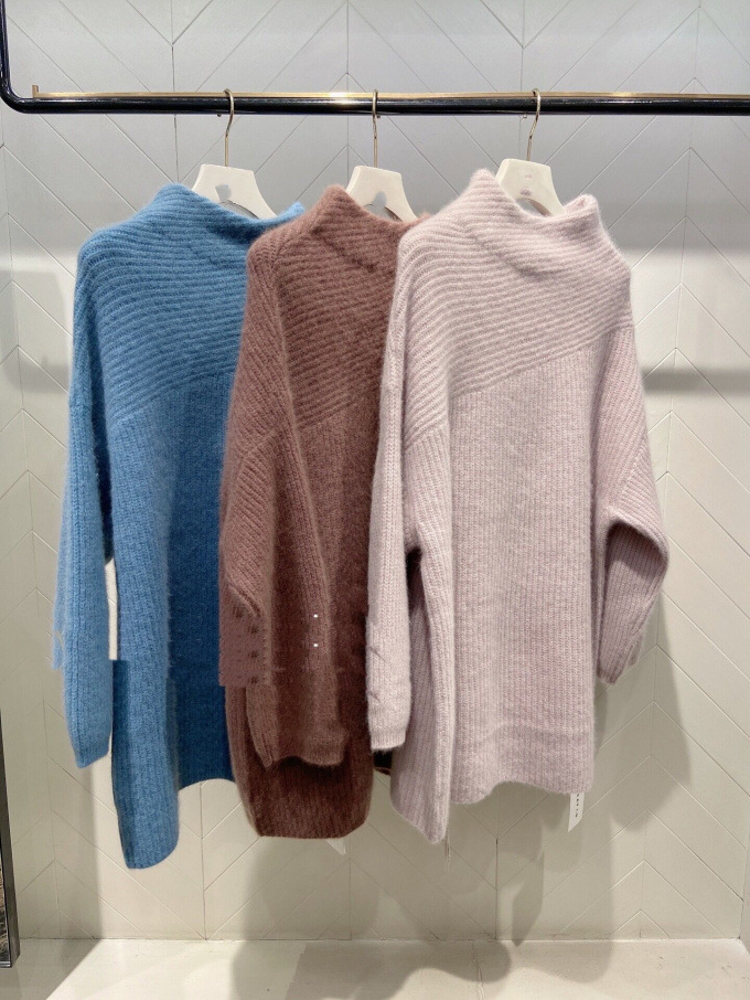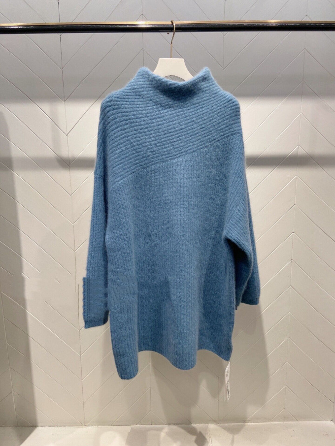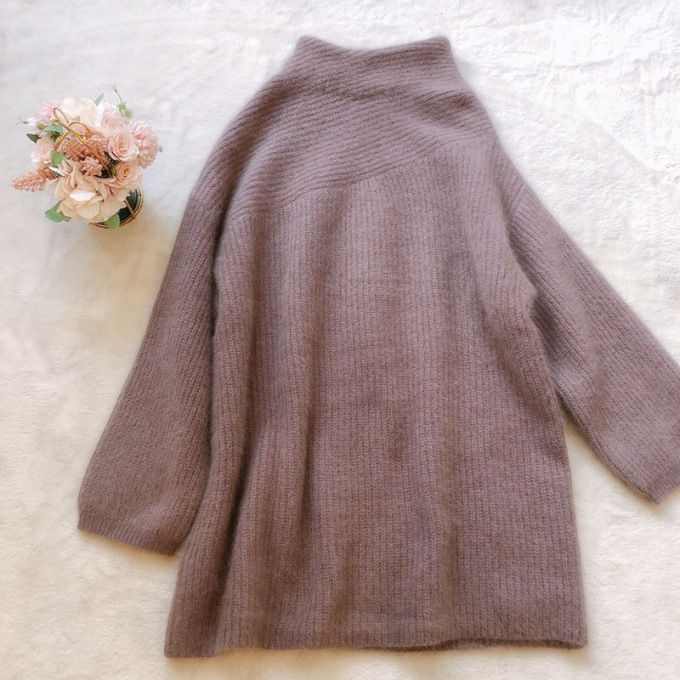 肩の付近で斜めにシームを入れて、編み方向に変化をつけたアシンメトリーなデザインでモード感高まる装いに。