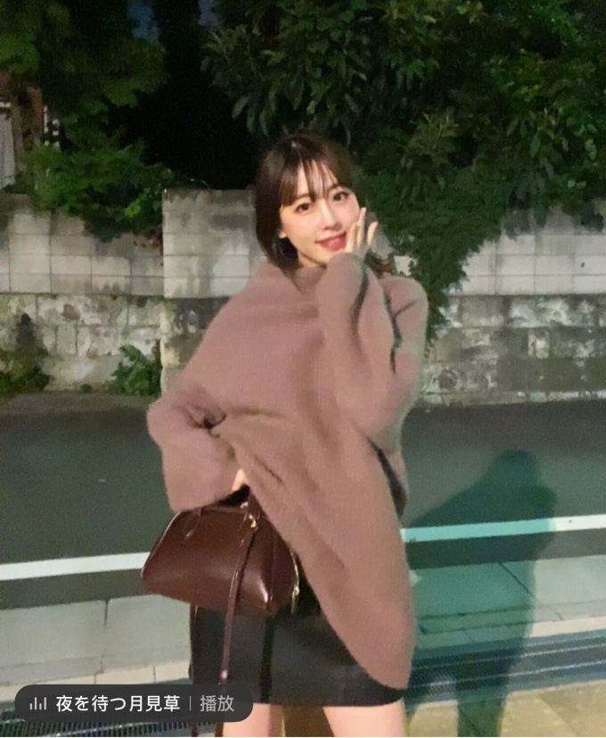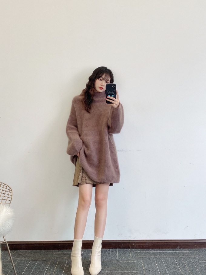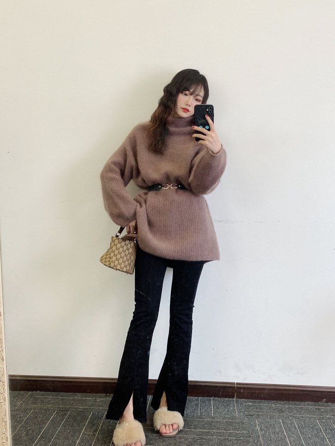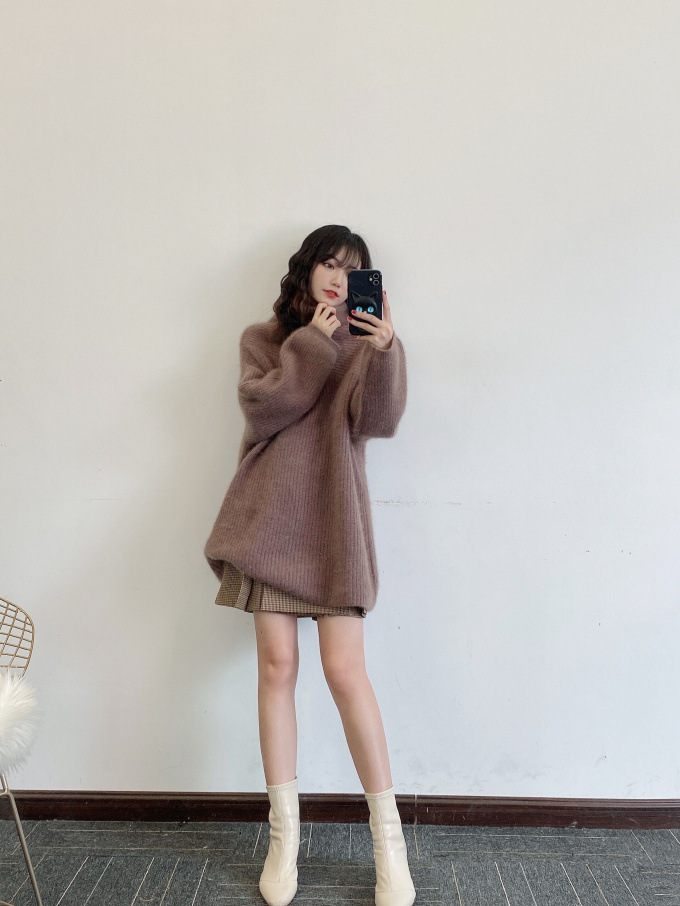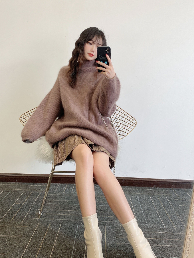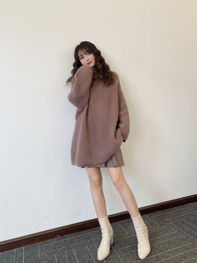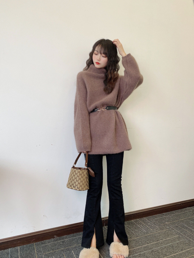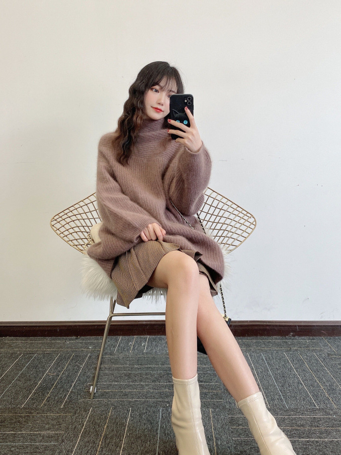 肩の付近で斜めにシームを入れて、編み方向に変化をつけたアシンメトリーなデザインでモード感高まる装いに。