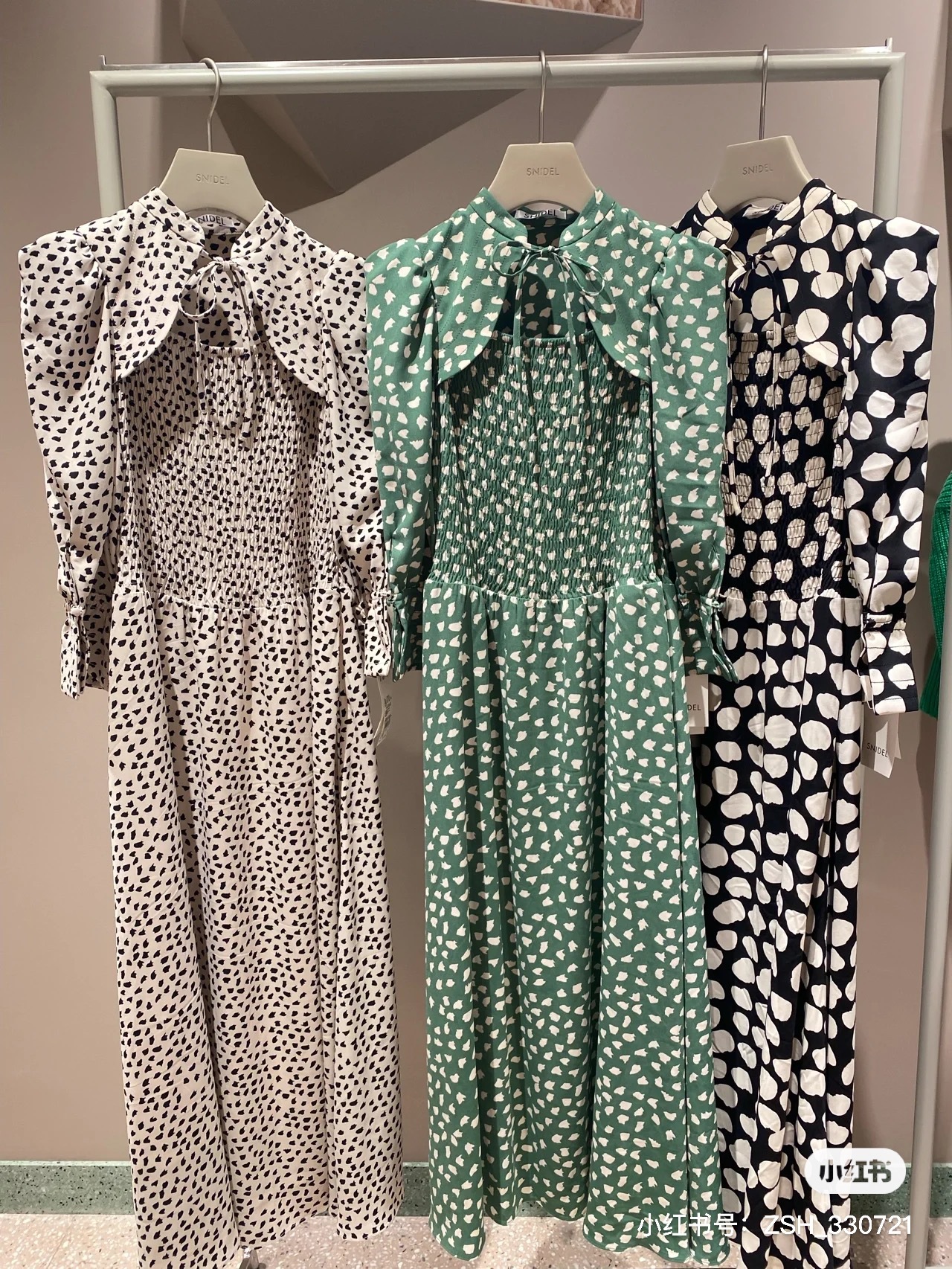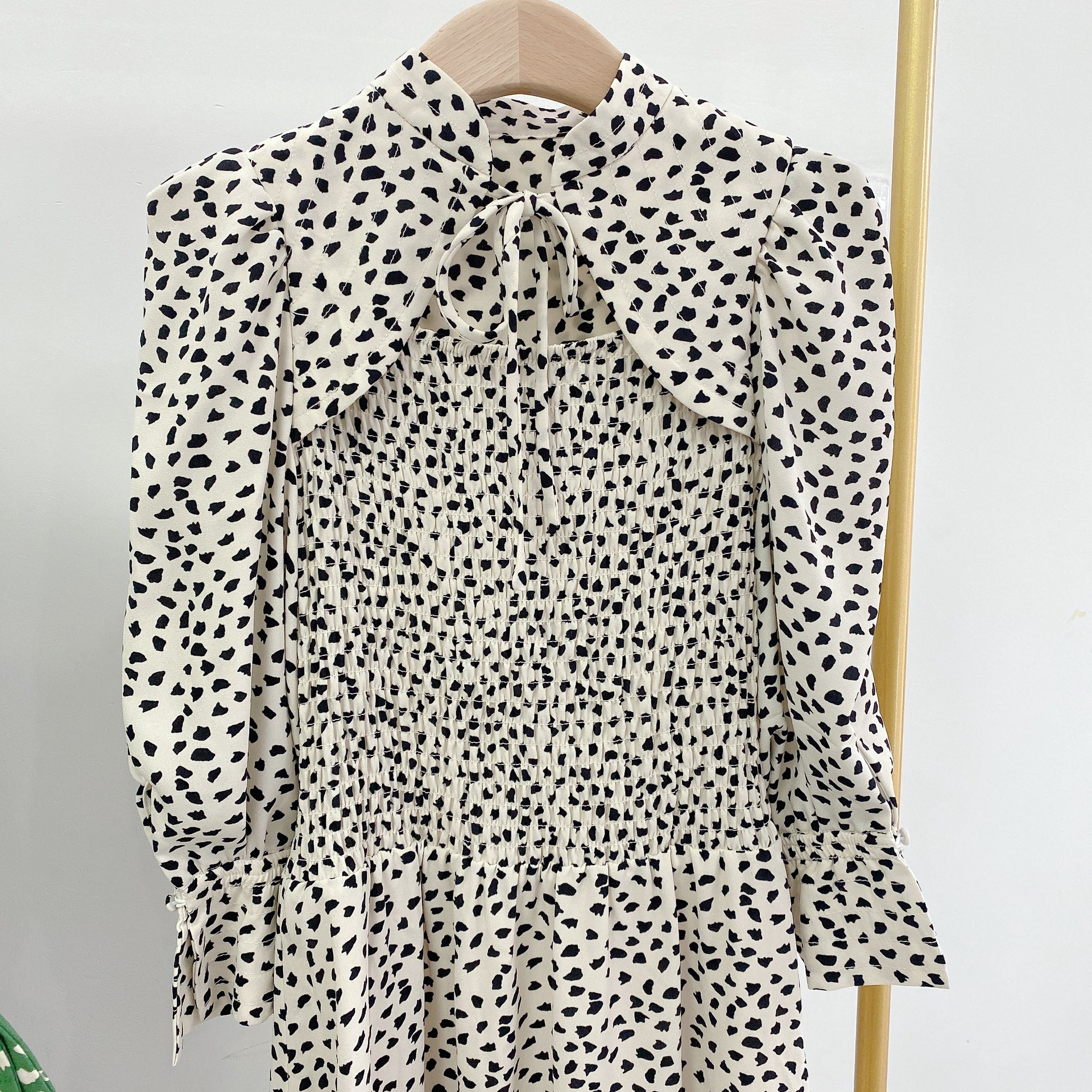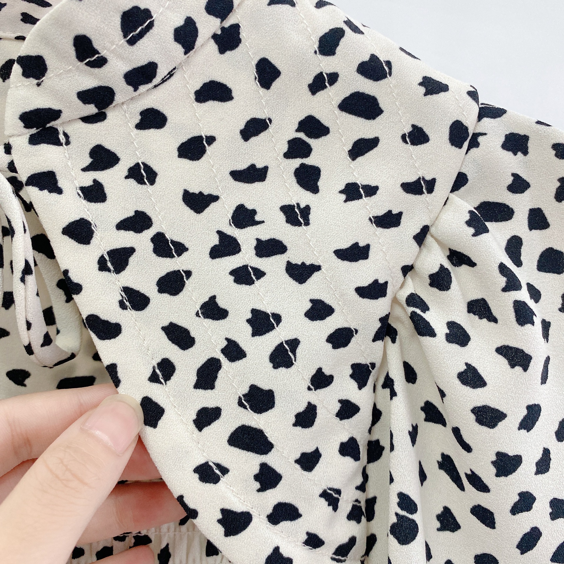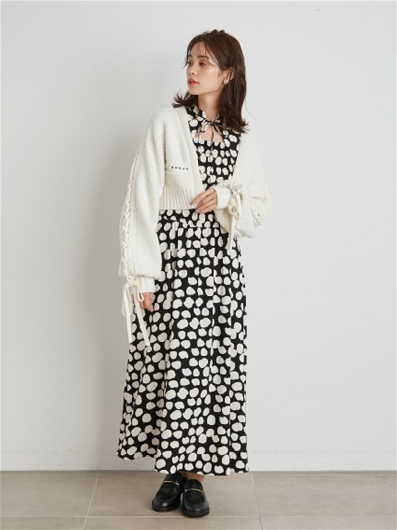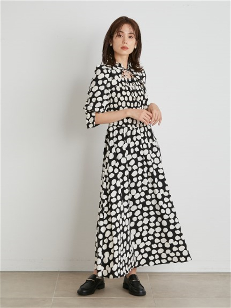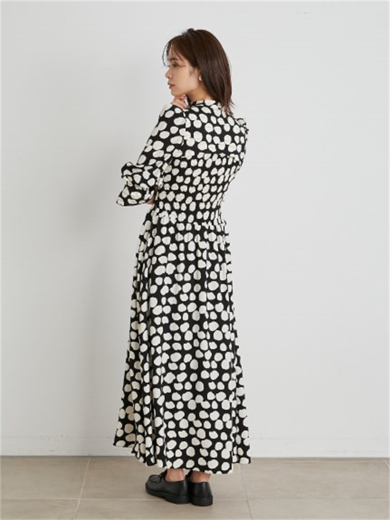 軽やかなジョーゼット生地を使用しました。印象の違いが楽しめるランダムドットはアイボリー、グリーンが同じ柄でサイズ違い、ブラックはアーティーな大きめドットの3色展開です。