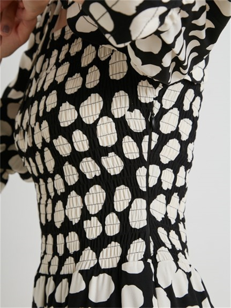 大胆なデコルテラインのカッティングに、女性らしさが漂うプリントワンピース。柔らかなジョーゼット生地にランダムドットをプリントし、トレンド感と大人っぽさを表現しました。美しいデコルテラインを強調するカッティング、華やかかつモードなパフスリーブ、身体の線をきれいに魅せる身頃のシャーリングなど、細部にまでこだわった「SNIDEL」らしいフェミニンなディティールが自慢です。スカート部分は程良いナローシルエットで落ち着きがあり、メリハリを効かせたラインでスタイルアップも叶えました。