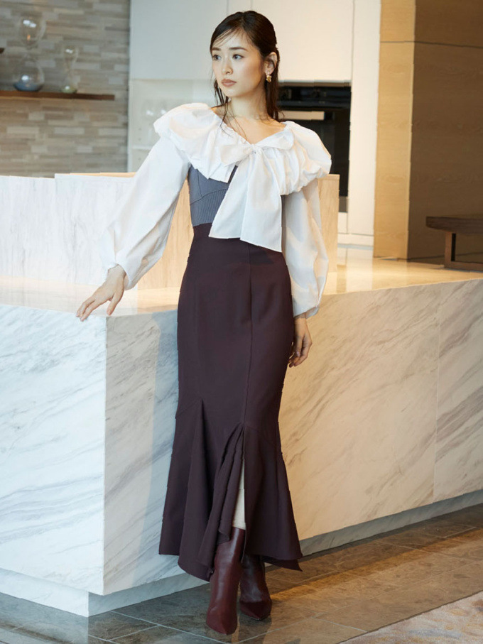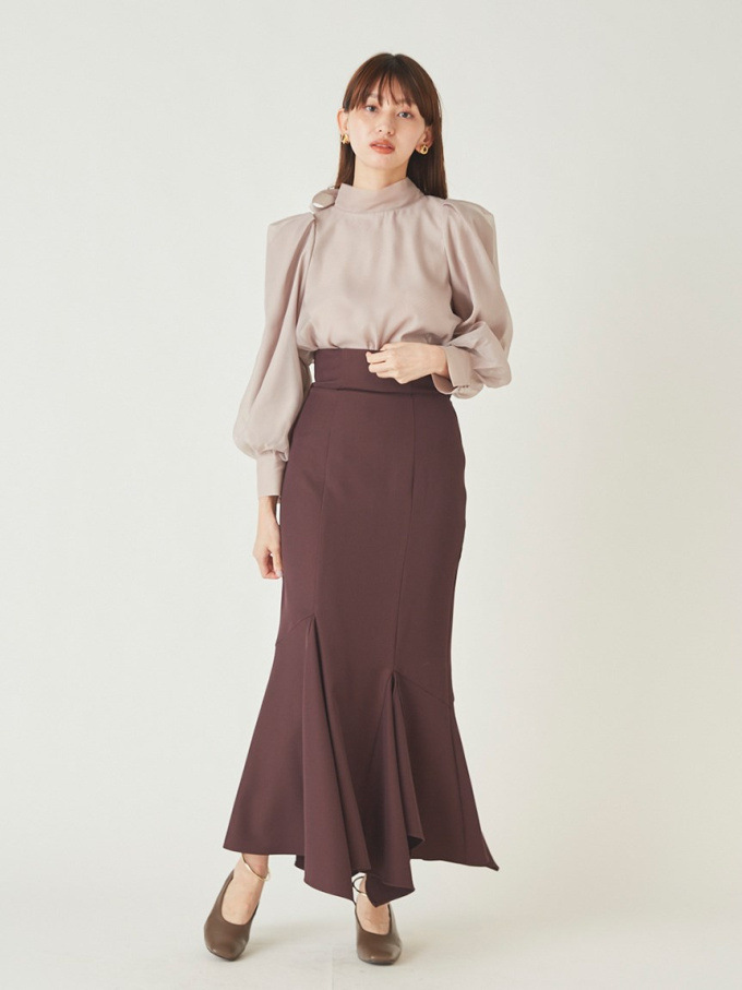 エレガントムードが加速する、トレンドのマーメイドスカート。高さ違いに入れた大きなマチやイレギュラーヘムで、モードなエッセンスを加算しました。左足には深めのスリットをあしらい、動く度に肌が覗き色香ある印象に。ウエスト周りはシンプルに仕上げ、ボリュームトップスを合わせてもすっきり着ていただけます。