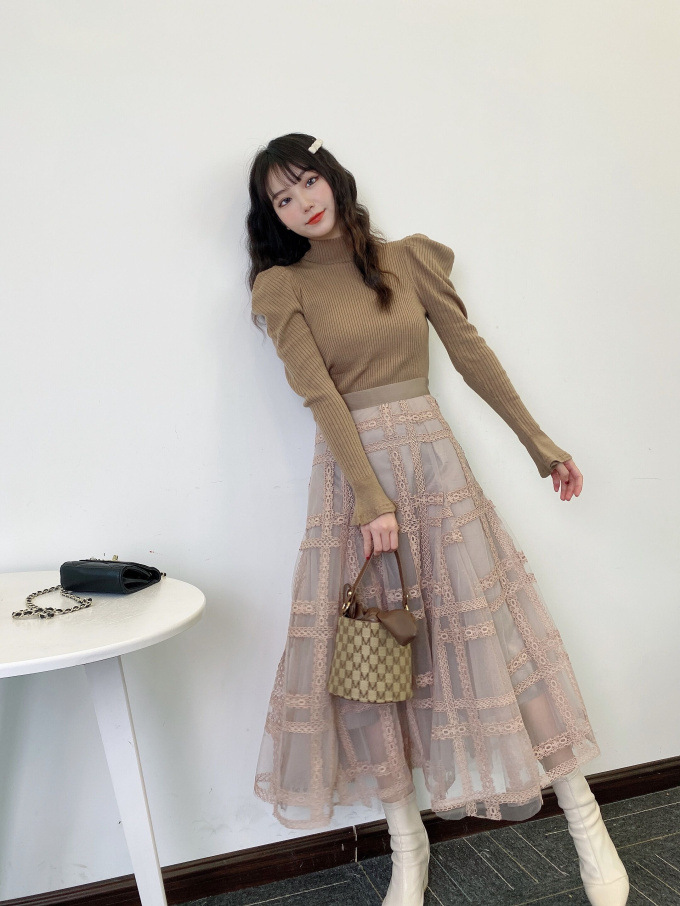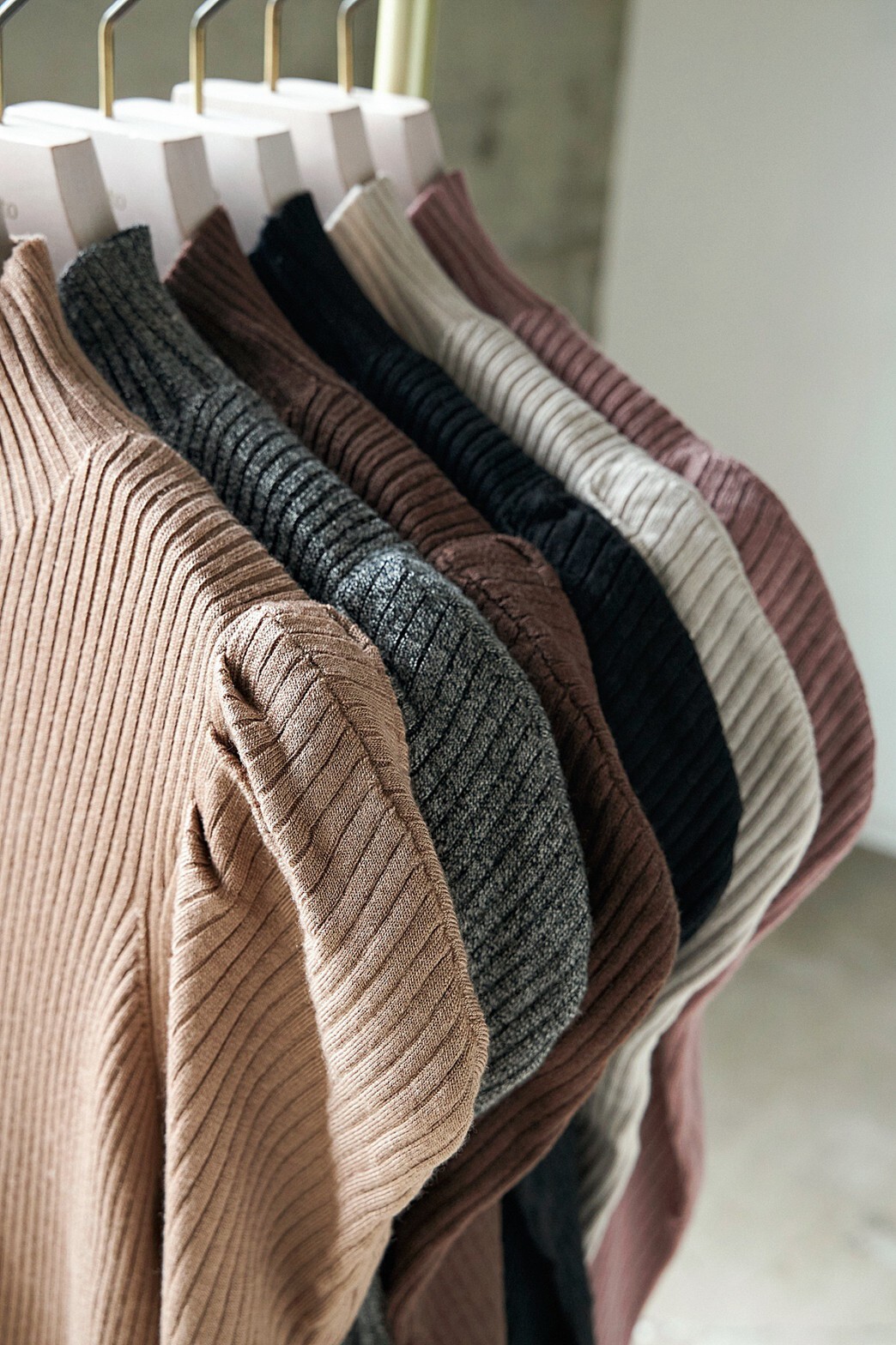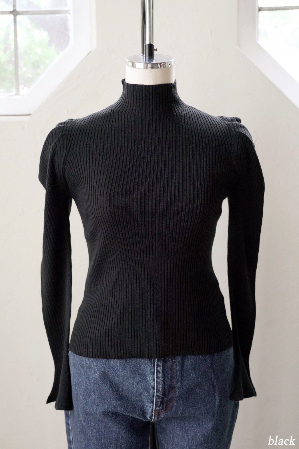 表情豊かなリブと、袖に施されたフレアが女性らしいフェミニンな印象を与えます。