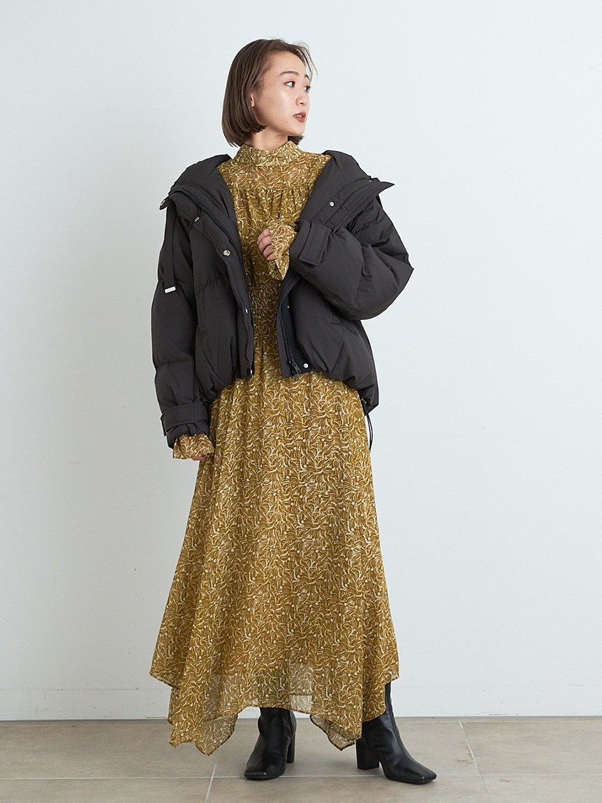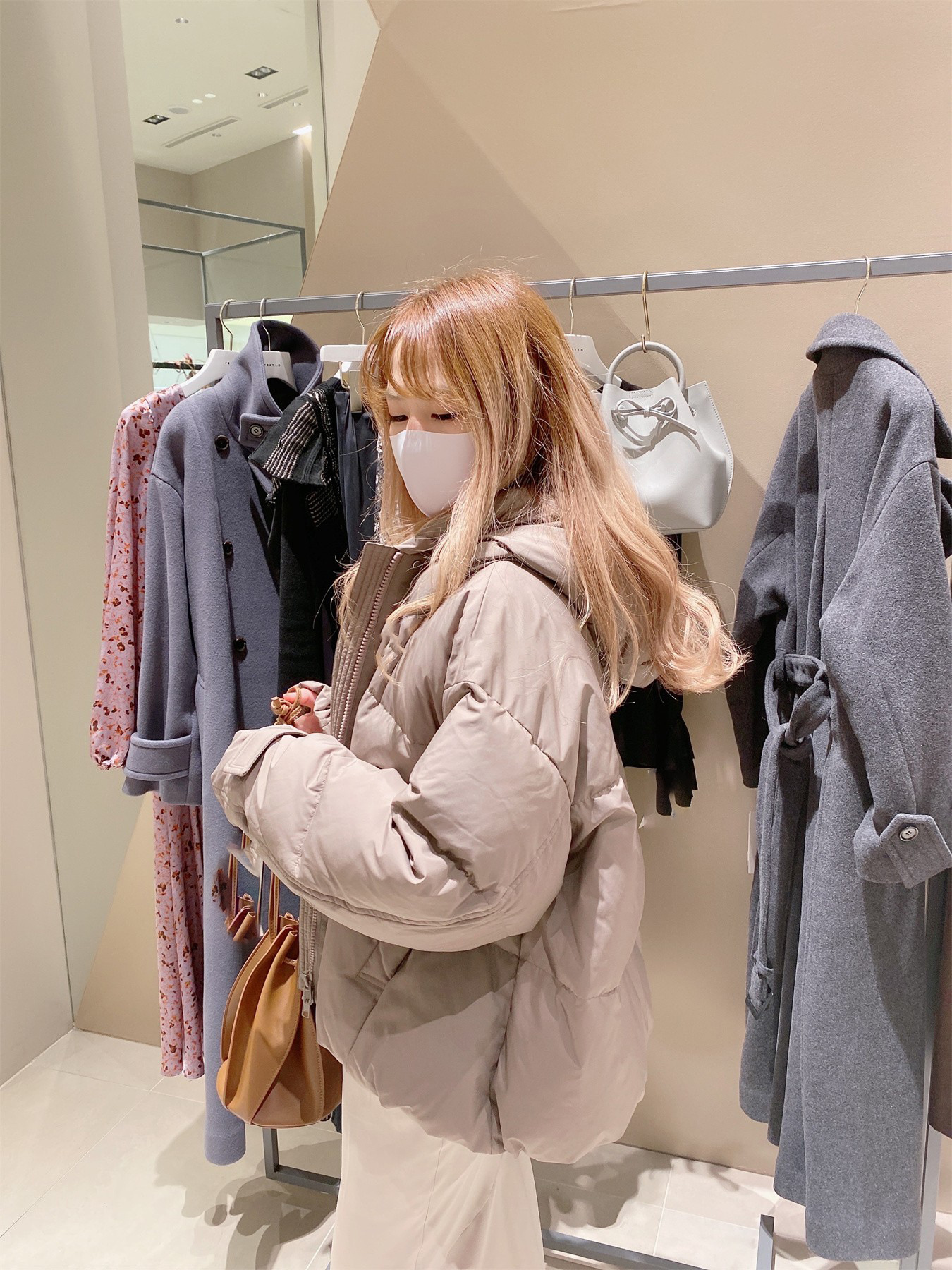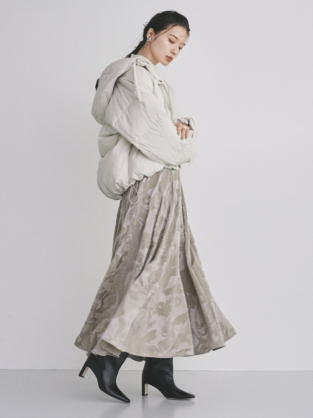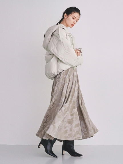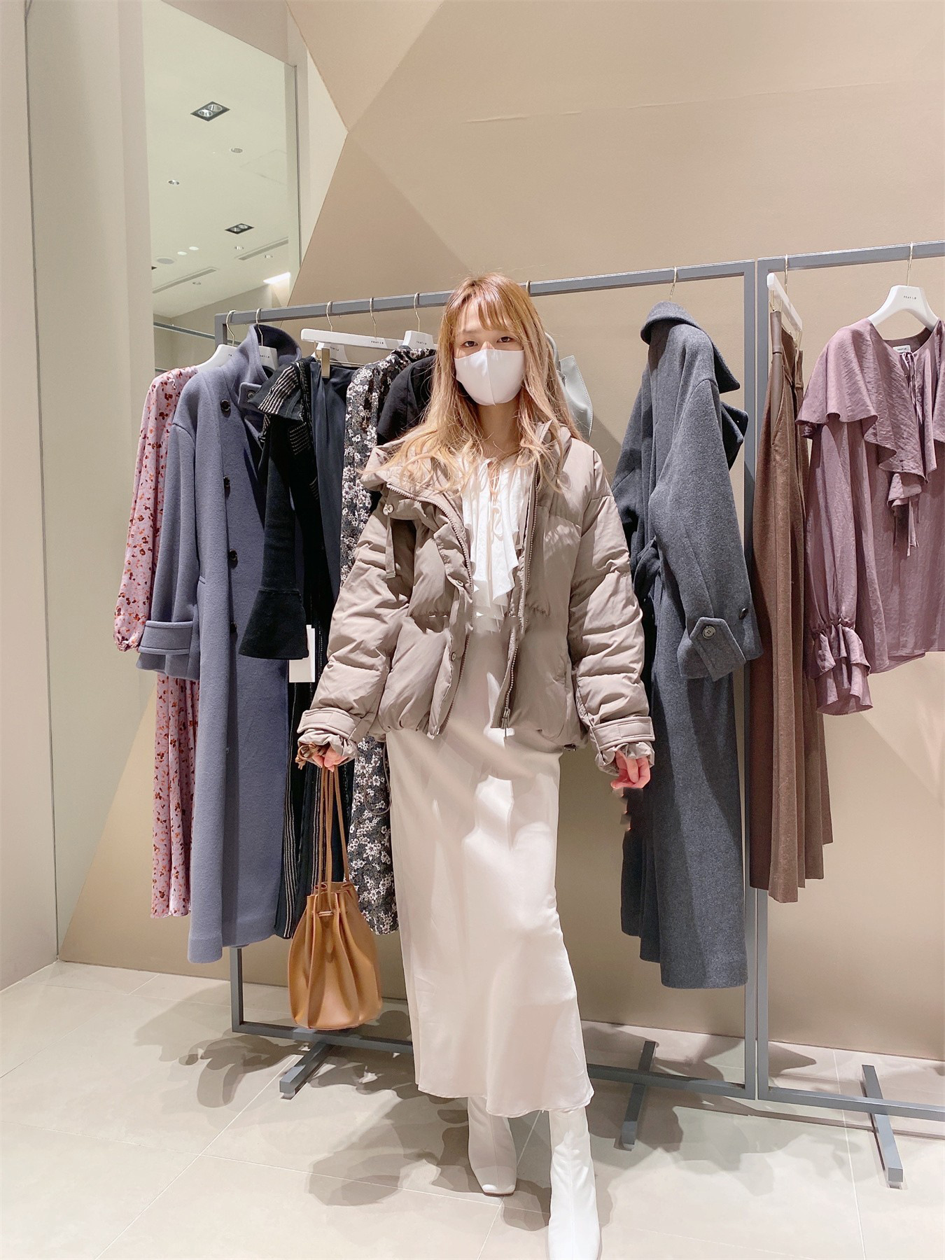 女性らしく着こなせるフード付ショートダウンジャケットは、身頃で斜めにあしらったステッチやフードのリボンをポイントにしたFRAY I.Dらしいデザインに仕上げています。