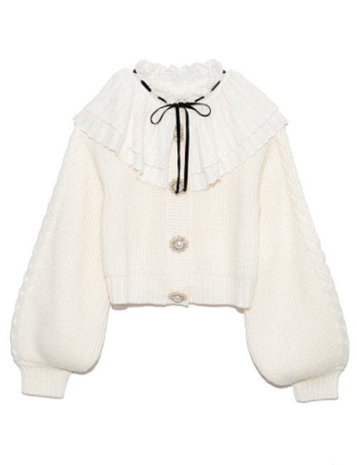 配色のベロアリボンをあしらったダブルカラーがクラシカルなニットカーディガン。ギャザーを寄せてフリルを作り、フェミニンな印象に仕上げました。ジュエリーのようなパールボタンで華やかさをプラスし、ふんわりとしたボリュームスリーブにはケーブル柄を入れ、表情の違いを楽しめるデザインに。デイリーに活躍するアイテムなのでスカートは勿論、あえてデニムに合わせてカジュアルダウンしたスタイリングもおすすめです。