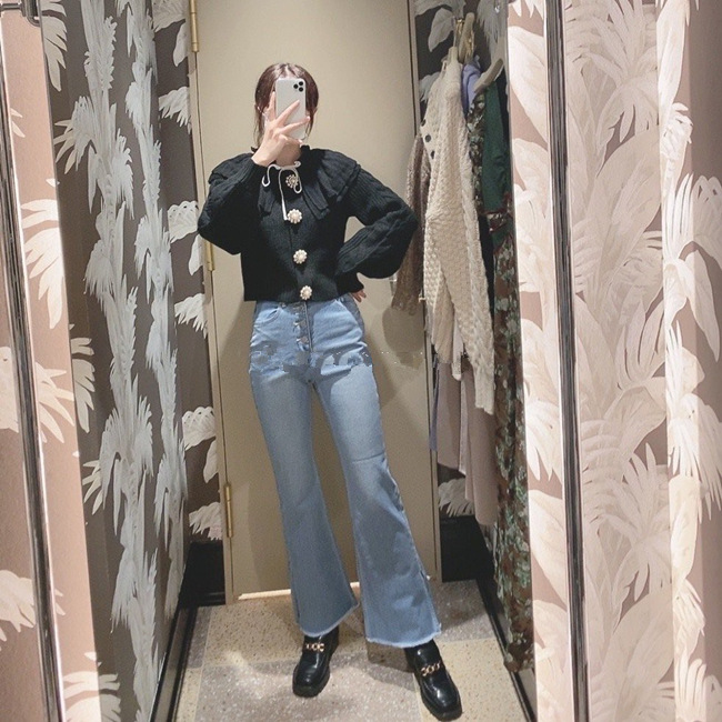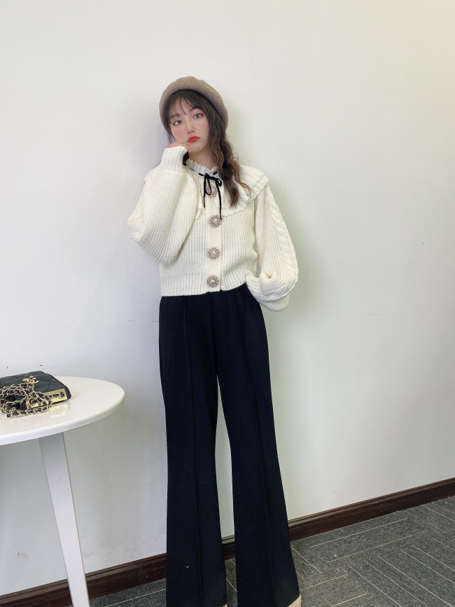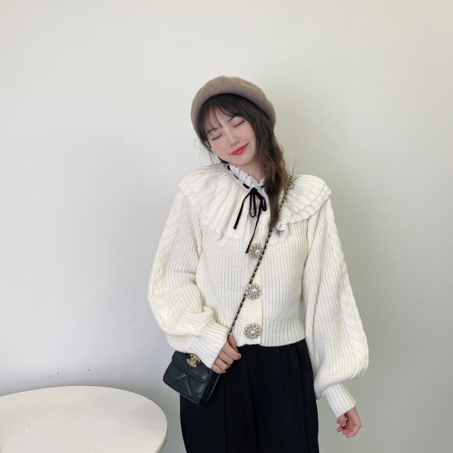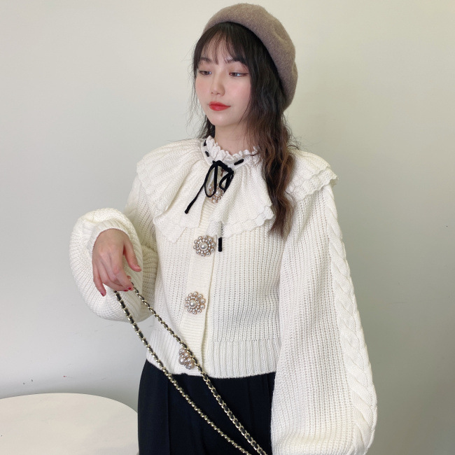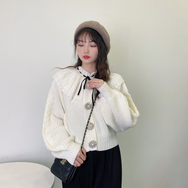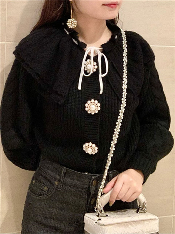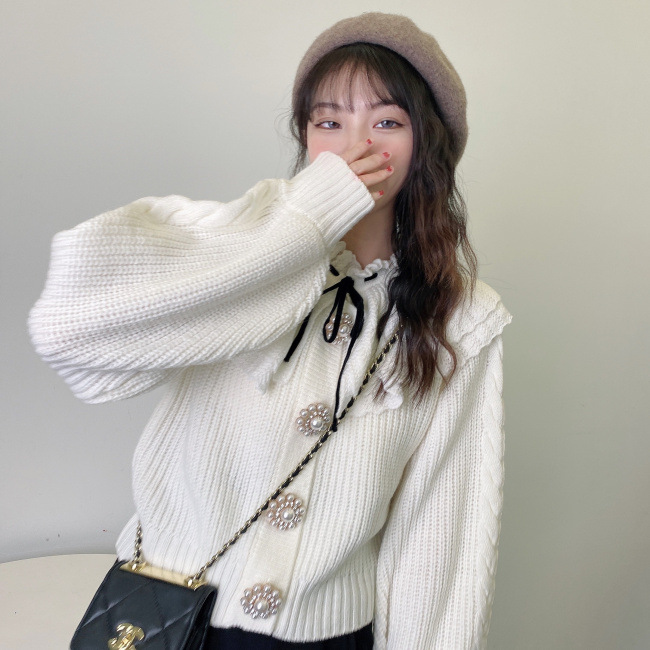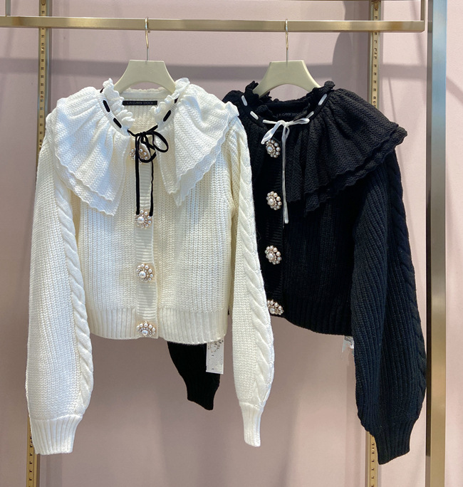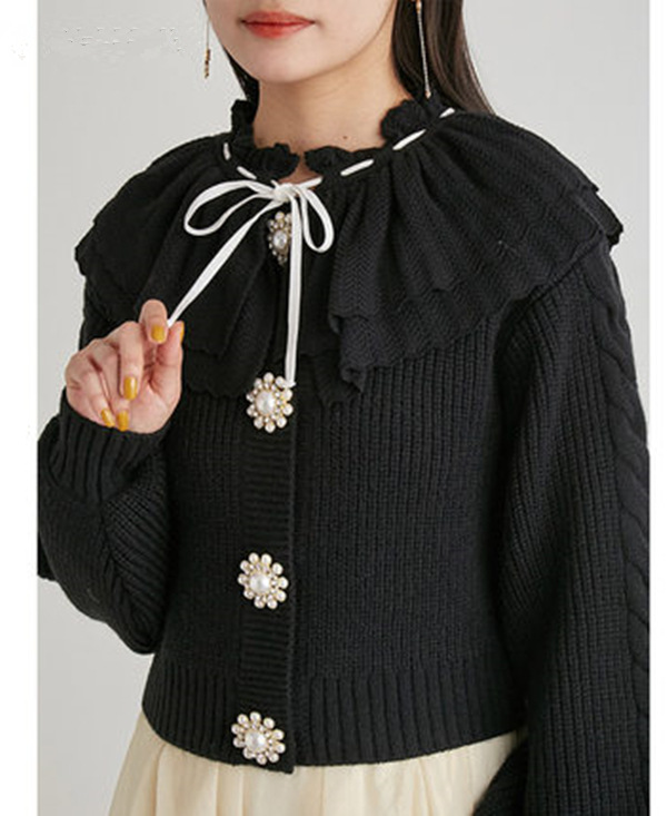 【リュクスなパールボタンに存在感のあるダブルカラーが目を引くニットカーディガン】